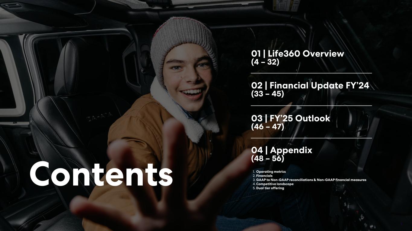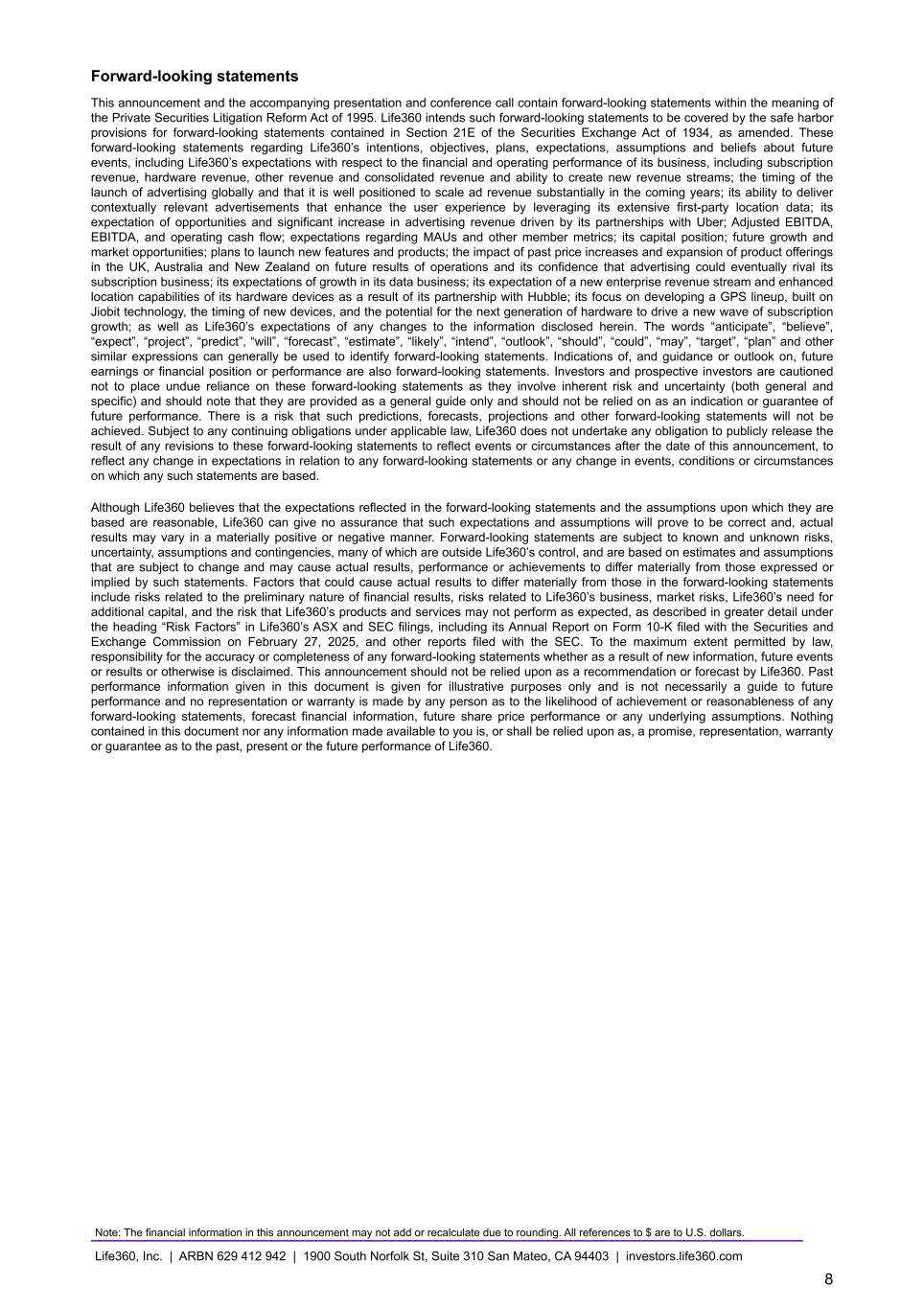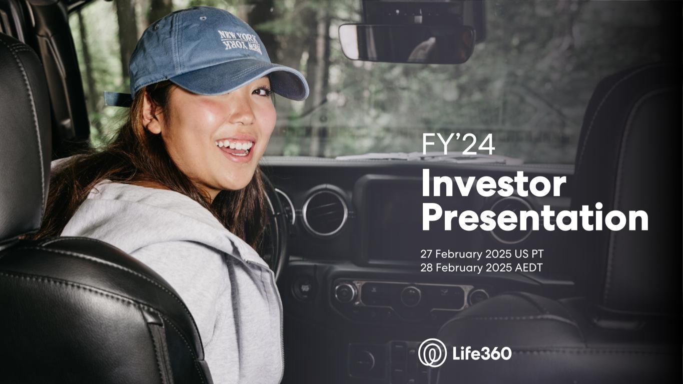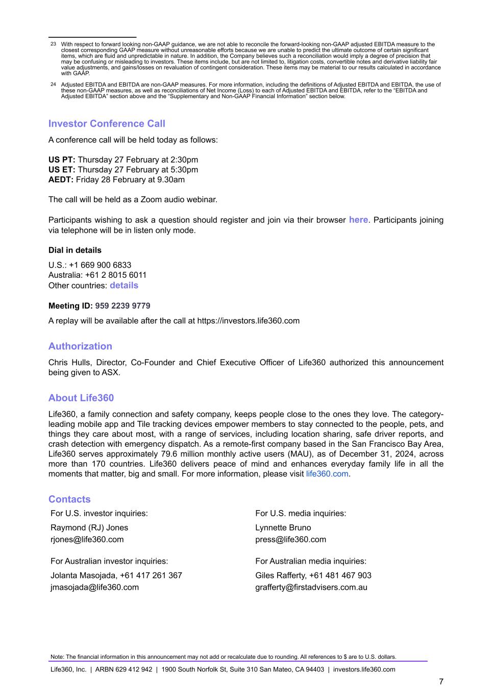 23 With respect to forward looking non-GAAP guidance, we are not able to reconcile the forward-looking non-GAAP adjusted EBITDA measure to the closest corresponding GAAP measure without unreasonable efforts because we are unable to predict the ultimate outcome of certain significant items, which are fluid and unpredictable in nature. In addition, the Company believes such a reconciliation would imply a degree of precision that may be confusing or misleading to investors. These items include, but are not limited to, litigation costs, convertible notes and derivative liability fair value adjustments, and gains/losses on revaluation of contingent consideration. These items may be material to our results calculated in accordance with GAAP. 24 Adjusted EBITDA and EBITDA are non-GAAP measures. For more information, including the definitions of Adjusted EBITDA and EBITDA, the use of these non-GAAP measures, as well as reconciliations of Net Income (Loss) to each of Adjusted EBITDA and EBITDA, refer to the “EBITDA and Adjusted EBITDA” section above and the “Supplementary and Non-GAAP Financial Information” section below. Investor Conference Call A conference call will be held today as follows: US PT: Thursday 27 February at 2:30pm US ET: Thursday 27 February at 5:30pm AEDT: Friday 28 February at 9.30am The call will be held as a Zoom audio webinar. Participants wishing to ask a question should register and join via their browser here. Participants joining via telephone will be in listen only mode. Dial in details U.S.: +1 669 900 6833 Australia: +61 2 8015 6011 Other countries: details Meeting ID: 959 2239 9779 A replay will be available after the call at https://investors.life360.com Authorization Chris Hulls, Director, Co-Founder and Chief Executive Officer of Life360 authorized this announcement being given to ASX. About Life360 Life360, a family connection and safety company, keeps people close to the ones they love. The category- leading mobile app and Tile tracking devices empower members to stay connected to the people, pets, and things they care about most, with a range of services, including location sharing, safe driver reports, and crash detection with emergency dispatch. As a remote-first company based in the San Francisco Bay Area, Life360 serves approximately 79.6 million monthly active users (MAU), as of December 31, 2024, across more than 170 countries. Life360 delivers peace of mind and enhances everyday family life in all the moments that matter, big and small. For more information, please visit life360.com. Contacts For U.S. investor inquiries: For U.S. media inquiries: Raymond (RJ) Jones Lynnette Bruno rjones@life360.com press@life360.com For Australian investor inquiries: For Australian media inquiries: Jolanta Masojada, +61 417 261 367 Giles Rafferty, +61 481 467 903 jmasojada@life360.com grafferty@firstadvisers.com.au Note: The financial information in this announcement may not add or recalculate due to rounding. All references to $ are to U.S. dollars. Life360, Inc. | ARBN 629 412 942 | 1900 South Norfolk St, Suite 310 San Mateo, CA 94403 | investors.life360.com 7