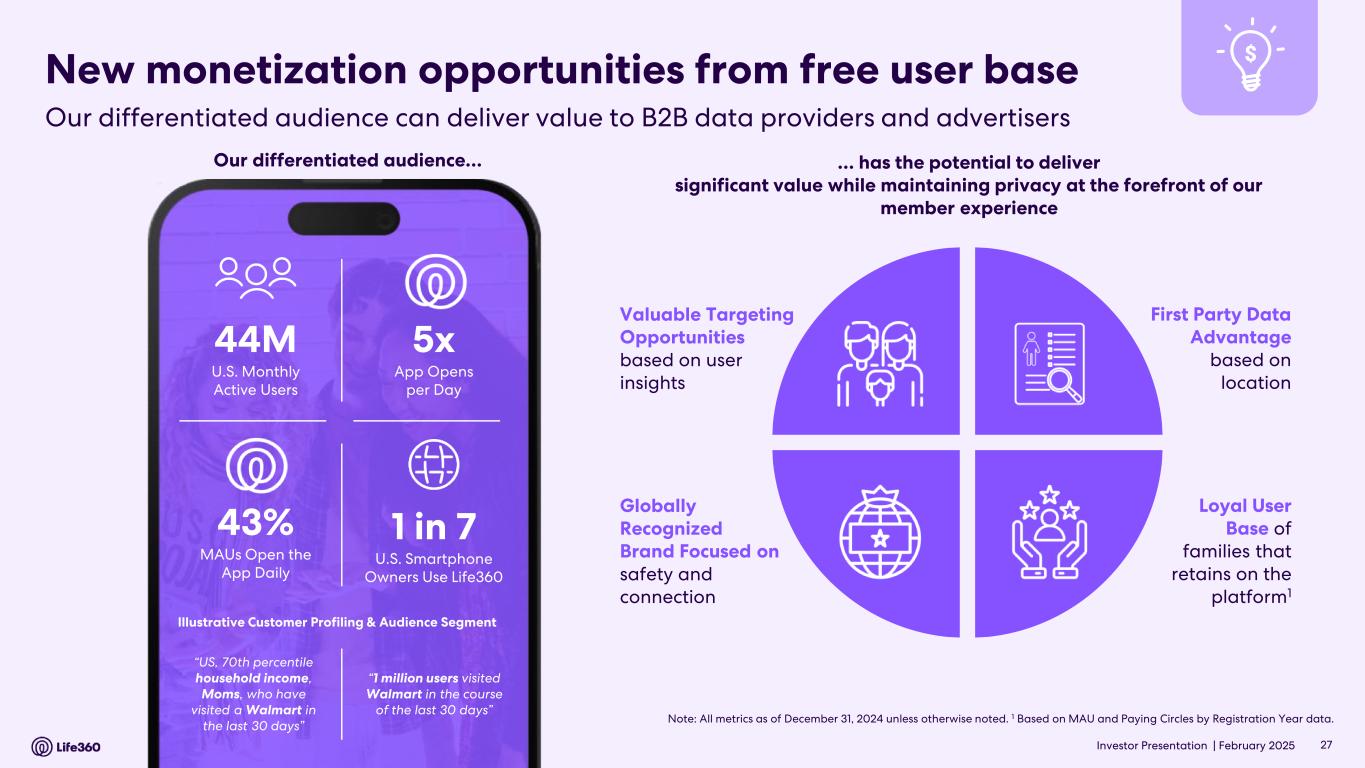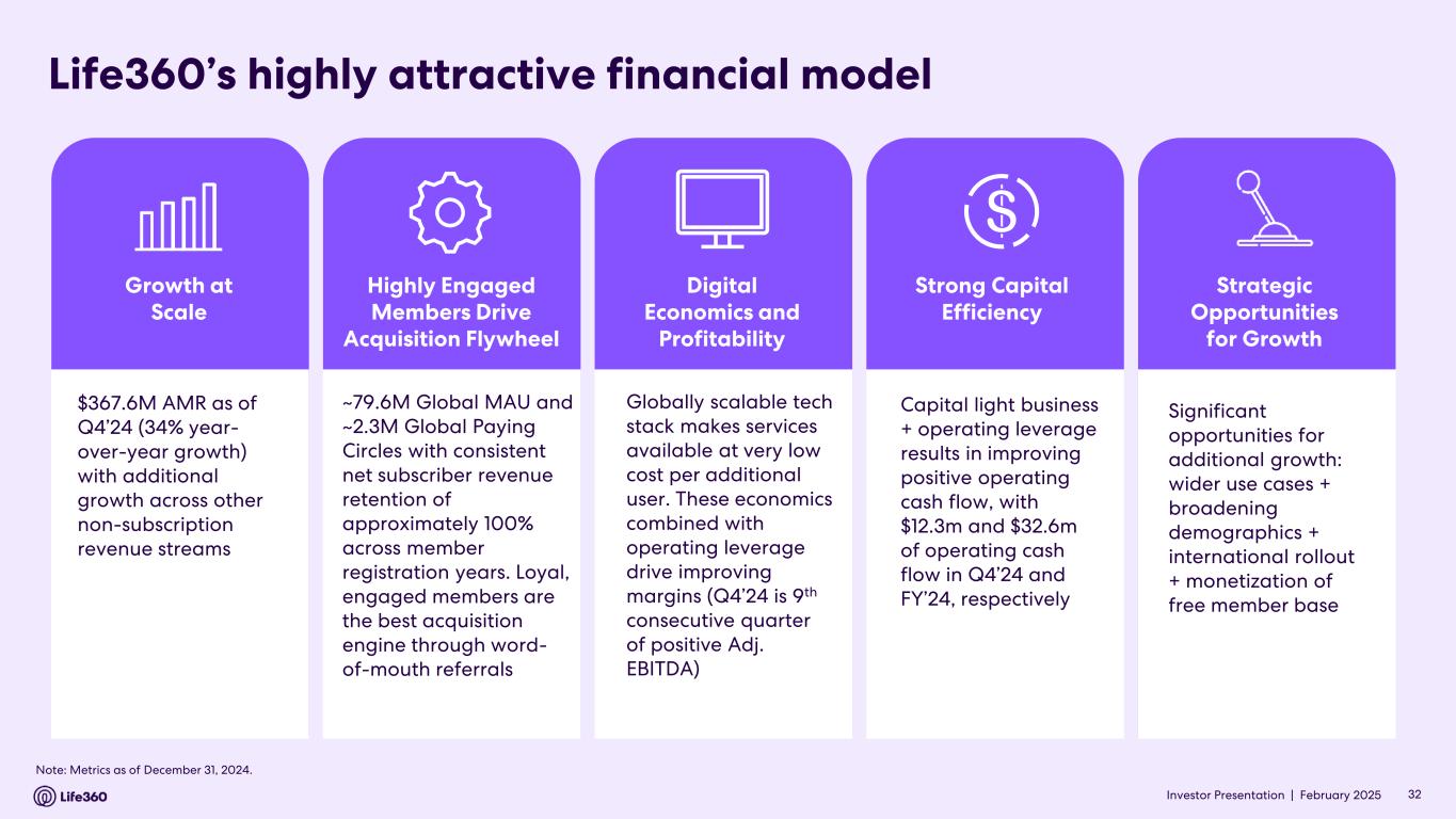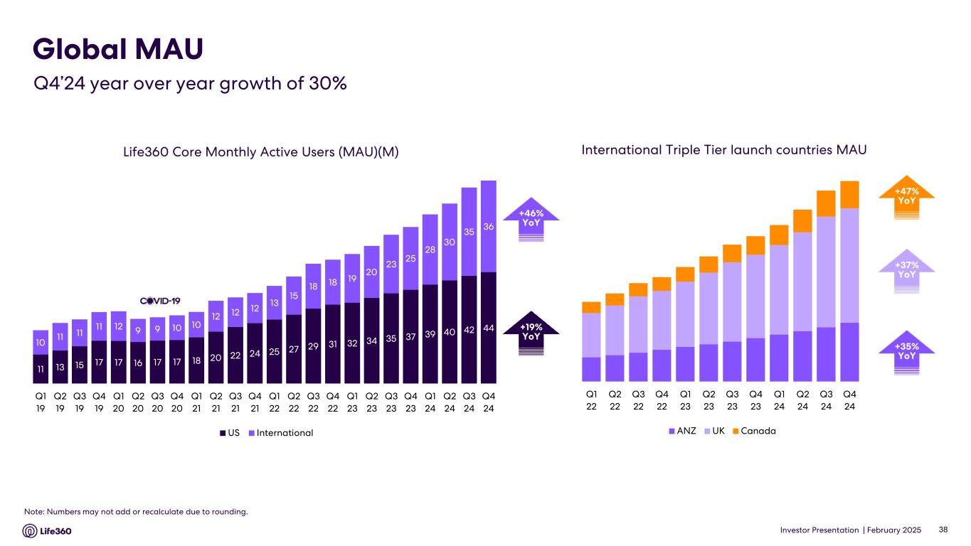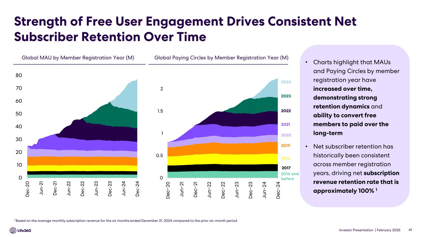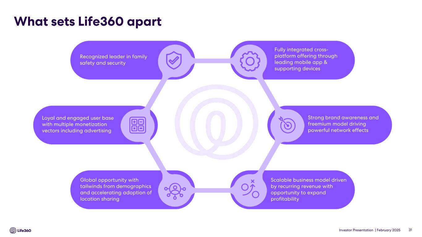 23 With respect to forward looking non-GAAP guidance, we are not able to reconcile the forward-looking non-GAAP adjusted EBITDA measure to the closest corresponding GAAP measure without unreasonable efforts because we are unable to predict the ultimate outcome of certain significant items, which are fluid and unpredictable in nature. In addition, the Company believes such a reconciliation would imply a degree of precision that may be confusing or misleading to investors. These items include, but are not limited to, litigation costs, convertible notes and derivative liability fair value adjustments, and gains/losses on revaluation of contingent consideration. These items may be material to our results calculated in accordance with GAAP. 24 Adjusted EBITDA and EBITDA are non-GAAP measures. For more information, including the definitions of Adjusted EBITDA and EBITDA, the use of these non-GAAP measures, as well as reconciliations of Net Income (Loss) to each of Adjusted EBITDA and EBITDA, refer to the “EBITDA and Adjusted EBITDA” section above and the “Supplementary and Non-GAAP Financial Information” section below. Investor Conference Call A conference call will be held today as follows: US PT: Thursday 27 February at 2:30pm US ET: Thursday 27 February at 5:30pm AEDT: Friday 28 February at 9.30am The call will be held as a Zoom audio webinar. Participants wishing to ask a question should register and join via their browser here. Participants joining via telephone will be in listen only mode. Dial in details U.S.: +1 669 900 6833 Australia: +61 2 8015 6011 Other countries: details Meeting ID: 959 2239 9779 A replay will be available after the call at https://investors.life360.com Authorization Chris Hulls, Director, Co-Founder and Chief Executive Officer of Life360 authorized this announcement being given to ASX. About Life360 Life360, a family connection and safety company, keeps people close to the ones they love. The category- leading mobile app and Tile tracking devices empower members to stay connected to the people, pets, and things they care about most, with a range of services, including location sharing, safe driver reports, and crash detection with emergency dispatch. As a remote-first company based in the San Francisco Bay Area, Life360 serves approximately 79.6 million monthly active users (MAU), as of December 31, 2024, across more than 170 countries. Life360 delivers peace of mind and enhances everyday family life in all the moments that matter, big and small. For more information, please visit life360.com. Contacts For U.S. investor inquiries: For U.S. media inquiries: Raymond (RJ) Jones Lynnette Bruno rjones@life360.com press@life360.com For Australian investor inquiries: For Australian media inquiries: Jolanta Masojada, +61 417 261 367 Giles Rafferty, +61 481 467 903 jmasojada@life360.com grafferty@firstadvisers.com.au Note: The financial information in this announcement may not add or recalculate due to rounding. All references to $ are to U.S. dollars. Life360, Inc. | ARBN 629 412 942 | 1900 South Norfolk St, Suite 310 San Mateo, CA 94403 | investors.life360.com 7