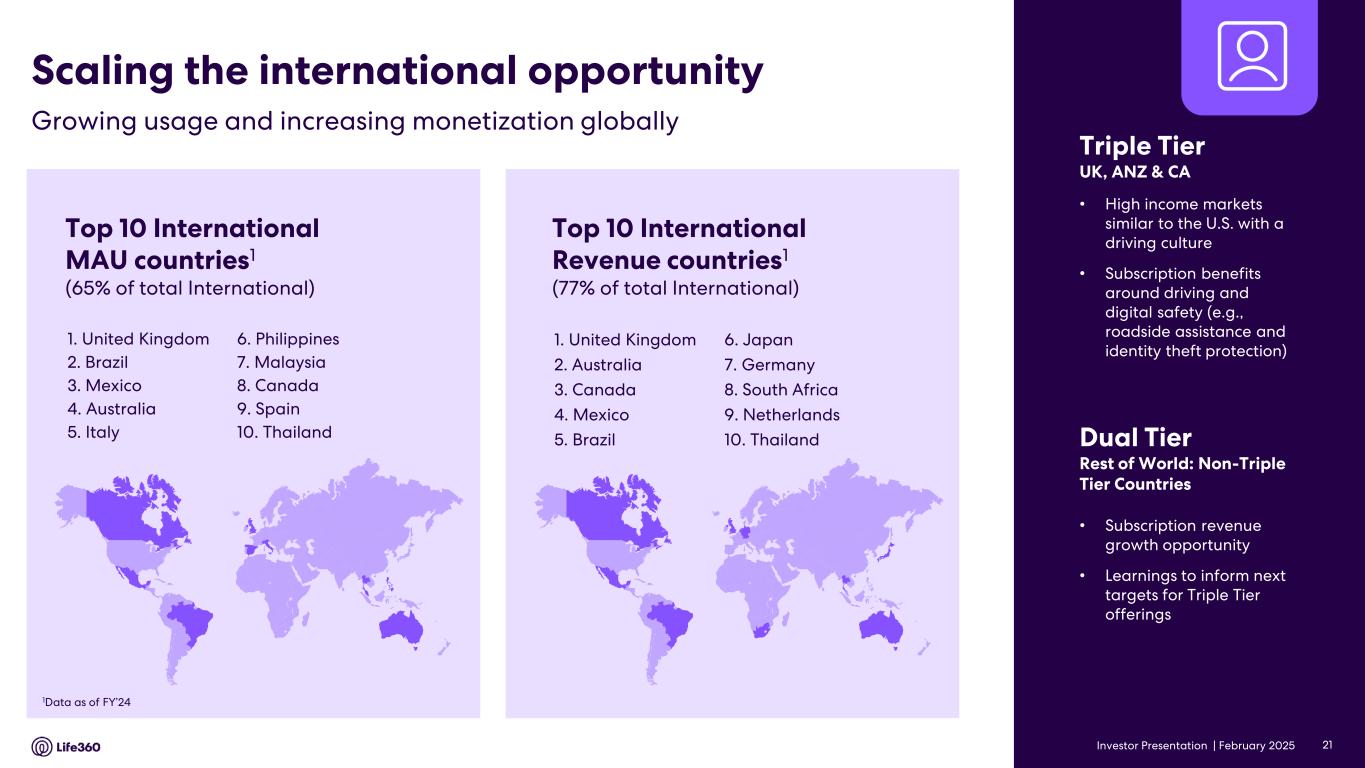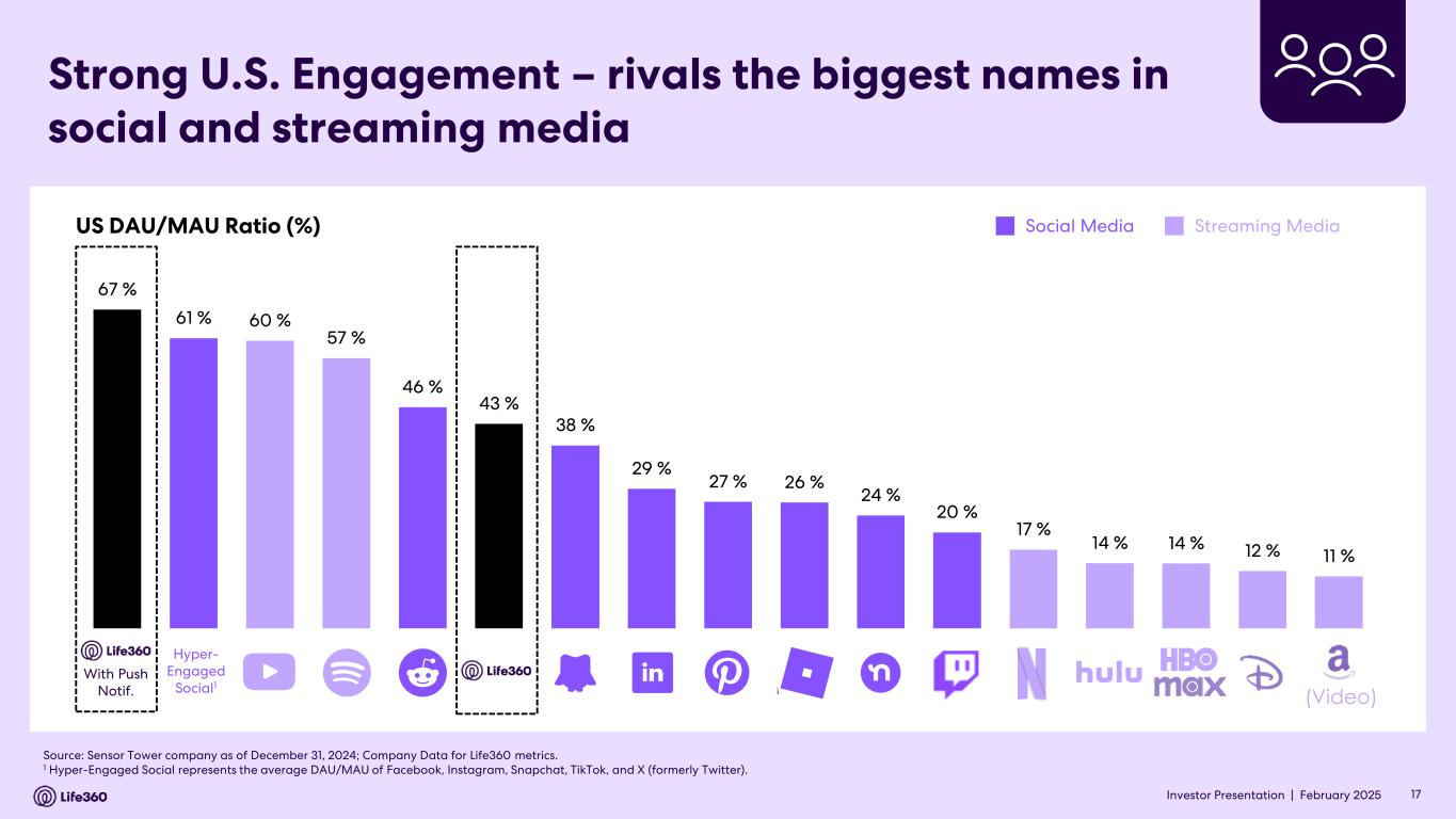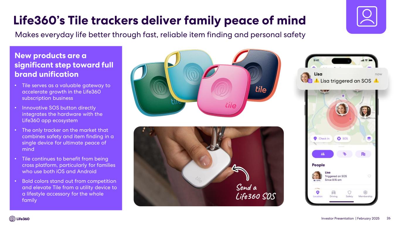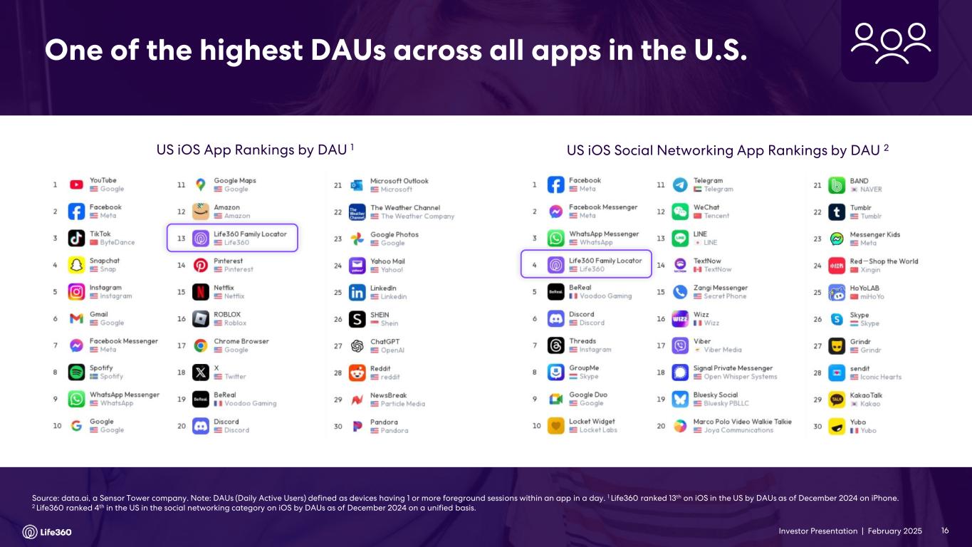 23 With respect to forward looking non-GAAP guidance, we are not able to reconcile the forward-looking non-GAAP adjusted EBITDA measure to the closest corresponding GAAP measure without unreasonable efforts because we are unable to predict the ultimate outcome of certain significant items, which are fluid and unpredictable in nature. In addition, the Company believes such a reconciliation would imply a degree of precision that may be confusing or misleading to investors. These items include, but are not limited to, litigation costs, convertible notes and derivative liability fair value adjustments, and gains/losses on revaluation of contingent consideration. These items may be material to our results calculated in accordance with GAAP. 24 Adjusted EBITDA and EBITDA are non-GAAP measures. For more information, including the definitions of Adjusted EBITDA and EBITDA, the use of these non-GAAP measures, as well as reconciliations of Net Income (Loss) to each of Adjusted EBITDA and EBITDA, refer to the “EBITDA and Adjusted EBITDA” section above and the “Supplementary and Non-GAAP Financial Information” section below. Investor Conference Call A conference call will be held today as follows: US PT: Thursday 27 February at 2:30pm US ET: Thursday 27 February at 5:30pm AEDT: Friday 28 February at 9.30am The call will be held as a Zoom audio webinar. Participants wishing to ask a question should register and join via their browser here. Participants joining via telephone will be in listen only mode. Dial in details U.S.: +1 669 900 6833 Australia: +61 2 8015 6011 Other countries: details Meeting ID: 959 2239 9779 A replay will be available after the call at https://investors.life360.com Authorization Chris Hulls, Director, Co-Founder and Chief Executive Officer of Life360 authorized this announcement being given to ASX. About Life360 Life360, a family connection and safety company, keeps people close to the ones they love. The category- leading mobile app and Tile tracking devices empower members to stay connected to the people, pets, and things they care about most, with a range of services, including location sharing, safe driver reports, and crash detection with emergency dispatch. As a remote-first company based in the San Francisco Bay Area, Life360 serves approximately 79.6 million monthly active users (MAU), as of December 31, 2024, across more than 170 countries. Life360 delivers peace of mind and enhances everyday family life in all the moments that matter, big and small. For more information, please visit life360.com. Contacts For U.S. investor inquiries: For U.S. media inquiries: Raymond (RJ) Jones Lynnette Bruno rjones@life360.com press@life360.com For Australian investor inquiries: For Australian media inquiries: Jolanta Masojada, +61 417 261 367 Giles Rafferty, +61 481 467 903 jmasojada@life360.com grafferty@firstadvisers.com.au Note: The financial information in this announcement may not add or recalculate due to rounding. All references to $ are to U.S. dollars. Life360, Inc. | ARBN 629 412 942 | 1900 South Norfolk St, Suite 310 San Mateo, CA 94403 | investors.life360.com 7