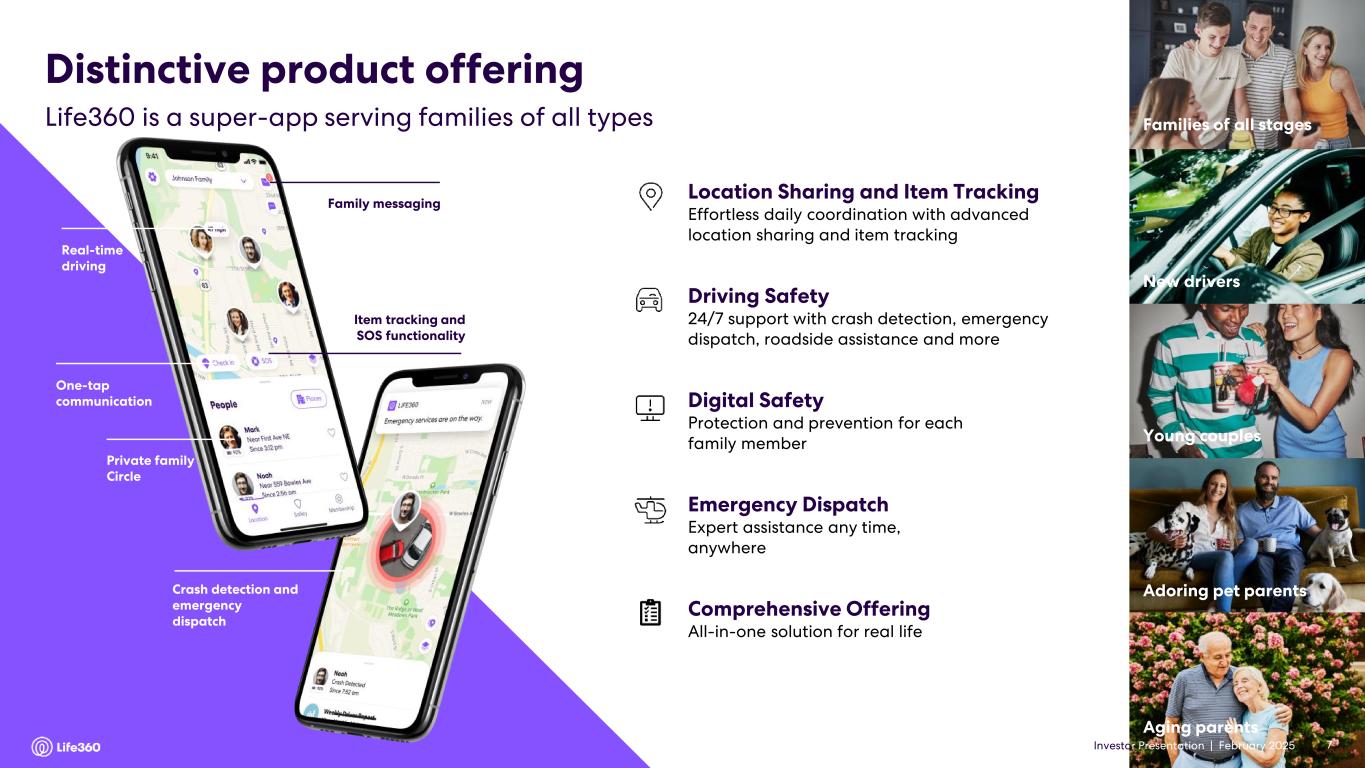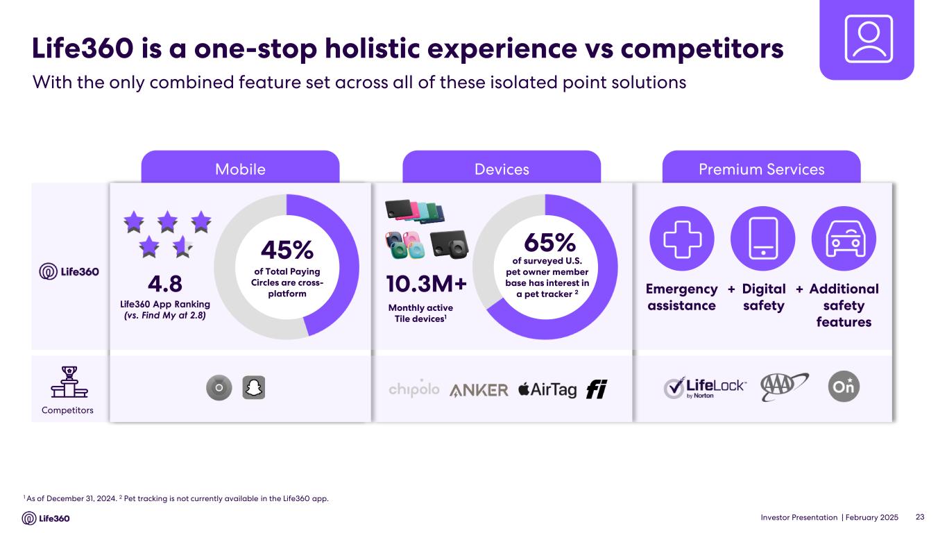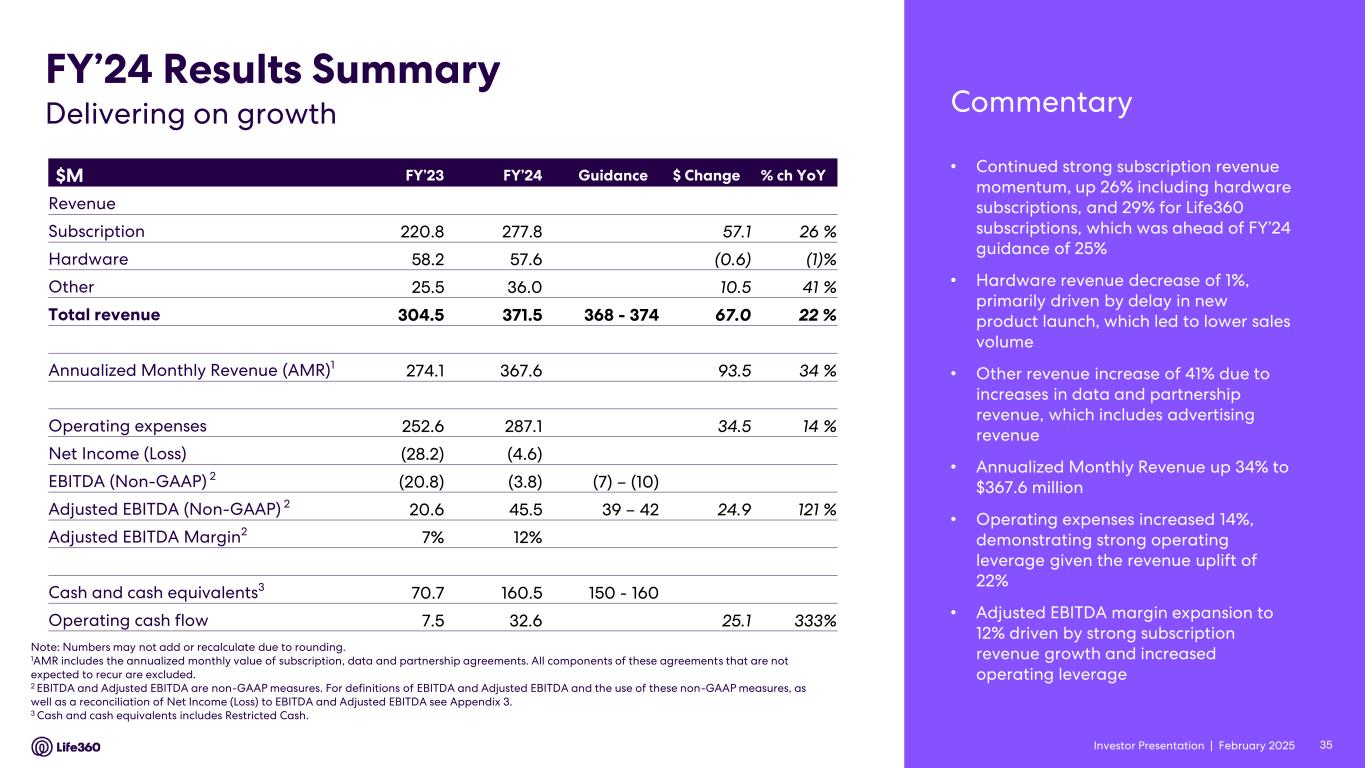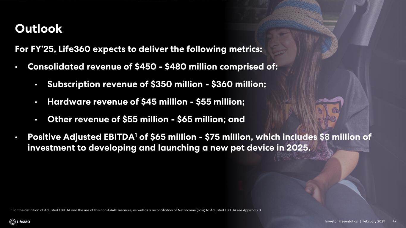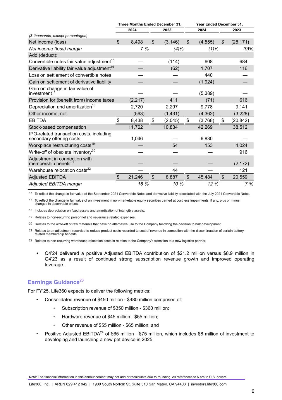 Three Months Ended December 31, Year Ended December 31, 2024 2023 2024 2023 ($ thousands, except percentages) Net income (loss) $ 8,498 $ (3,146) $ (4,555) $ (28,171) Net income (loss) margin 7 % (4) % (1) % (9) % Add (deduct): Convertible notes fair value adjustment16 — (114) 608 684 Derivative liability fair value adjustment16 — (62) 1,707 116 Loss on settlement of convertible notes — — 440 — Gain on settlement of derivative liability — — (1,924) — Gain on change in fair value of investment17 — — (5,389) — Provision for (benefit from) income taxes (2,217) 411 (71) 616 Depreciation and amortization18 2,720 2,297 9,778 9,141 Other income, net (563) (1,431) (4,362) (3,228) EBITDA $ 8,438 $ (2,045) $ (3,768) $ (20,842) Stock-based compensation 11,762 10,834 42,269 38,512 IPO-related transaction costs, including secondary offering costs 1,046 — 6,830 — Workplace restructuring costs19 — 54 153 4,024 Write-off of obsolete inventory20 — — — 916 Adjustment in connection with membership benefit21 — — — (2,172) Warehouse relocation costs22 — 44 — 121 Adjusted EBITDA $ 21,246 $ 8,887 $ 45,484 $ 20,559 Adjusted EBITDA margin 18 % 10 % 12 % 7 % 16 To reflect the change in fair value of the September 2021 Convertible Notes and derivative liability associated with the July 2021 Convertible Notes. 17 To reflect the change in fair value of an investment in non-marketable equity securities carried at cost less impairments, if any, plus or minus changes in observable prices. 18 Includes depreciation on fixed assets and amortization of intangible assets. 19 Relates to non-recurring personnel and severance related expenses. 20 Relates to the write-off of raw materials that have no alternative use to the Company following the decision to halt development. 21 Relates to an adjustment recorded to reduce product costs recorded to cost of revenue in connection with the discontinuation of certain battery related membership benefits. 22 Relates to non-recurring warehouse relocation costs in relation to the Company's transition to a new logistics partner. • Q4’24 delivered a positive Adjusted EBITDA contribution of $21.2 million versus $8.9 million in Q4’23 as a result of continued strong subscription revenue growth and improved operating leverage. Earnings Guidance23 For FY’25, Life360 expects to deliver the following metrics: • Consolidated revenue of $450 million - $480 million comprised of: ◦ Subscription revenue of $350 million - $360 million; ◦ Hardware revenue of $45 million - $55 million; ◦ Other revenue of $55 million - $65 million; and • Positive Adjusted EBITDA24 of $65 million - $75 million, which includes $8 million of investment to developing and launching a new pet device in 2025. Note: The financial information in this announcement may not add or recalculate due to rounding. All references to $ are to U.S. dollars. Life360, Inc. | ARBN 629 412 942 | 1900 South Norfolk St, Suite 310 San Mateo, CA 94403 | investors.life360.com 6