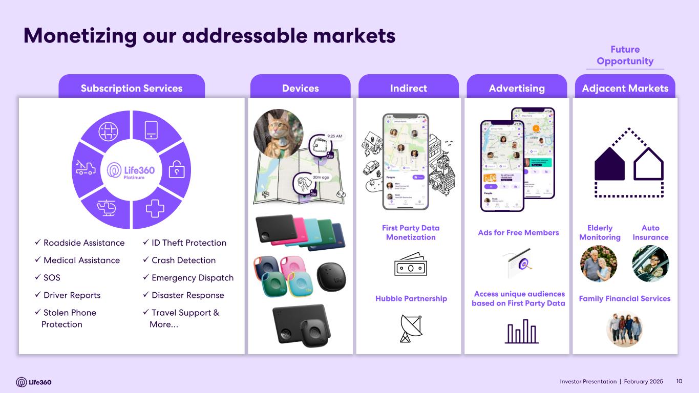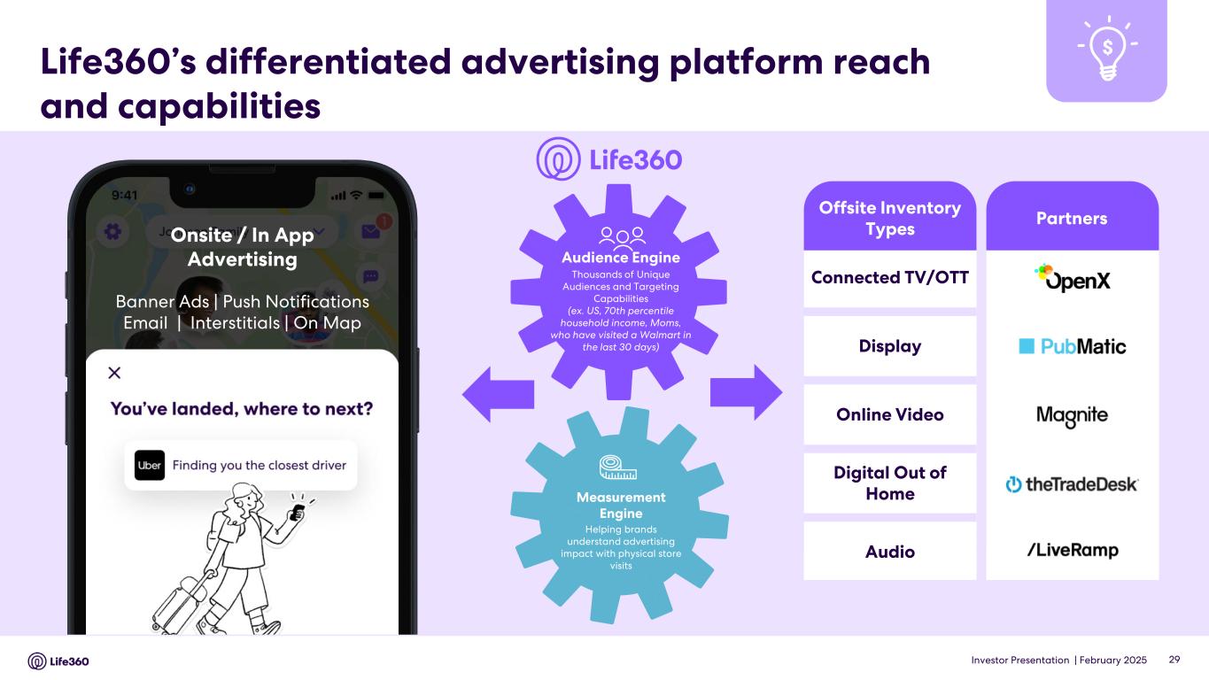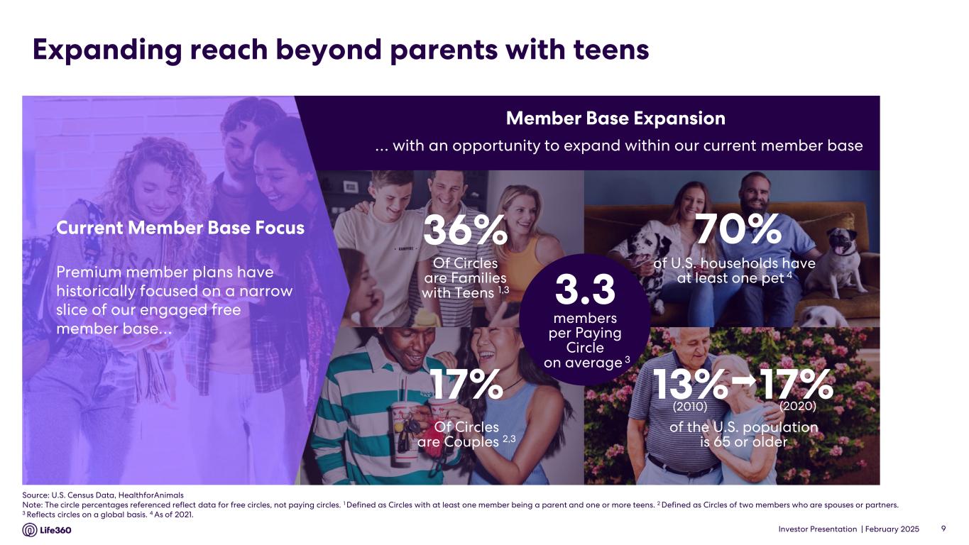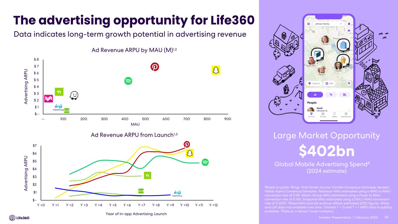 Forward-looking statements This announcement and the accompanying presentation and conference call contain forward-looking statements within the meaning of the Private Securities Litigation Reform Act of 1995. Life360 intends such forward-looking statements to be covered by the safe harbor provisions for forward-looking statements contained in Section 21E of the Securities Exchange Act of 1934, as amended. These forward-looking statements regarding Life360’s intentions, objectives, plans, expectations, assumptions and beliefs about future events, including Life360’s expectations with respect to the financial and operating performance of its business, including subscription revenue, hardware revenue, other revenue and consolidated revenue and ability to create new revenue streams; the timing of the launch of advertising globally and that it is well positioned to scale ad revenue substantially in the coming years; its ability to deliver contextually relevant advertisements that enhance the user experience by leveraging its extensive first-party location data; its expectation of opportunities and significant increase in advertising revenue driven by its partnerships with Uber; Adjusted EBITDA, EBITDA, and operating cash flow; expectations regarding MAUs and other member metrics; its capital position; future growth and market opportunities; plans to launch new features and products; the impact of past price increases and expansion of product offerings in the UK, Australia and New Zealand on future results of operations and its confidence that advertising could eventually rival its subscription business; its expectations of growth in its data business; its expectation of a new enterprise revenue stream and enhanced location capabilities of its hardware devices as a result of its partnership with Hubble; its focus on developing a GPS lineup, built on Jiobit technology, the timing of new devices, and the potential for the next generation of hardware to drive a new wave of subscription growth; as well as Life360’s expectations of any changes to the information disclosed herein. The words “anticipate”, “believe”, “expect”, “project”, “predict”, “will”, “forecast”, “estimate”, “likely”, “intend”, “outlook”, “should”, “could”, “may”, “target”, “plan” and other similar expressions can generally be used to identify forward-looking statements. Indications of, and guidance or outlook on, future earnings or financial position or performance are also forward-looking statements. Investors and prospective investors are cautioned not to place undue reliance on these forward-looking statements as they involve inherent risk and uncertainty (both general and specific) and should note that they are provided as a general guide only and should not be relied on as an indication or guarantee of future performance. There is a risk that such predictions, forecasts, projections and other forward-looking statements will not be achieved. Subject to any continuing obligations under applicable law, Life360 does not undertake any obligation to publicly release the result of any revisions to these forward-looking statements to reflect events or circumstances after the date of this announcement, to reflect any change in expectations in relation to any forward-looking statements or any change in events, conditions or circumstances on which any such statements are based. Although Life360 believes that the expectations reflected in the forward-looking statements and the assumptions upon which they are based are reasonable, Life360 can give no assurance that such expectations and assumptions will prove to be correct and, actual results may vary in a materially positive or negative manner. Forward-looking statements are subject to known and unknown risks, uncertainty, assumptions and contingencies, many of which are outside Life360’s control, and are based on estimates and assumptions that are subject to change and may cause actual results, performance or achievements to differ materially from those expressed or implied by such statements. Factors that could cause actual results to differ materially from those in the forward-looking statements include risks related to the preliminary nature of financial results, risks related to Life360’s business, market risks, Life360’s need for additional capital, and the risk that Life360’s products and services may not perform as expected, as described in greater detail under the heading “Risk Factors” in Life360’s ASX and SEC filings, including its Annual Report on Form 10-K filed with the Securities and Exchange Commission on February 27, 2025, and other reports filed with the SEC. To the maximum extent permitted by law, responsibility for the accuracy or completeness of any forward-looking statements whether as a result of new information, future events or results or otherwise is disclaimed. This announcement should not be relied upon as a recommendation or forecast by Life360. Past performance information given in this document is given for illustrative purposes only and is not necessarily a guide to future performance and no representation or warranty is made by any person as to the likelihood of achievement or reasonableness of any forward-looking statements, forecast financial information, future share price performance or any underlying assumptions. Nothing contained in this document nor any information made available to you is, or shall be relied upon as, a promise, representation, warranty or guarantee as to the past, present or the future performance of Life360. Note: The financial information in this announcement may not add or recalculate due to rounding. All references to $ are to U.S. dollars. Life360, Inc. | ARBN 629 412 942 | 1900 South Norfolk St, Suite 310 San Mateo, CA 94403 | investors.life360.com 8