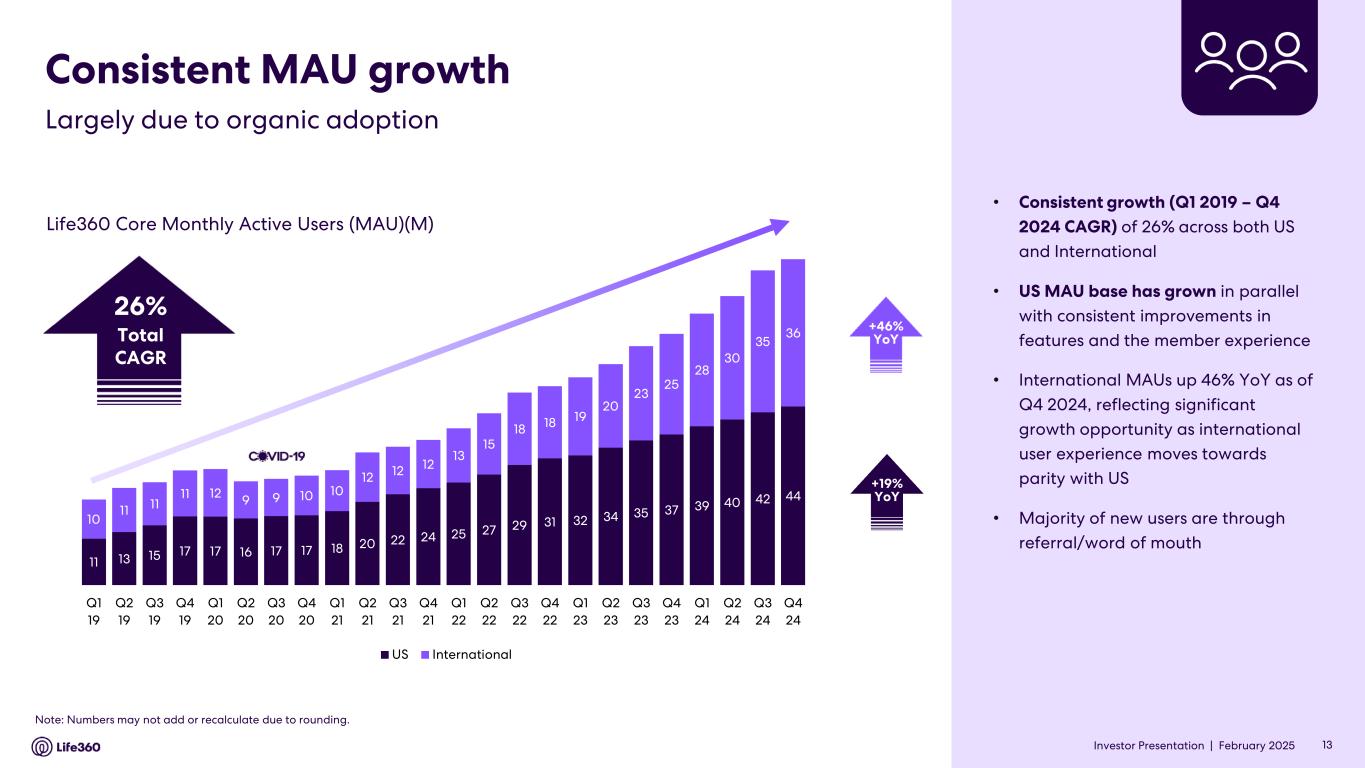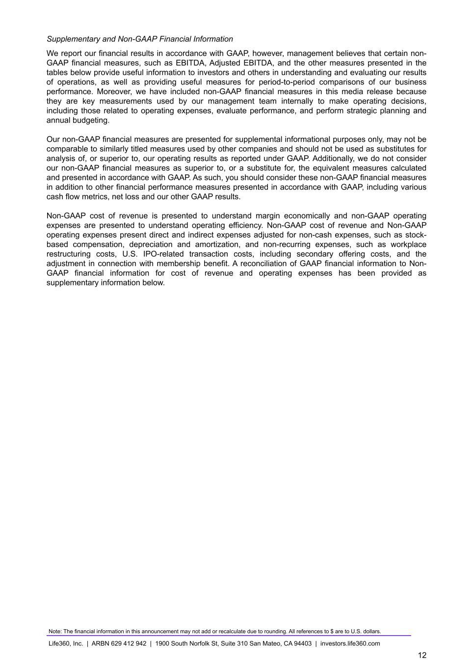 Supplementary and Non-GAAP Financial Information We report our financial results in accordance with GAAP, however, management believes that certain non- GAAP financial measures, such as EBITDA, Adjusted EBITDA, and the other measures presented in the tables below provide useful information to investors and others in understanding and evaluating our results of operations, as well as providing useful measures for period-to-period comparisons of our business performance. Moreover, we have included non-GAAP financial measures in this media release because they are key measurements used by our management team internally to make operating decisions, including those related to operating expenses, evaluate performance, and perform strategic planning and annual budgeting. Our non-GAAP financial measures are presented for supplemental informational purposes only, may not be comparable to similarly titled measures used by other companies and should not be used as substitutes for analysis of, or superior to, our operating results as reported under GAAP. Additionally, we do not consider our non-GAAP financial measures as superior to, or a substitute for, the equivalent measures calculated and presented in accordance with GAAP. As such, you should consider these non-GAAP financial measures in addition to other financial performance measures presented in accordance with GAAP, including various cash flow metrics, net loss and our other GAAP results. Non-GAAP cost of revenue is presented to understand margin economically and non-GAAP operating expenses are presented to understand operating efficiency. Non-GAAP cost of revenue and Non-GAAP operating expenses present direct and indirect expenses adjusted for non-cash expenses, such as stock- based compensation, depreciation and amortization, and non-recurring expenses, such as workplace restructuring costs, U.S. IPO-related transaction costs, including secondary offering costs, and the adjustment in connection with membership benefit. A reconciliation of GAAP financial information to Non- GAAP financial information for cost of revenue and operating expenses has been provided as supplementary information below. Note: The financial information in this announcement may not add or recalculate due to rounding. All references to $ are to U.S. dollars. Life360, Inc. | ARBN 629 412 942 | 1900 South Norfolk St, Suite 310 San Mateo, CA 94403 | investors.life360.com 12