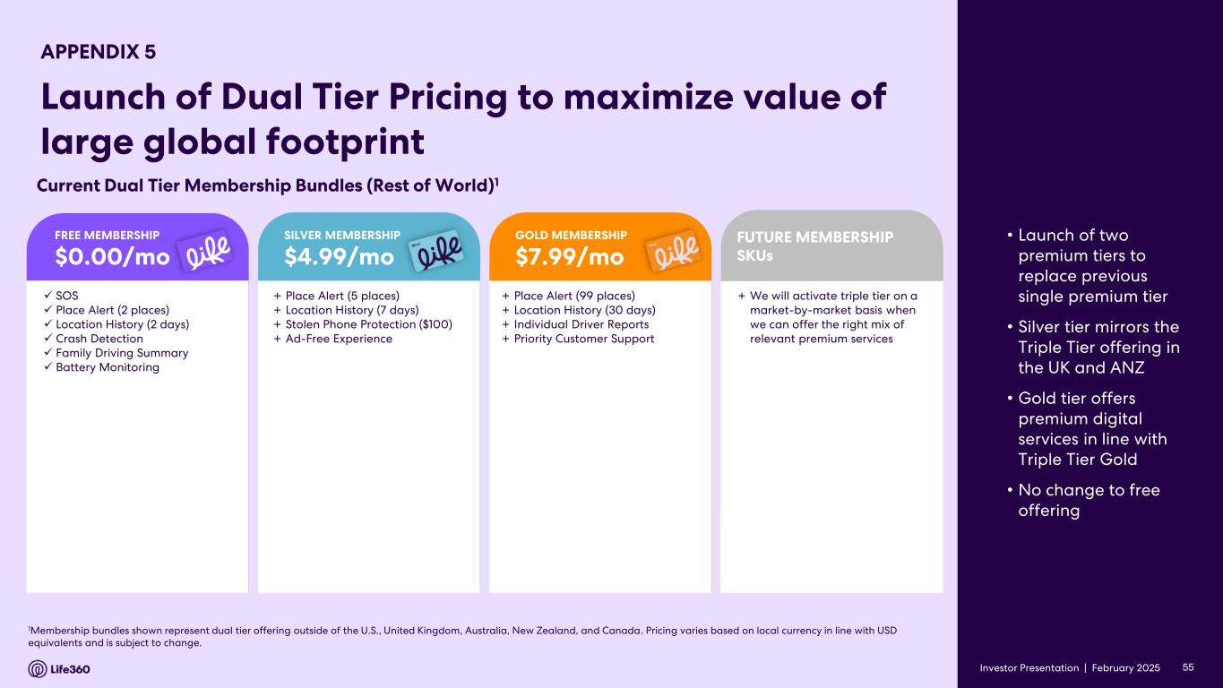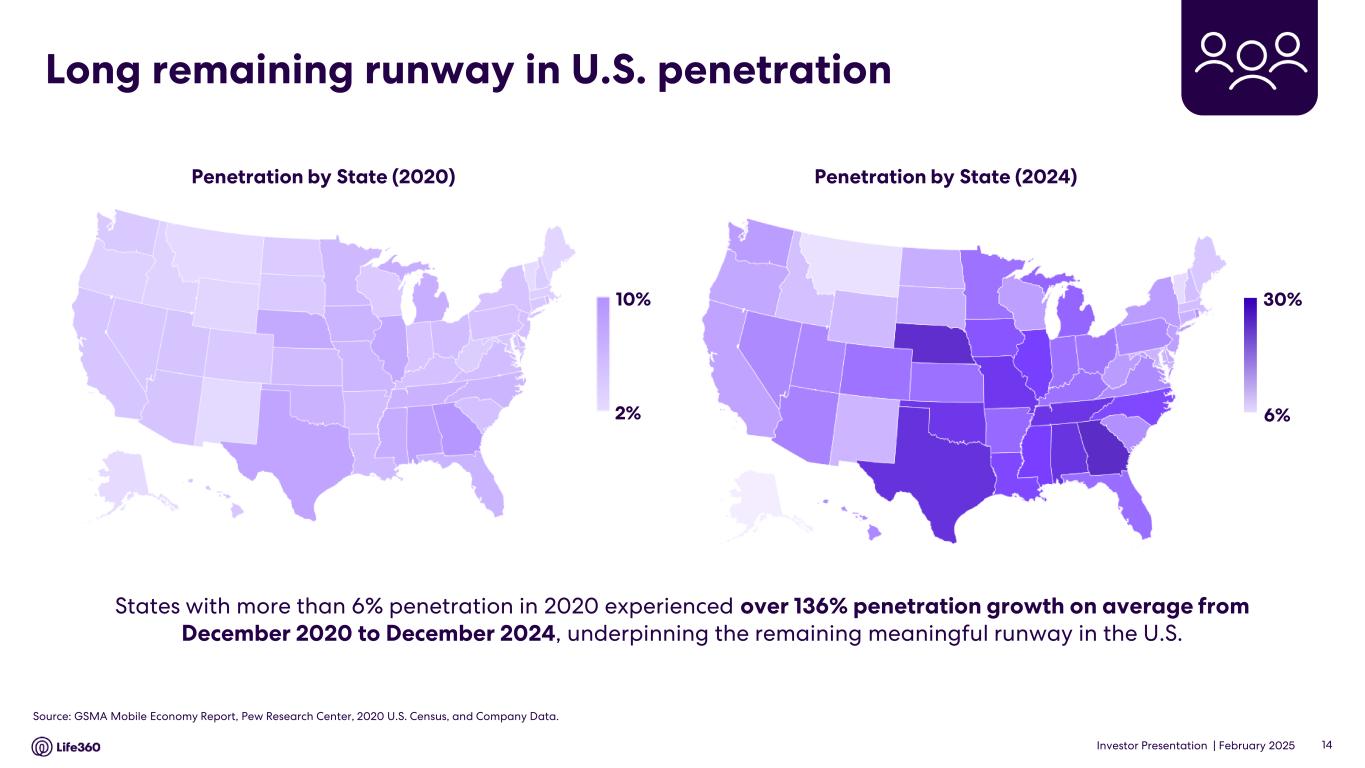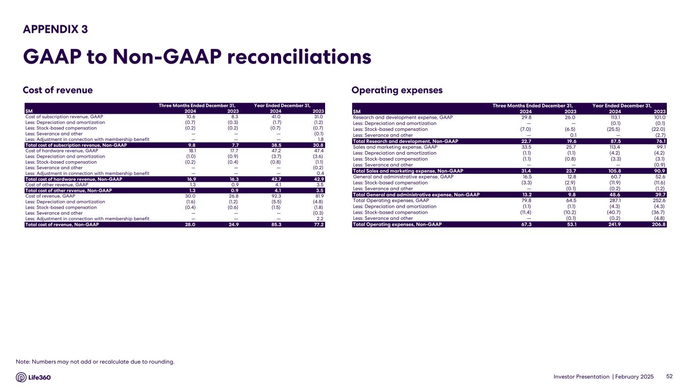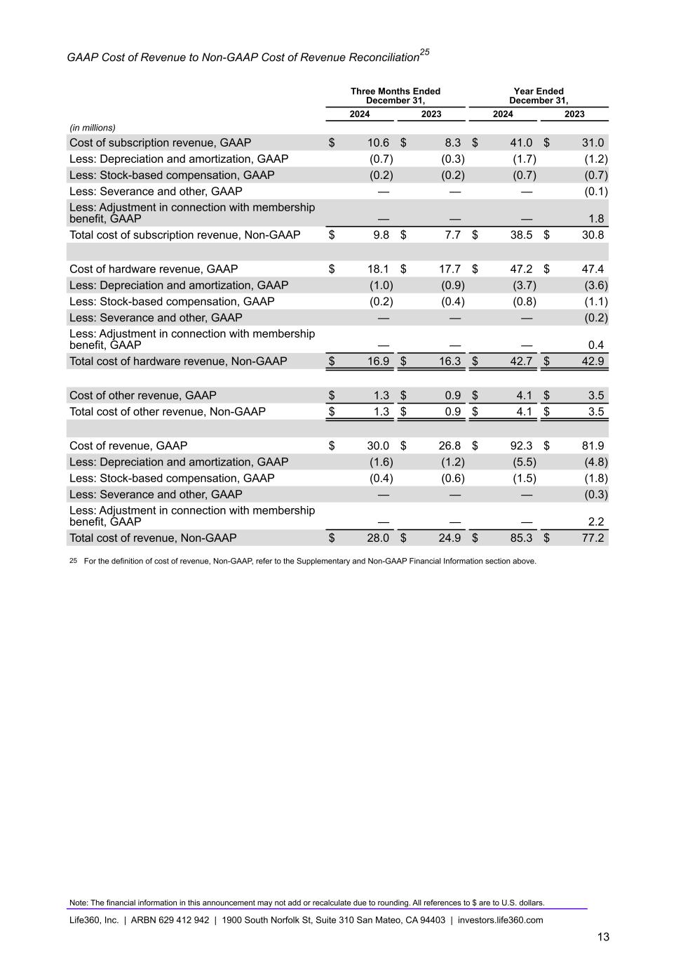 GAAP Cost of Revenue to Non-GAAP Cost of Revenue Reconciliation25 Three Months Ended December 31, Year Ended December 31, 2024 2023 2024 2023 (in millions) Cost of subscription revenue, GAAP $ 10.6 $ 8.3 $ 41.0 $ 31.0 Less: Depreciation and amortization, GAAP (0.7) (0.3) (1.7) (1.2) Less: Stock-based compensation, GAAP (0.2) (0.2) (0.7) (0.7) Less: Severance and other, GAAP — — — (0.1) Less: Adjustment in connection with membership benefit, GAAP — — — 1.8 Total cost of subscription revenue, Non-GAAP $ 9.8 $ 7.7 $ 38.5 $ 30.8 Cost of hardware revenue, GAAP $ 18.1 $ 17.7 $ 47.2 $ 47.4 Less: Depreciation and amortization, GAAP (1.0) (0.9) (3.7) (3.6) Less: Stock-based compensation, GAAP (0.2) (0.4) (0.8) (1.1) Less: Severance and other, GAAP — — — (0.2) Less: Adjustment in connection with membership benefit, GAAP — — — 0.4 Total cost of hardware revenue, Non-GAAP $ 16.9 $ 16.3 $ 42.7 $ 42.9 Cost of other revenue, GAAP $ 1.3 $ 0.9 $ 4.1 $ 3.5 Total cost of other revenue, Non-GAAP $ 1.3 $ 0.9 $ 4.1 $ 3.5 Cost of revenue, GAAP $ 30.0 $ 26.8 $ 92.3 $ 81.9 Less: Depreciation and amortization, GAAP (1.6) (1.2) (5.5) (4.8) Less: Stock-based compensation, GAAP (0.4) (0.6) (1.5) (1.8) Less: Severance and other, GAAP — — — (0.3) Less: Adjustment in connection with membership benefit, GAAP — — — 2.2 Total cost of revenue, Non-GAAP $ 28.0 $ 24.9 $ 85.3 $ 77.2 25 For the definition of cost of revenue, Non-GAAP, refer to the Supplementary and Non-GAAP Financial Information section above. Note: The financial information in this announcement may not add or recalculate due to rounding. All references to $ are to U.S. dollars. Life360, Inc. | ARBN 629 412 942 | 1900 South Norfolk St, Suite 310 San Mateo, CA 94403 | investors.life360.com 13