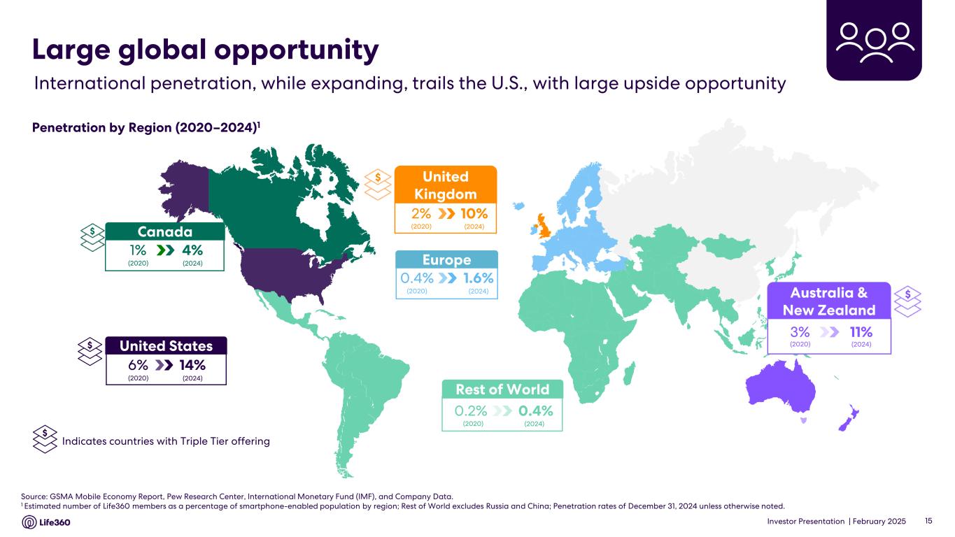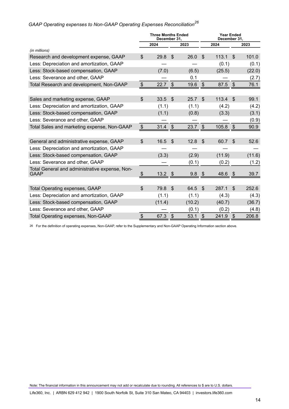GAAP Operating expenses to Non-GAAP Operating Expenses Reconciliation26 Three Months Ended December 31, Year Ended December 31, 2024 2023 2024 2023 (in millions) Research and development expense, GAAP $ 29.8 $ 26.0 $ 113.1 $ 101.0 Less: Depreciation and amortization, GAAP — — (0.1) (0.1) Less: Stock-based compensation, GAAP (7.0) (6.5) (25.5) (22.0) Less: Severance and other, GAAP — 0.1 — (2.7) Total Research and development, Non-GAAP $ 22.7 $ 19.6 $ 87.5 $ 76.1 Sales and marketing expense, GAAP $ 33.5 $ 25.7 $ 113.4 $ 99.1 Less: Depreciation and amortization, GAAP (1.1) (1.1) (4.2) (4.2) Less: Stock-based compensation, GAAP (1.1) (0.8) (3.3) (3.1) Less: Severance and other, GAAP — — — (0.9) Total Sales and marketing expense, Non-GAAP $ 31.4 $ 23.7 $ 105.8 $ 90.9 General and administrative expense, GAAP $ 16.5 $ 12.8 $ 60.7 $ 52.6 Less: Depreciation and amortization, GAAP — — — — Less: Stock-based compensation, GAAP (3.3) (2.9) (11.9) (11.6) Less: Severance and other, GAAP — (0.1) (0.2) (1.2) Total General and administrative expense, Non- GAAP $ 13.2 $ 9.8 $ 48.6 $ 39.7 Total Operating expenses, GAAP $ 79.8 $ 64.5 $ 287.1 $ 252.6 Less: Depreciation and amortization, GAAP (1.1) (1.1) (4.3) (4.3) Less: Stock-based compensation, GAAP (11.4) (10.2) (40.7) (36.7) Less: Severance and other, GAAP — (0.1) (0.2) (4.8) Total Operating expenses, Non-GAAP $ 67.3 $ 53.1 $ — $ 241.9 $ 206.8 26 For the definition of operating expenses, Non-GAAP, refer to the Supplementary and Non-GAAP Operating Information section above. Note: The financial information in this announcement may not add or recalculate due to rounding. All references to $ are to U.S. dollars. Life360, Inc. | ARBN 629 412 942 | 1900 South Norfolk St, Suite 310 San Mateo, CA 94403 | investors.life360.com 14