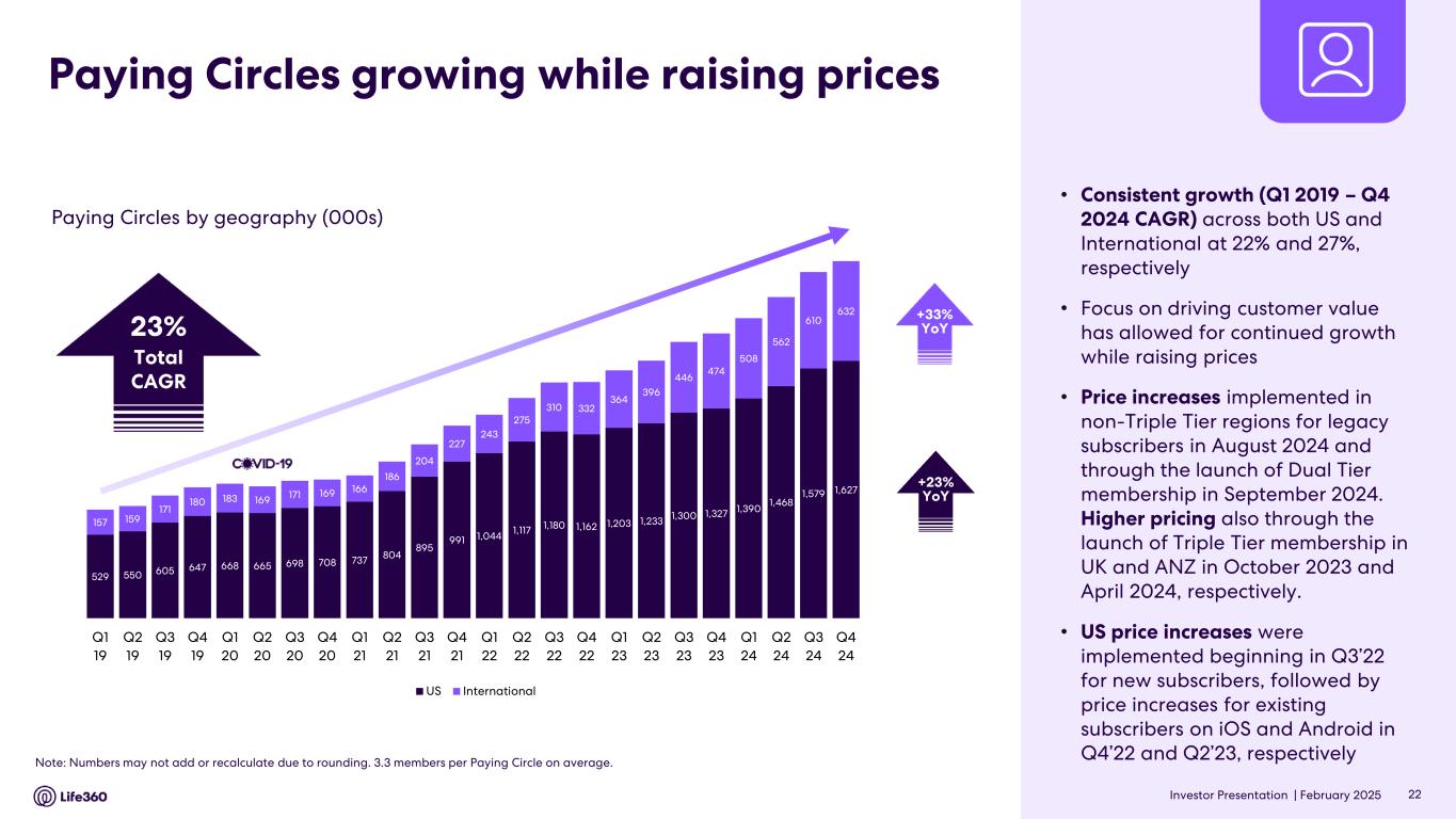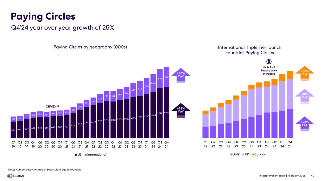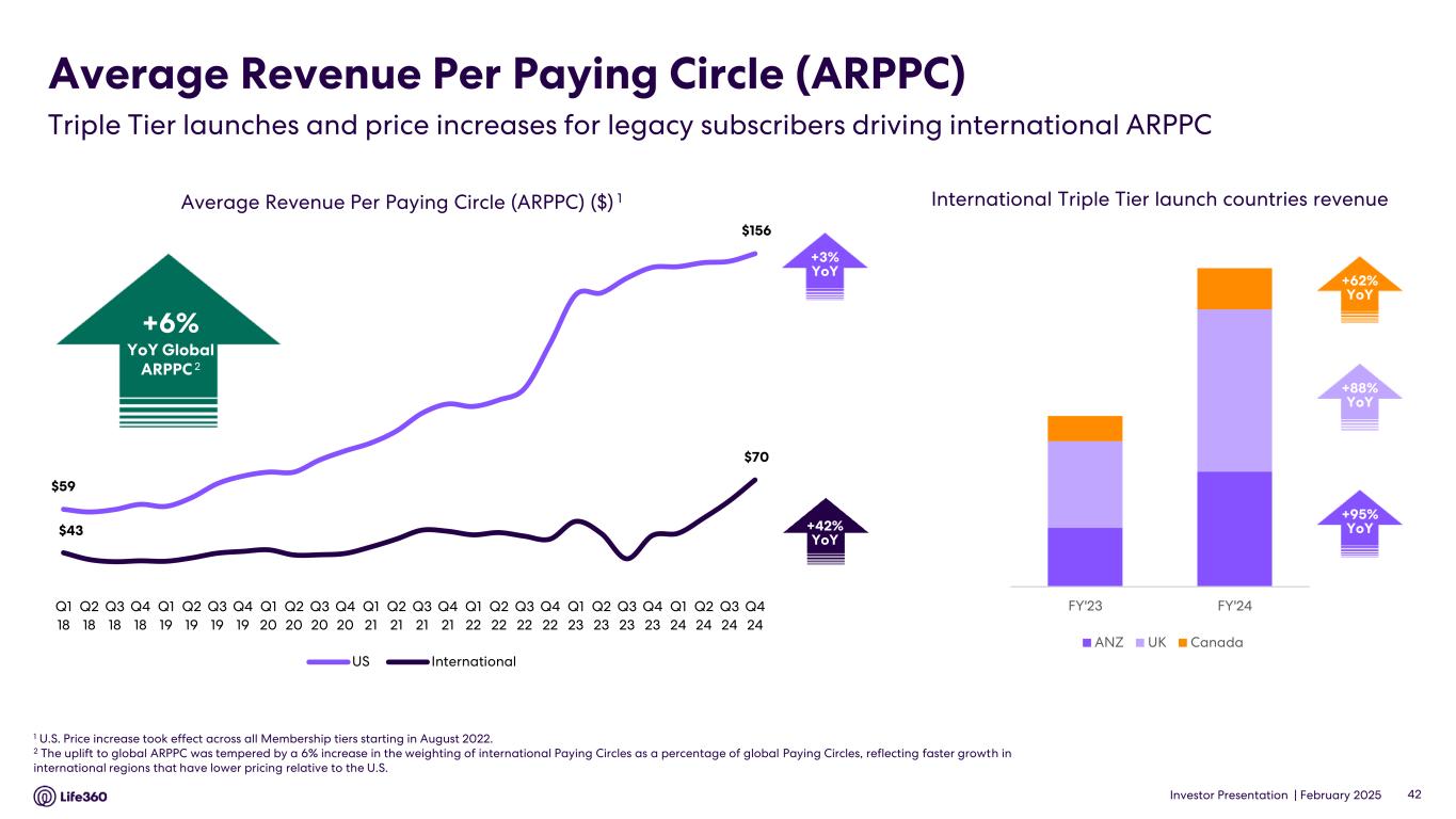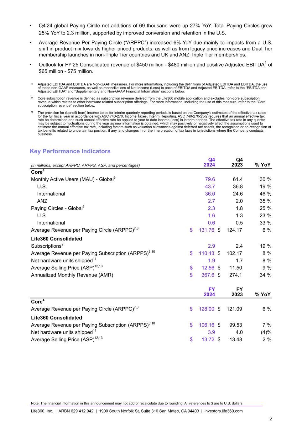• Q4’24 global Paying Circle net additions of 69 thousand were up 27% YoY. Total Paying Circles grew 25% YoY to 2.3 million, supported by improved conversion and retention in the U.S. • Average Revenue Per Paying Circle (“ARPPC”) increased 6% YoY due mainly to impacts from a U.S. shift in product mix towards higher priced products, as well as from legacy price increases and Dual Tier membership launches in non-Triple Tier countries and UK and ANZ Triple Tier memberships. • Outlook for FY’25 Consolidated revenue of $450 million - $480 million and positive Adjusted EBITDA1 of $65 million - $75 million. 1 Adjusted EBITDA and EBITDA are Non-GAAP measures. For more information, including the definitions of Adjusted EBITDA and EBITDA, the use of these non-GAAP measures, as well as reconciliations of Net Income (Loss) to each of EBITDA and Adjusted EBITDA, refer to the “EBITDA and Adjusted EBITDA” and “Supplementary and Non-GAAP Financial Information” sections below. 2 Core subscription revenue is defined as subscription revenue derived from the Life360 mobile application and excludes non-core subscription revenue which relates to other hardware related subscription offerings. For more information, including the use of this measure, refer to the “Core subscription revenue” section below. 3 The provision for (benefit from) income taxes for interim quarterly reporting periods is based on the Company's estimates of the effective tax rates for the full fiscal year in accordance with ASC 740-270, Income Taxes, Interim Reporting. ASC 740-270-25-2 requires that an annual effective tax rate be determined and such annual effective rate be applied to year to date income (loss) in interim periods. The effective tax rate in any quarter may be subject to fluctuations during the year as new information is obtained, which may positively or negatively affect the assumptions used to estimate the annual effective tax rate, including factors such as valuation allowances against deferred tax assets, the recognition or de-recognition of tax benefits related to uncertain tax position, if any, and changes in or the interpretation of tax laws in jurisdictions where the Company conducts business. Key Performance Indicators (in millions, except ARPPC, ARPPS, ASP, and percentages) Q4 2024 Q4 2023 % YoY Core4 Monthly Active Users (MAU) - Global5 79.6 61.4 30 % U.S. 43.7 36.8 19 % International 36.0 24.6 46 % ANZ 2.7 2.0 35 % Paying Circles - Global6 2.3 1.8 25 % U.S. 1.6 1.3 23 % International 0.6 0.5 33 % Average Revenue per Paying Circle (ARPPC)7,8 $ 131.76 $ 124.17 6 % Life360 Consolidated Subscriptions9 2.9 2.4 19 % Average Revenue per Paying Subscription (ARPPS)8,10 $ 110.43 $ 102.17 8 % Net hardware units shipped11 1.9 1.7 8 % Average Selling Price (ASP)12,13 $ 12.56 $ 11.50 9 % Annualized Monthly Revenue (AMR) $ 367.6 $ 274.1 34 % FY 2024 FY 2023 % YoY Core4 Average Revenue per Paying Circle (ARPPC)7,8 $ 128.00 $ 121.09 6 % Life360 Consolidated Average Revenue per Paying Subscription (ARPPS)8,10 $ 106.16 $ 99.53 7 % Net hardware units shipped11 3.9 4.0 (4) % Average Selling Price (ASP)12,13 $ 13.72 $ 13.48 2 % Note: The financial information in this announcement may not add or recalculate due to rounding. All references to $ are to U.S. dollars. Life360, Inc. | ARBN 629 412 942 | 1900 South Norfolk St, Suite 310 San Mateo, CA 94403 | investors.life360.com 2