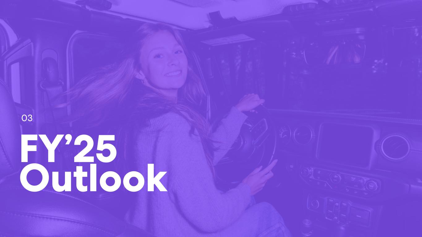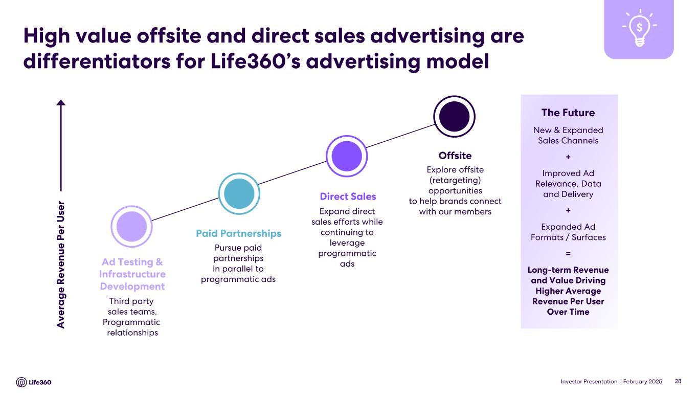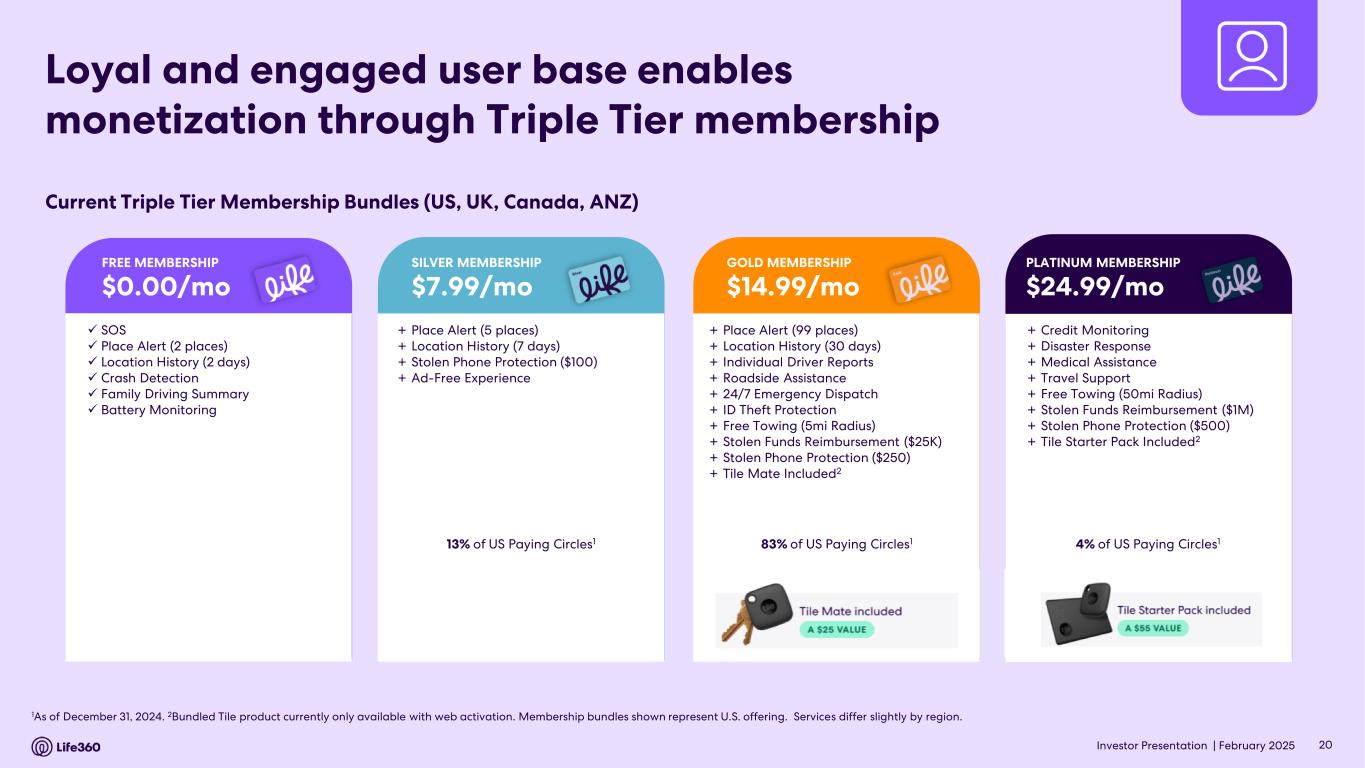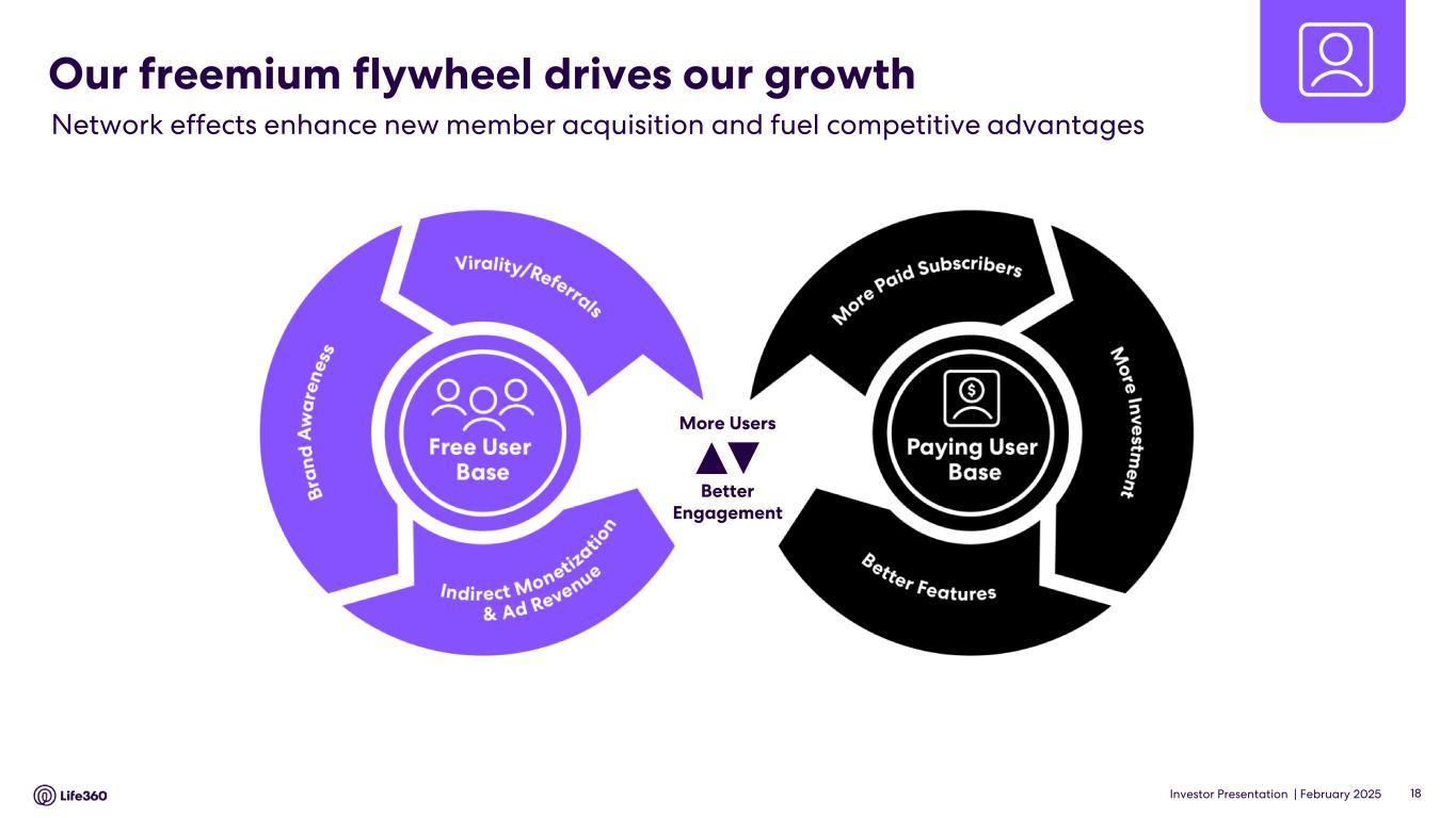 • Q4’24 global Paying Circle net additions of 69 thousand were up 27% YoY. Total Paying Circles grew 25% YoY to 2.3 million, supported by improved conversion and retention in the U.S. • Average Revenue Per Paying Circle (“ARPPC”) increased 6% YoY due mainly to impacts from a U.S. shift in product mix towards higher priced products, as well as from legacy price increases and Dual Tier membership launches in non-Triple Tier countries and UK and ANZ Triple Tier memberships. • Outlook for FY’25 Consolidated revenue of $450 million - $480 million and positive Adjusted EBITDA1 of $65 million - $75 million. 1 Adjusted EBITDA and EBITDA are Non-GAAP measures. For more information, including the definitions of Adjusted EBITDA and EBITDA, the use of these non-GAAP measures, as well as reconciliations of Net Income (Loss) to each of EBITDA and Adjusted EBITDA, refer to the “EBITDA and Adjusted EBITDA” and “Supplementary and Non-GAAP Financial Information” sections below. 2 Core subscription revenue is defined as subscription revenue derived from the Life360 mobile application and excludes non-core subscription revenue which relates to other hardware related subscription offerings. For more information, including the use of this measure, refer to the “Core subscription revenue” section below. 3 The provision for (benefit from) income taxes for interim quarterly reporting periods is based on the Company's estimates of the effective tax rates for the full fiscal year in accordance with ASC 740-270, Income Taxes, Interim Reporting. ASC 740-270-25-2 requires that an annual effective tax rate be determined and such annual effective rate be applied to year to date income (loss) in interim periods. The effective tax rate in any quarter may be subject to fluctuations during the year as new information is obtained, which may positively or negatively affect the assumptions used to estimate the annual effective tax rate, including factors such as valuation allowances against deferred tax assets, the recognition or de-recognition of tax benefits related to uncertain tax position, if any, and changes in or the interpretation of tax laws in jurisdictions where the Company conducts business. Key Performance Indicators (in millions, except ARPPC, ARPPS, ASP, and percentages) Q4 2024 Q4 2023 % YoY Core4 Monthly Active Users (MAU) - Global5 79.6 61.4 30 % U.S. 43.7 36.8 19 % International 36.0 24.6 46 % ANZ 2.7 2.0 35 % Paying Circles - Global6 2.3 1.8 25 % U.S. 1.6 1.3 23 % International 0.6 0.5 33 % Average Revenue per Paying Circle (ARPPC)7,8 $ 131.76 $ 124.17 6 % Life360 Consolidated Subscriptions9 2.9 2.4 19 % Average Revenue per Paying Subscription (ARPPS)8,10 $ 110.43 $ 102.17 8 % Net hardware units shipped11 1.9 1.7 8 % Average Selling Price (ASP)12,13 $ 12.56 $ 11.50 9 % Annualized Monthly Revenue (AMR) $ 367.6 $ 274.1 34 % FY 2024 FY 2023 % YoY Core4 Average Revenue per Paying Circle (ARPPC)7,8 $ 128.00 $ 121.09 6 % Life360 Consolidated Average Revenue per Paying Subscription (ARPPS)8,10 $ 106.16 $ 99.53 7 % Net hardware units shipped11 3.9 4.0 (4) % Average Selling Price (ASP)12,13 $ 13.72 $ 13.48 2 % Note: The financial information in this announcement may not add or recalculate due to rounding. All references to $ are to U.S. dollars. Life360, Inc. | ARBN 629 412 942 | 1900 South Norfolk St, Suite 310 San Mateo, CA 94403 | investors.life360.com 2
