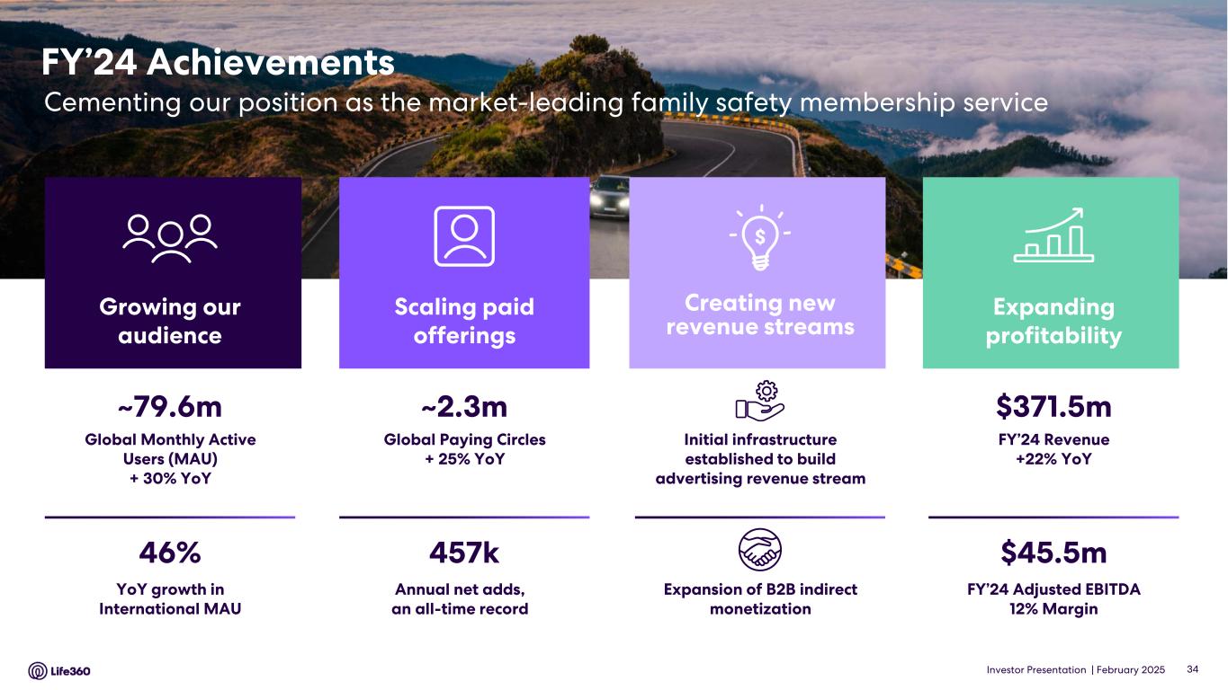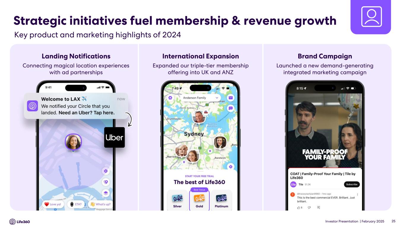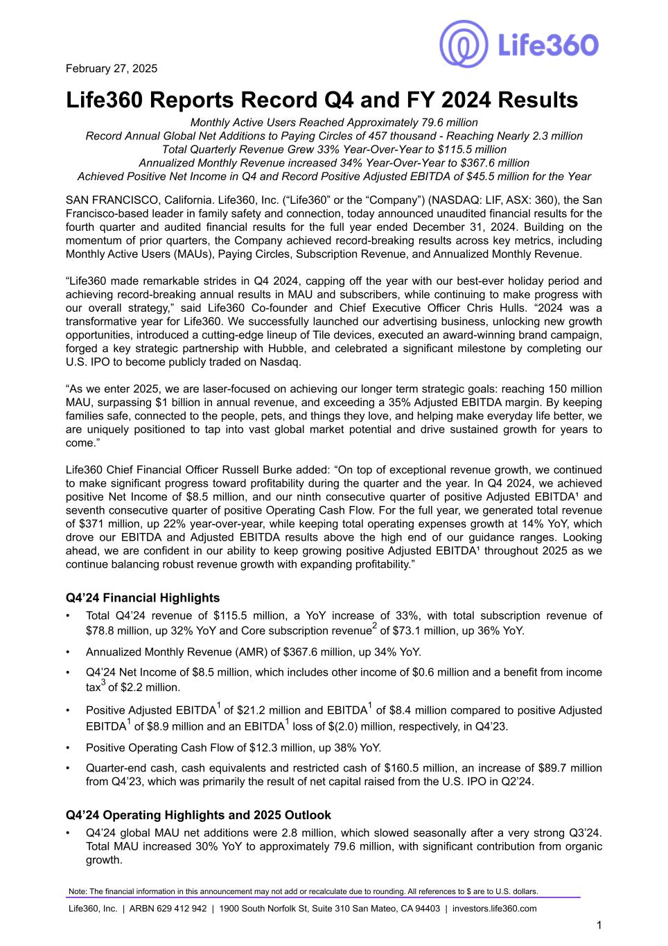 February 27, 2025 Life360 Reports Record Q4 and FY 2024 Results Monthly Active Users Reached Approximately 79.6 million Record Annual Global Net Additions to Paying Circles of 457 thousand - Reaching Nearly 2.3 million Total Quarterly Revenue Grew 33% Year-Over-Year to $115.5 million Annualized Monthly Revenue increased 34% Year-Over-Year to $367.6 million Achieved Positive Net Income in Q4 and Record Positive Adjusted EBITDA of $45.5 million for the Year SAN FRANCISCO, California. Life360, Inc. (“Life360” or the “Company”) (NASDAQ: LIF, ASX: 360), the San Francisco-based leader in family safety and connection, today announced unaudited financial results for the fourth quarter and audited financial results for the full year ended December 31, 2024. Building on the momentum of prior quarters, the Company achieved record-breaking results across key metrics, including Monthly Active Users (MAUs), Paying Circles, Subscription Revenue, and Annualized Monthly Revenue. “Life360 made remarkable strides in Q4 2024, capping off the year with our best-ever holiday period and achieving record-breaking annual results in MAU and subscribers, while continuing to make progress with our overall strategy,” said Life360 Co-founder and Chief Executive Officer Chris Hulls. “2024 was a transformative year for Life360. We successfully launched our advertising business, unlocking new growth opportunities, introduced a cutting-edge lineup of Tile devices, executed an award-winning brand campaign, forged a key strategic partnership with Hubble, and celebrated a significant milestone by completing our U.S. IPO to become publicly traded on Nasdaq. “As we enter 2025, we are laser-focused on achieving our longer term strategic goals: reaching 150 million MAU, surpassing $1 billion in annual revenue, and exceeding a 35% Adjusted EBITDA margin. By keeping families safe, connected to the people, pets, and things they love, and helping make everyday life better, we are uniquely positioned to tap into vast global market potential and drive sustained growth for years to come.” Life360 Chief Financial Officer Russell Burke added: “On top of exceptional revenue growth, we continued to make significant progress toward profitability during the quarter and the year. In Q4 2024, we achieved positive Net Income of $8.5 million, and our ninth consecutive quarter of positive Adjusted EBITDA¹ and seventh consecutive quarter of positive Operating Cash Flow. For the full year, we generated total revenue of $371 million, up 22% year-over-year, while keeping total operating expenses growth at 14% YoY, which drove our EBITDA and Adjusted EBITDA results above the high end of our guidance ranges. Looking ahead, we are confident in our ability to keep growing positive Adjusted EBITDA¹ throughout 2025 as we continue balancing robust revenue growth with expanding profitability.” Q4’24 Financial Highlights • Total Q4’24 revenue of $115.5 million, a YoY increase of 33%, with total subscription revenue of $78.8 million, up 32% YoY and Core subscription revenue2 of $73.1 million, up 36% YoY. • Annualized Monthly Revenue (AMR) of $367.6 million, up 34% YoY. • Q4’24 Net Income of $8.5 million, which includes other income of $0.6 million and a benefit from income tax3 of $2.2 million. • Positive Adjusted EBITDA1 of $21.2 million and EBITDA1 of $8.4 million compared to positive Adjusted EBITDA1 of $8.9 million and an EBITDA1 loss of $(2.0) million, respectively, in Q4’23. • Positive Operating Cash Flow of $12.3 million, up 38% YoY. • Quarter-end cash, cash equivalents and restricted cash of $160.5 million, an increase of $89.7 million from Q4’23, which was primarily the result of net capital raised from the U.S. IPO in Q2’24. Q4’24 Operating Highlights and 2025 Outlook • Q4’24 global MAU net additions were 2.8 million, which slowed seasonally after a very strong Q3’24. Total MAU increased 30% YoY to approximately 79.6 million, with significant contribution from organic growth. Note: The financial information in this announcement may not add or recalculate due to rounding. All references to $ are to U.S. dollars. Life360, Inc. | ARBN 629 412 942 | 1900 South Norfolk St, Suite 310 San Mateo, CA 94403 | investors.life360.com 1