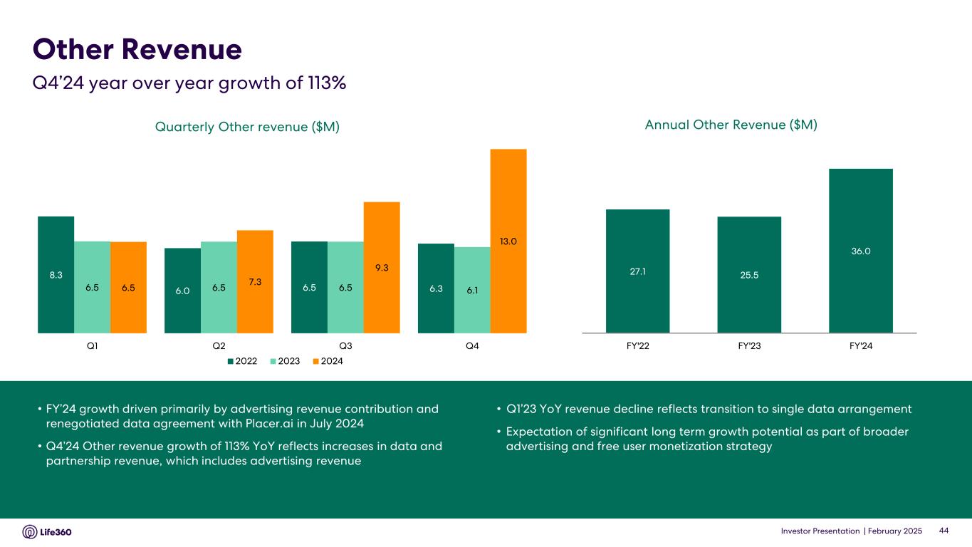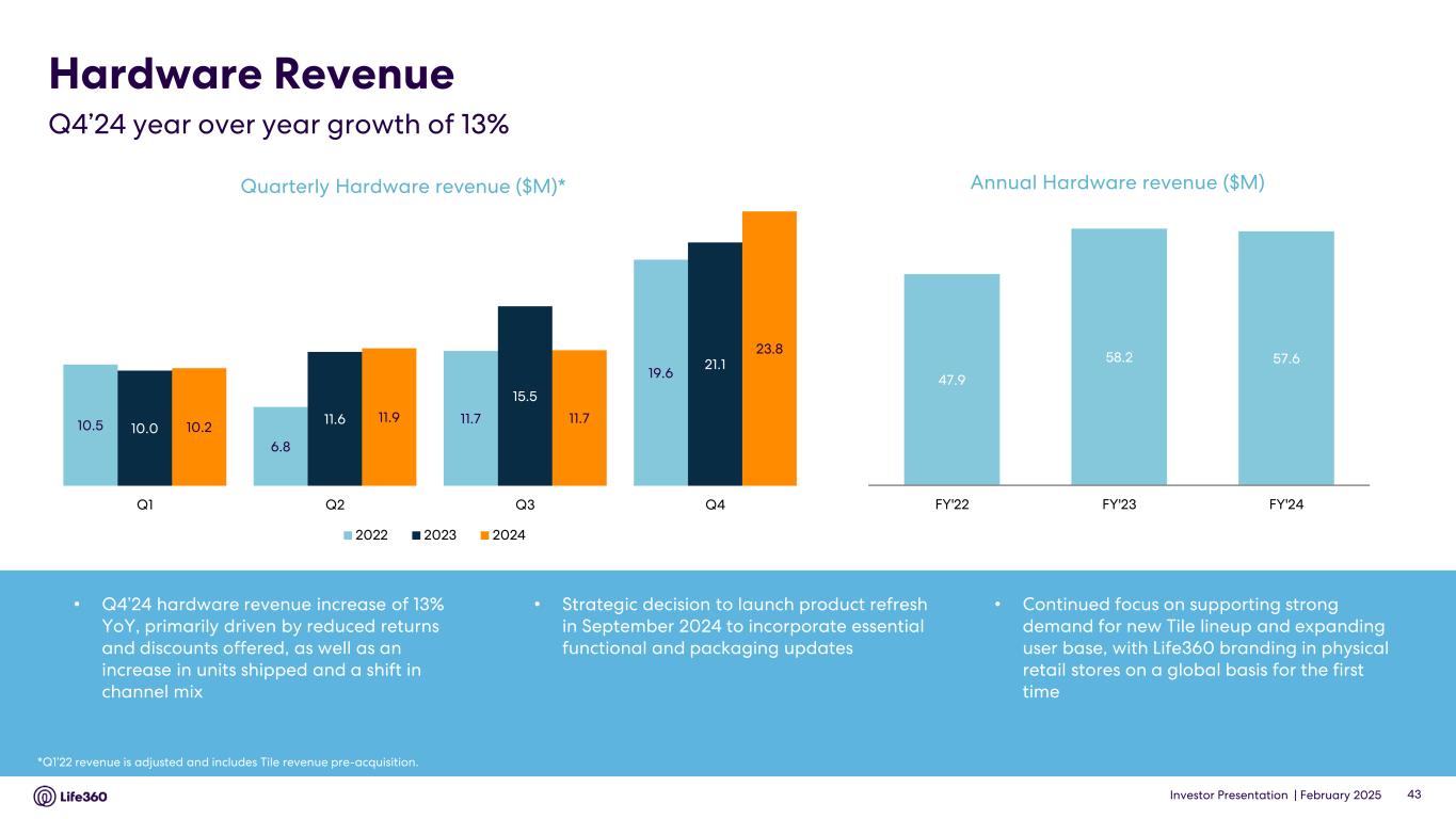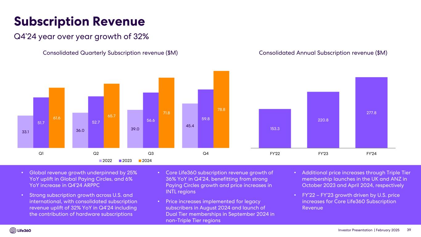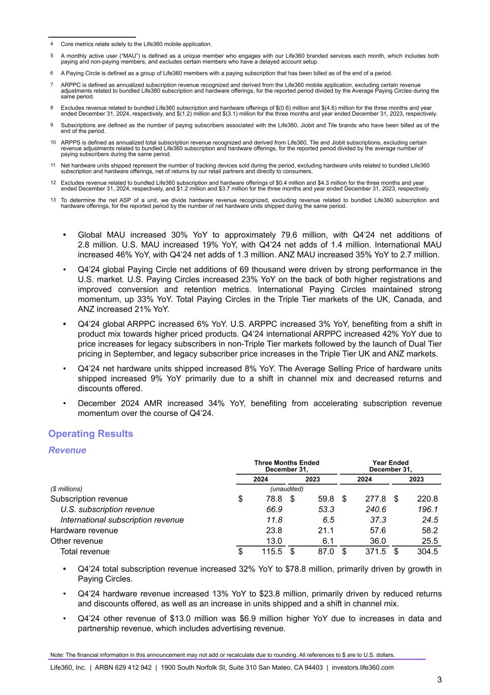 4 Core metrics relate solely to the Life360 mobile application. 5 A monthly active user (“MAU”) is defined as a unique member who engages with our Life360 branded services each month, which includes both paying and non-paying members, and excludes certain members who have a delayed account setup. 6 A Paying Circle is defined as a group of Life360 members with a paying subscription that has been billed as of the end of a period. 7 ARPPC is defined as annualized subscription revenue recognized and derived from the Life360 mobile application, excluding certain revenue adjustments related to bundled Life360 subscription and hardware offerings, for the reported period divided by the Average Paying Circles during the same period. 8 Excludes revenue related to bundled Life360 subscription and hardware offerings of $(0.6) million and $(4.6) million for the three months and year ended December 31, 2024, respectively, and $(1.2) million and $(3.1) million for the three months and year ended December 31, 2023, respectively. 9 Subscriptions are defined as the number of paying subscribers associated with the Life360, Jiobit and Tile brands who have been billed as of the end of the period. 10 ARPPS is defined as annualized total subscription revenue recognized and derived from Life360, Tile and Jiobit subscriptions, excluding certain revenue adjustments related to bundled Life360 subscription and hardware offerings, for the reported period divided by the average number of paying subscribers during the same period. 11 Net hardware units shipped represent the number of tracking devices sold during the period, excluding hardware units related to bundled Life360 subscription and hardware offerings, net of returns by our retail partners and directly to consumers. 12 Excludes revenue related to bundled Life360 subscription and hardware offerings of $0.4 million and $4.3 million for the three months and year ended December 31, 2024, respectively, and $1.2 million and $3.7 million for the three months and year ended December 31, 2023, respectively. 13 To determine the net ASP of a unit, we divide hardware revenue recognized, excluding revenue related to bundled Life360 subscription and hardware offerings, for the reported period by the number of net hardware units shipped during the same period. • Global MAU increased 30% YoY to approximately 79.6 million, with Q4’24 net additions of 2.8 million. U.S. MAU increased 19% YoY, with Q4’24 net adds of 1.4 million. International MAU increased 46% YoY, with Q4’24 net adds of 1.3 million. ANZ MAU increased 35% YoY to 2.7 million. • Q4’24 global Paying Circle net additions of 69 thousand were driven by strong performance in the U.S. market. U.S. Paying Circles increased 23% YoY on the back of both higher registrations and improved conversion and retention metrics. International Paying Circles maintained strong momentum, up 33% YoY. Total Paying Circles in the Triple Tier markets of the UK, Canada, and ANZ increased 21% YoY. • Q4’24 global ARPPC increased 6% YoY. U.S. ARPPC increased 3% YoY, benefiting from a shift in product mix towards higher priced products. Q4’24 international ARPPC increased 42% YoY due to price increases for legacy subscribers in non-Triple Tier markets followed by the launch of Dual Tier pricing in September, and legacy subscriber price increases in the Triple Tier UK and ANZ markets. • Q4’24 net hardware units shipped increased 8% YoY. The Average Selling Price of hardware units shipped increased 9% YoY primarily due to a shift in channel mix and decreased returns and discounts offered. • December 2024 AMR increased 34% YoY, benefiting from accelerating subscription revenue momentum over the course of Q4’24. Operating Results Revenue Three Months Ended December 31, Year Ended December 31, 2024 2023 2024 2023 ($ millions) (unaudited) Subscription revenue $ 78.8 $ 59.8 $ 277.8 $ 220.8 U.S. subscription revenue 66.9 53.3 240.6 196.1 International subscription revenue 11.8 6.5 37.3 24.5 Hardware revenue 23.8 21.1 57.6 58.2 Other revenue 13.0 6.1 36.0 25.5 Total revenue $ 115.5 $ 87.0 $ 371.5 $ 304.5 • Q4’24 total subscription revenue increased 32% YoY to $78.8 million, primarily driven by growth in Paying Circles. • Q4’24 hardware revenue increased 13% YoY to $23.8 million, primarily driven by reduced returns and discounts offered, as well as an increase in units shipped and a shift in channel mix. • Q4’24 other revenue of $13.0 million was $6.9 million higher YoY due to increases in data and partnership revenue, which includes advertising revenue. Note: The financial information in this announcement may not add or recalculate due to rounding. All references to $ are to U.S. dollars. Life360, Inc. | ARBN 629 412 942 | 1900 South Norfolk St, Suite 310 San Mateo, CA 94403 | investors.life360.com 3