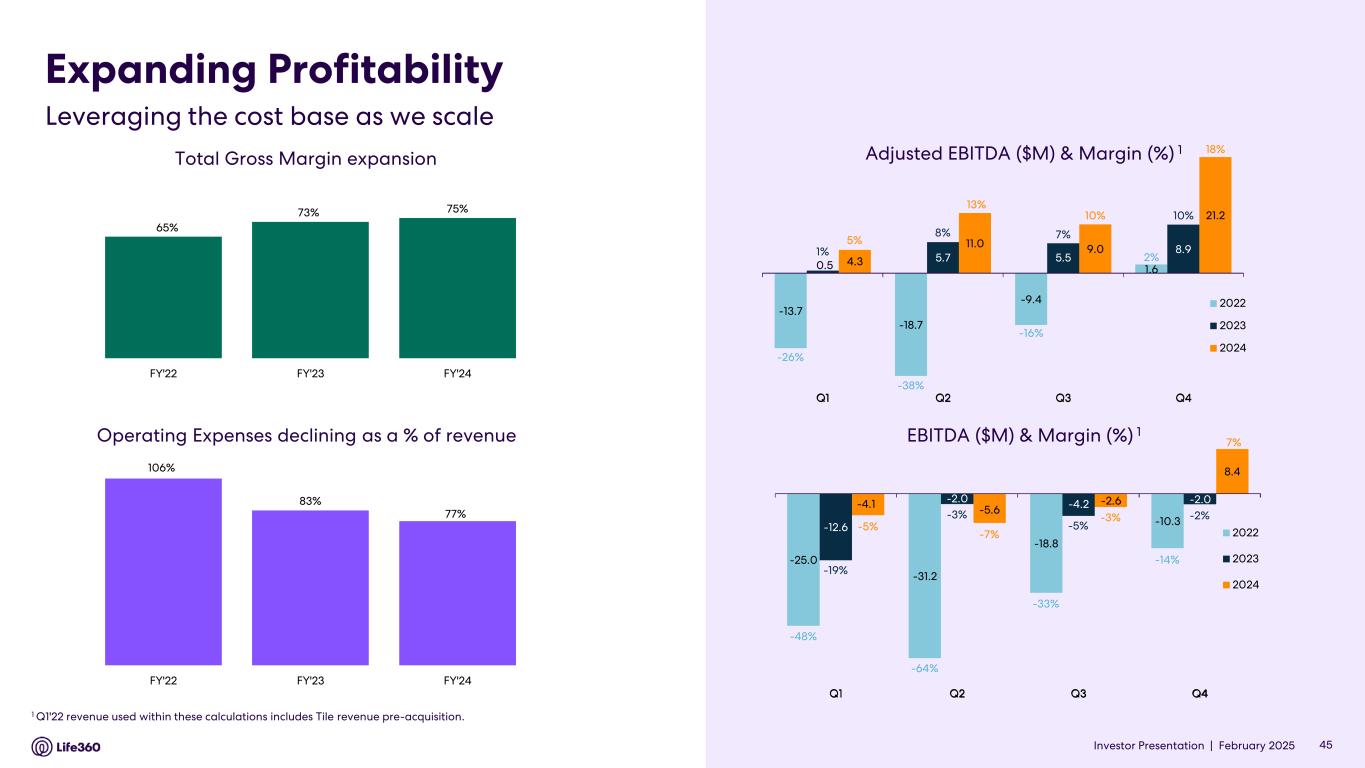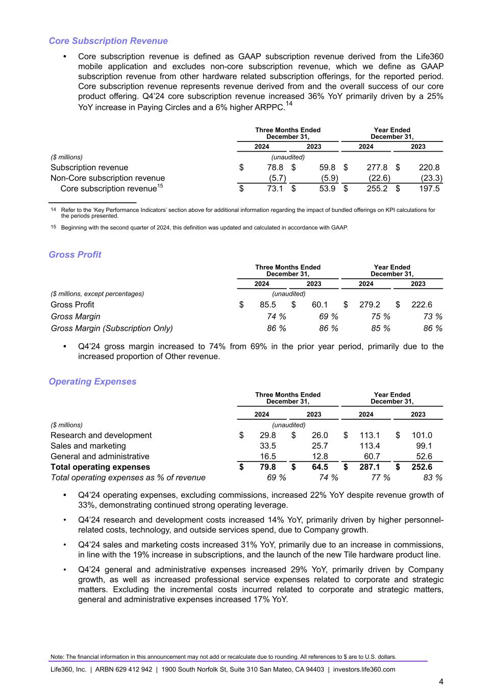 Core Subscription Revenue • Core subscription revenue is defined as GAAP subscription revenue derived from the Life360 mobile application and excludes non-core subscription revenue, which we define as GAAP subscription revenue from other hardware related subscription offerings, for the reported period. Core subscription revenue represents revenue derived from and the overall success of our core product offering. Q4’24 core subscription revenue increased 36% YoY primarily driven by a 25% YoY increase in Paying Circles and a 6% higher ARPPC.14 Three Months Ended December 31, Year Ended December 31, 2024 2023 2024 2023 ($ millions) (unaudited) Subscription revenue $ 78.8 $ 59.8 $ 277.8 $ 220.8 Non-Core subscription revenue (5.7) (5.9) (22.6) (23.3) Core subscription revenue15 $ 73.1 $ 53.9 $ 255.2 $ 197.5 14 Refer to the ‘Key Performance Indicators’ section above for additional information regarding the impact of bundled offerings on KPI calculations for the periods presented. 15 Beginning with the second quarter of 2024, this definition was updated and calculated in accordance with GAAP. Gross Profit Three Months Ended December 31, Year Ended December 31, 2024 2023 2024 2023 ($ millions, except percentages) (unaudited) Gross Profit $ 85.5 $ 60.1 $ 279.2 $ 222.6 Gross Margin 74 % 69 % 75 % 73 % Gross Margin (Subscription Only) 86 % 86 % 85 % 86 % • Q4’24 gross margin increased to 74% from 69% in the prior year period, primarily due to the increased proportion of Other revenue. Operating Expenses Three Months Ended December 31, Year Ended December 31, 2024 2023 2024 2023 ($ millions) (unaudited) Research and development $ 29.8 $ 26.0 $ 113.1 $ 101.0 Sales and marketing 33.5 25.7 113.4 99.1 General and administrative 16.5 12.8 60.7 52.6 Total operating expenses $ 79.8 $ 64.5 $ 287.1 $ 252.6 Total operating expenses as % of revenue 69 % 74 % 77 % 83 % • Q4’24 operating expenses, excluding commissions, increased 22% YoY despite revenue growth of 33%, demonstrating continued strong operating leverage. • Q4’24 research and development costs increased 14% YoY, primarily driven by higher personnel- related costs, technology, and outside services spend, due to Company growth. • Q4’24 sales and marketing costs increased 31% YoY, primarily due to an increase in commissions, in line with the 19% increase in subscriptions, and the launch of the new Tile hardware product line. • Q4’24 general and administrative expenses increased 29% YoY, primarily driven by Company growth, as well as increased professional service expenses related to corporate and strategic matters. Excluding the incremental costs incurred related to corporate and strategic matters, general and administrative expenses increased 17% YoY. Note: The financial information in this announcement may not add or recalculate due to rounding. All references to $ are to U.S. dollars. Life360, Inc. | ARBN 629 412 942 | 1900 South Norfolk St, Suite 310 San Mateo, CA 94403 | investors.life360.com 4
