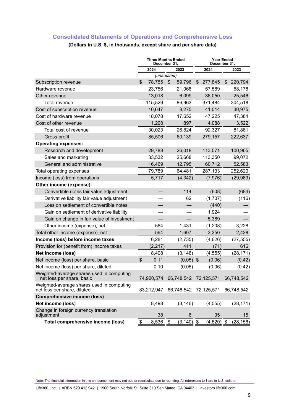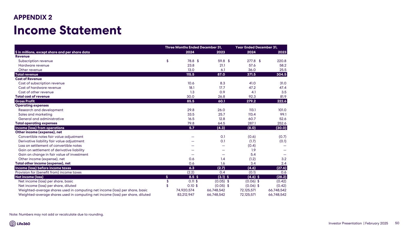 Consolidated Statements of Operations and Comprehensive Loss (Dollars in U.S. $, in thousands, except share and per share data) Three Months Ended December 31, Year Ended December 31, 2024 2023 2024 2023 (unaudited) Subscription revenue $ 78,755 $ 59,796 $ 277,845 $ 220,794 Hardware revenue 23,756 21,068 57,589 58,178 Other revenue 13,018 6,099 36,050 25,546 Total revenue 115,529 86,963 371,484 304,518 Cost of subscription revenue 10,647 8,275 41,014 30,975 Cost of hardware revenue 18,078 17,652 47,225 47,384 Cost of other revenue 1,298 897 4,088 3,522 Total cost of revenue 30,023 26,824 92,327 81,881 Gross profit 85,506 60,139 279,157 222,637 Operating expenses: Research and development 29,788 26,018 113,071 100,965 Sales and marketing 33,532 25,668 113,350 99,072 General and administrative 16,469 12,795 60,712 52,583 Total operating expenses 79,789 64,481 287,133 252,620 Income (loss) from operations 5,717 (4,342) (7,976) (29,983) Other income (expense): Convertible notes fair value adjustment — 114 (608) (684) Derivative liability fair value adjustment — 62 (1,707) (116) Loss on settlement of convertible notes — — (440) — Gain on settlement of derivative liability — — 1,924 — Gain on change in fair value of investment — — 5,389 — Other income (expense), net 564 1,431 (1,208) 3,228 Total other income (expense), net 564 1,607 3,350 2,428 Income (loss) before income taxes 6,281 (2,735) (4,626) (27,555) Provision for (benefit from) income taxes (2,217) 411 (71) 616 Net income (loss) 8,498 — (3,146) (4,555) (28,171) Net income (loss) per share, basic $ 0.11 (0.05) $ (0.06) (0.42) Net income (loss) per share, diluted 0.10 (0.05) (0.06) (0.42) Weighted-average shares used in computing net loss per share, basic 74,920,574 66,748,542 72,125,571 66,748,542 Weighted-average shares used in computing net loss per share, diluted 83,212,947 66,748,542 72,125,571 66,748,542 Comprehensive income (loss) Net income (loss) 8,498 (3,146) (4,555) (28,171) Change in foreign currency translation adjustment 38 6 35 15 Total comprehensive income (loss) $ 8,536 $ (3,140) $ (4,520) $ (28,156) Note: The financial information in this announcement may not add or recalculate due to rounding. All references to $ are to U.S. dollars. Life360, Inc. | ARBN 629 412 942 | 1900 South Norfolk St, Suite 310 San Mateo, CA 94403 | investors.life360.com 9