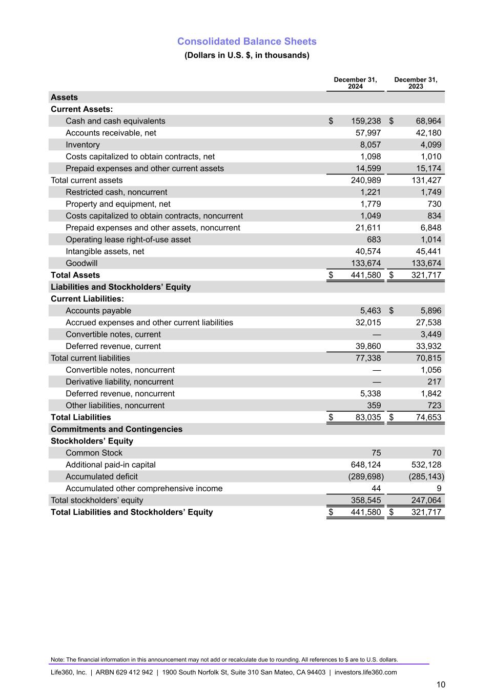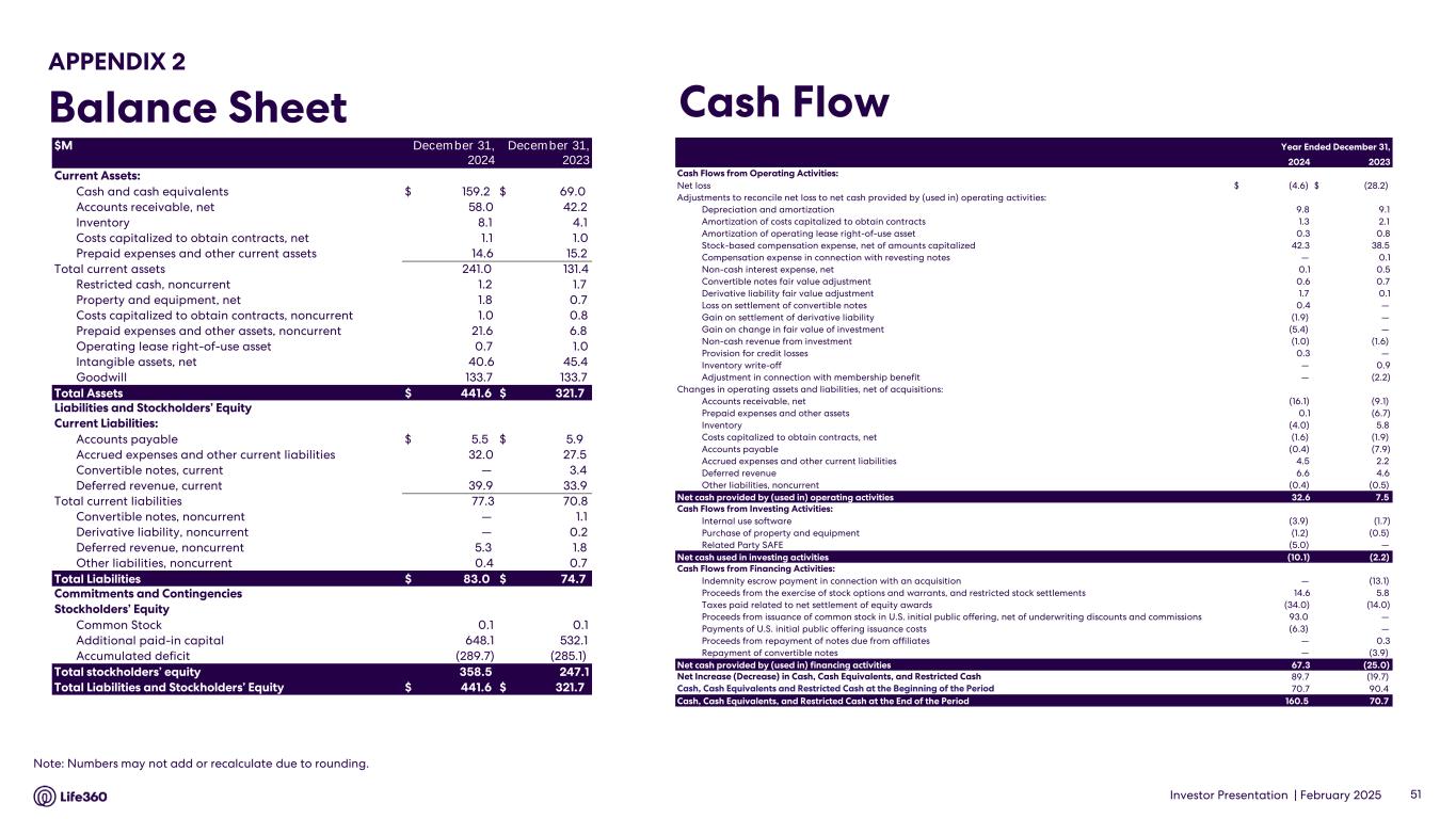 Consolidated Balance Sheets (Dollars in U.S. $, in thousands) December 31, 2024 December 31, 2023 Assets Current Assets: Cash and cash equivalents $ 159,238 $ 68,964 Accounts receivable, net 57,997 42,180 Inventory 8,057 4,099 Costs capitalized to obtain contracts, net 1,098 1,010 Prepaid expenses and other current assets 14,599 15,174 Total current assets 240,989 131,427 Restricted cash, noncurrent 1,221 1,749 Property and equipment, net 1,779 730 Costs capitalized to obtain contracts, noncurrent 1,049 834 Prepaid expenses and other assets, noncurrent 21,611 6,848 Operating lease right-of-use asset 683 1,014 Intangible assets, net 40,574 45,441 Goodwill 133,674 133,674 Total Assets $ 441,580 $ 321,717 Liabilities and Stockholders’ Equity Current Liabilities: Accounts payable 5,463 $ 5,896 Accrued expenses and other current liabilities 32,015 27,538 Convertible notes, current — 3,449 Deferred revenue, current 39,860 33,932 Total current liabilities 77,338 70,815 Convertible notes, noncurrent — 1,056 Derivative liability, noncurrent — 217 Deferred revenue, noncurrent 5,338 1,842 Other liabilities, noncurrent 359 723 Total Liabilities $ 83,035 $ 74,653 Commitments and Contingencies Stockholders’ Equity Common Stock 75 70 Additional paid-in capital 648,124 532,128 Accumulated deficit (289,698) (285,143) Accumulated other comprehensive income 44 9 Total stockholders’ equity 358,545 247,064 Total Liabilities and Stockholders’ Equity $ 441,580 $ 321,717 Note: The financial information in this announcement may not add or recalculate due to rounding. All references to $ are to U.S. dollars. Life360, Inc. | ARBN 629 412 942 | 1900 South Norfolk St, Suite 310 San Mateo, CA 94403 | investors.life360.com 10