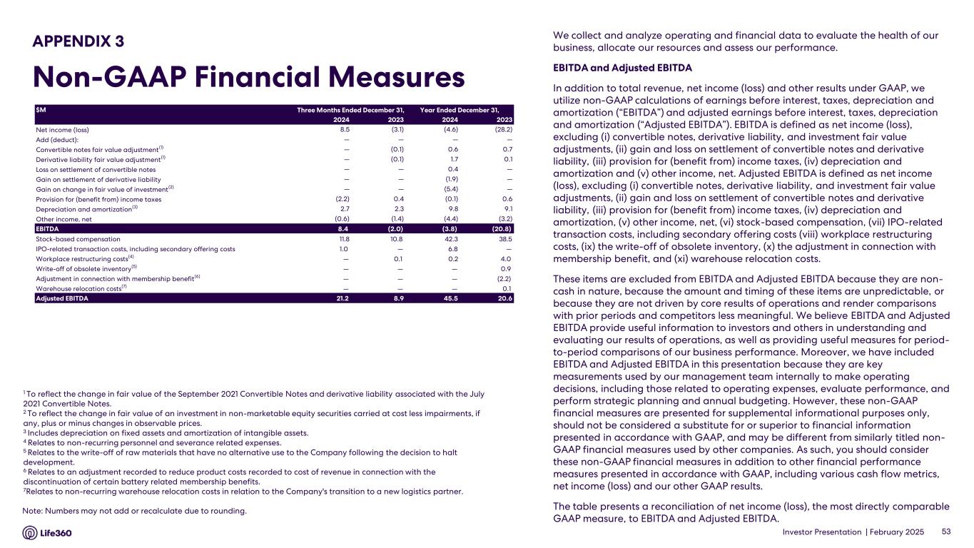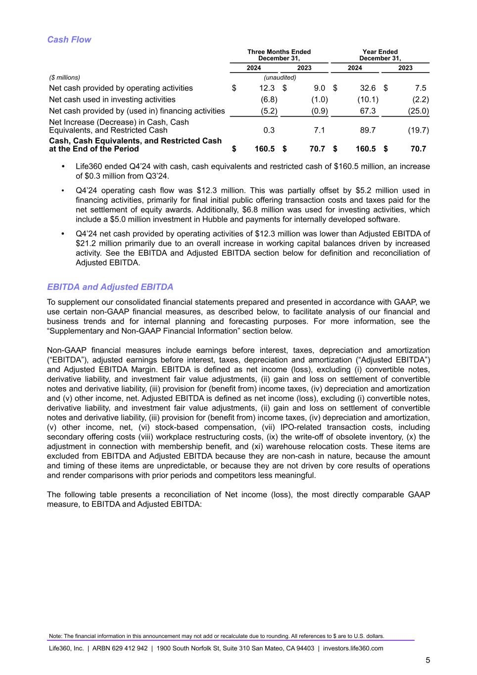 Cash Flow Three Months Ended December 31, Year Ended December 31, 2024 2023 2024 2023 ($ millions) (unaudited) Net cash provided by operating activities $ 12.3 $ 9.0 $ 32.6 $ 7.5 Net cash used in investing activities (6.8) (1.0) (10.1) (2.2) Net cash provided by (used in) financing activities (5.2) (0.9) 67.3 (25.0) Net Increase (Decrease) in Cash, Cash Equivalents, and Restricted Cash 0.3 7.1 89.7 (19.7) Cash, Cash Equivalents, and Restricted Cash at the End of the Period $ 160.5 $ 70.7 $ 160.5 $ 70.7 • Life360 ended Q4’24 with cash, cash equivalents and restricted cash of $160.5 million, an increase of $0.3 million from Q3’24. • Q4’24 operating cash flow was $12.3 million. This was partially offset by $5.2 million used in financing activities, primarily for final initial public offering transaction costs and taxes paid for the net settlement of equity awards. Additionally, $6.8 million was used for investing activities, which include a $5.0 million investment in Hubble and payments for internally developed software. • Q4’24 net cash provided by operating activities of $12.3 million was lower than Adjusted EBITDA of $21.2 million primarily due to an overall increase in working capital balances driven by increased activity. See the EBITDA and Adjusted EBITDA section below for definition and reconciliation of Adjusted EBITDA. EBITDA and Adjusted EBITDA To supplement our consolidated financial statements prepared and presented in accordance with GAAP, we use certain non-GAAP financial measures, as described below, to facilitate analysis of our financial and business trends and for internal planning and forecasting purposes. For more information, see the “Supplementary and Non-GAAP Financial Information” section below. Non-GAAP financial measures include earnings before interest, taxes, depreciation and amortization (“EBITDA”), adjusted earnings before interest, taxes, depreciation and amortization (“Adjusted EBITDA”) and Adjusted EBITDA Margin. EBITDA is defined as net income (loss), excluding (i) convertible notes, derivative liability, and investment fair value adjustments, (ii) gain and loss on settlement of convertible notes and derivative liability, (iii) provision for (benefit from) income taxes, (iv) depreciation and amortization and (v) other income, net. Adjusted EBITDA is defined as net income (loss), excluding (i) convertible notes, derivative liability, and investment fair value adjustments, (ii) gain and loss on settlement of convertible notes and derivative liability, (iii) provision for (benefit from) income taxes, (iv) depreciation and amortization, (v) other income, net, (vi) stock-based compensation, (vii) IPO-related transaction costs, including secondary offering costs (viii) workplace restructuring costs, (ix) the write-off of obsolete inventory, (x) the adjustment in connection with membership benefit, and (xi) warehouse relocation costs. These items are excluded from EBITDA and Adjusted EBITDA because they are non-cash in nature, because the amount and timing of these items are unpredictable, or because they are not driven by core results of operations and render comparisons with prior periods and competitors less meaningful. The following table presents a reconciliation of Net income (loss), the most directly comparable GAAP measure, to EBITDA and Adjusted EBITDA: Note: The financial information in this announcement may not add or recalculate due to rounding. All references to $ are to U.S. dollars. Life360, Inc. | ARBN 629 412 942 | 1900 South Norfolk St, Suite 310 San Mateo, CA 94403 | investors.life360.com 5