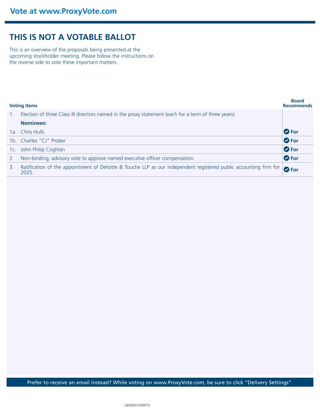 THIS IS NOT A VOTABLE BALLOT This is an overview of the proposals being presented at the upcoming stockholder meeting. Please follow the instructions on the reverse side to vote these important matters. Vote at www.ProxyVote.com Prefer to receive an email instead? While voting on www.ProxyVote.com, be sure to click “Delivery Settings”. Voting Items Board Recommends V69093-P29915 1. Election of three Class III directors named in the proxy statement (each for a term of three years). Nominees: 1a. Chris Hulls For 1b. Charles “CJ” Prober For 1c. John Philip Coghlan For 2. Non-binding, advisory vote to approve named executive officer compensation. For 3. Ratification of the appointment of Deloitte & Touche LLP as our independent registered public accounting firm for 2025. For
