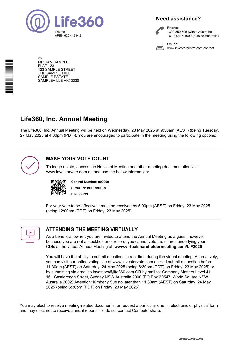 SRN/HIN: I9999999999 Phone: 1300 850 505 (within Australia) +61 3 9415 4000 (outside Australia) Online: www.investorcentre.com/contact Need assistance? Life360 ARBN 629 412 942 Life360, Inc. Annual Meeting Control Number: 999999 PIN: 99999 The Life360, Inc. Annual Meeting will be held on Wednesday, 28 May 2025 at 9:30am (AEST) (being Tuesday, 27 May 2025 at 4:30pm (PDT)). You are encouraged to participate in the meeting using the following options: To lodge a vote, access the Notice of Meeting and other meeting documentation visit www.investorvote.com.au and use the below information: MAKE YOUR VOTE COUNT For your vote to be effective it must be received by 5:00pm (AEST) on Friday, 23 May 2025 (being 12:00am (PDT) on Friday, 23 May 2025). ATTENDING THE MEETING VIRTUALLY As a beneficial owner, you are invited to attend the Annual Meeting as a guest, however because you are not a stockholder of record, you cannot vote the shares underlying your CDIs at the virtual Annual Meeting at: www.virtualshareholdermeeting.com/LIF2025 You will have the ability to submit questions in real-time during the virtual meeting. Alternatively, you can visit our online voting site at www.investorvote.com.au and submit a question before 11:30am (AEST) on Saturday, 24 May 2025 (being 6:30pm (PDT) on Friday, 23 May 2025) or by submitting via email to investors@life360.com OR by mail to: Company Matters Level 41, 161 Castlereagh Street, Sydney NSW Australia 2000 (PO Box 20547, World Square NSW Australia 2002) Attention: Kimberly Sue no later than 11:30am (AEST) on Saturday, 24 May 2025 (being 6:30pm (PDT) on Friday, 23 May 2025) You may elect to receive meeting-related documents, or request a particular one, in electronic or physical form and may elect not to receive annual reports. To do so, contact Computershare. 360 MR SAM SAMPLE FLAT 123 123 SAMPLE STREET THE SAMPLE HILL SAMPLE ESTATE SAMPLEVILLE VIC 3030 Samples/000001/000001 * L 0 0 0 0 0 1 *