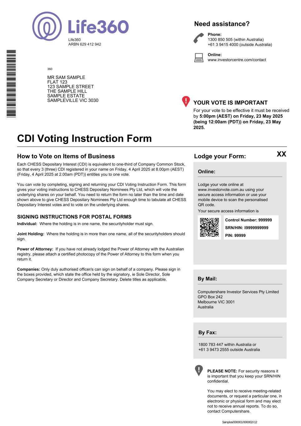 SRN/HIN: I9999999999 360 MR SAM SAMPLE FLAT 123 123 SAMPLE STREET THE SAMPLE HILL SAMPLE ESTATE SAMPLEVILLE VIC 3030 Life360 ARBN 629 412 942 Each CHESS Depositary Interest (CDI) is equivalent to one-third of Company Common Stock, so that every 3 (three) CDI registered in your name on Friday, 4 April 2025 at 8.00pm (AEST) (Friday, 4 April 2025 at 2.00am (PDT)) entitles you to one vote. You can vote by completing, signing and returning your CDI Voting Instruction Form. This form gives your voting instructions to CHESS Depositary Nominees Pty Ltd, which will vote the underlying shares on your behalf. You need to return the form no later than the time and date shown above to give CHESS Depositary Nominees Pty Ltd enough time to tabulate all CHESS Depositary Interest votes and to vote on the underlying shares. For your vote to be effective it must be received by 5:00pm (AEST) on Friday, 23 May 2025 (being 12:00am (PDT)) on Friday, 23 May 2025. YOUR VOTE IS IMPORTANT Phone: 1300 850 505 (within Australia) +61 3 9415 4000 (outside Australia) Online: www.investorcentre.com/contact Need assistance? CDI Voting Instruction Form Lodge your Form: Online: Lodge your vote online at www.investorvote.com.au using your secure access information or use your mobile device to scan the personalised QR code. Your secure access information is By Mail: Computershare Investor Services Pty Limited GPO Box 242 Melbourne VIC 3001 Australia By Fax: 1800 783 447 within Australia or +61 3 9473 2555 outside Australia PLEASE NOTE: For security reasons it is important that you keep your SRN/HIN confidential. How to Vote on Items of Business SIGNING INSTRUCTIONS FOR POSTAL FORMS XX Control Number: 999999 PIN: 99999 Individual: Where the holding is in one name, the securityholder must sign. Joint Holding: Where the holding is in more than one name, all of the securityholders should sign. Power of Attorney: If you have not already lodged the Power of Attorney with the Australian registry, please attach a certified photocopy of the Power of Attorney to this form when you return it. Companies: Only duly authorised officer/s can sign on behalf of a company. Please sign in the boxes provided, which state the office held by the signatory, ie Sole Director, Sole Company Secretary or Director and Company Secretary. Delete titles as applicable. You may elect to receive meeting-related documents, or request a particular one, in electronic or physical form and may elect not to receive annual reports. To do so, contact Computershare. Samples/000001/000002/i12 * M 0 0 0 0 0 1 1 2 Q 0 2 *