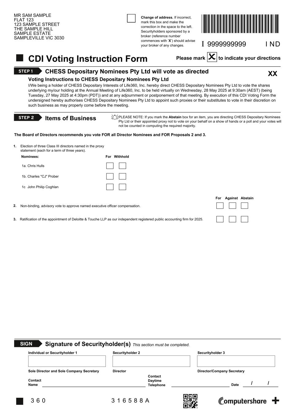 I 9999999999 Change of address. If incorrect, mark this box and make the correction in the space to the left. Securityholders sponsored by a broker (reference number commences with ‘X’) should advise your broker of any changes. CDI Voting Instruction Form Please mark to indicate your directions CHESS Depositary Nominees Pty Ltd will vote as directed Voting Instructions to CHESS Depositary Nominees Pty Ltd STEP 1 I/We being a holder of CHESS Depositary Interests of Life360, Inc. hereby direct CHESS Depositary Nominees Pty Ltd to vote the shares underlying my/our holding at the Annual Meeting of Life360, Inc. to be held virtually on Wednesday, 28 May 2025 at 9:30am (AEST) (being Tuesday, 27 May 2025 at 4:30pm (PDT)) and at any adjournment or postponement of that meeting. By execution of this CDI Voting Form the undersigned hereby authorises CHESS Depositary Nominees Pty Ltd to appoint such proxies or their substitutes to vote in their discretion on such business as may properly come before the meeting. STEP 2 Items of Business PLEASE NOTE: If you mark the Abstain box for an item, you are directing CHESS Depositary Nominees Pty Ltd or their appointed proxy not to vote on your behalf on a show of hands or a poll and your votes will not be counted in computing the required majority. SIGN Signature of Securityholder(s) This section must be completed. Individual or Securityholder 1 Securityholder 2 Securityholder 3 Sole Director and Sole Company Secretary Director Director/Company Secretary Contact Name Contact Daytime Telephone Date I ND MR SAM SAMPLE FLAT 123 123 SAMPLE STREET THE SAMPLE HILL SAMPLE ESTATE SAMPLEVILLE VIC 3030 3 6 0 3 1 6 5 8 8 A / / XX The Board of Directors recommends you vote FOR all Director Nominees and FOR Proposals 2 and 3. Election of three Class III directors named in the proxy statement (each for a term of three years). Chris Hulls1a. 2. Ratification of the appointment of Deloitte & Touche LLP as our independent registered public accounting firm for 2025. 1. Non-binding, advisory vote to approve named executive officer compensation. 3. Charles "CJ" Prober1b. John Philip Coghlan1c For WithholdNominees: For Against Abstain