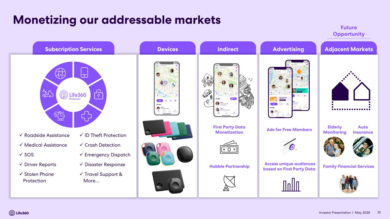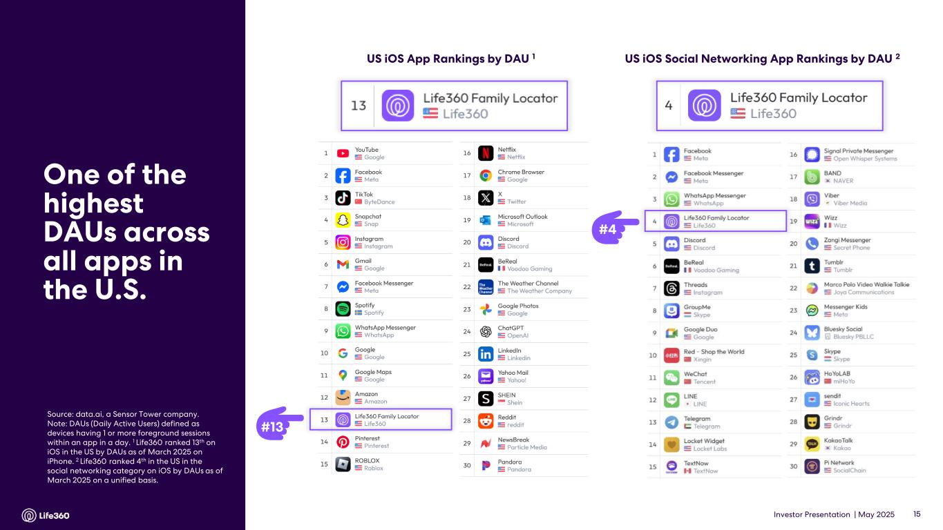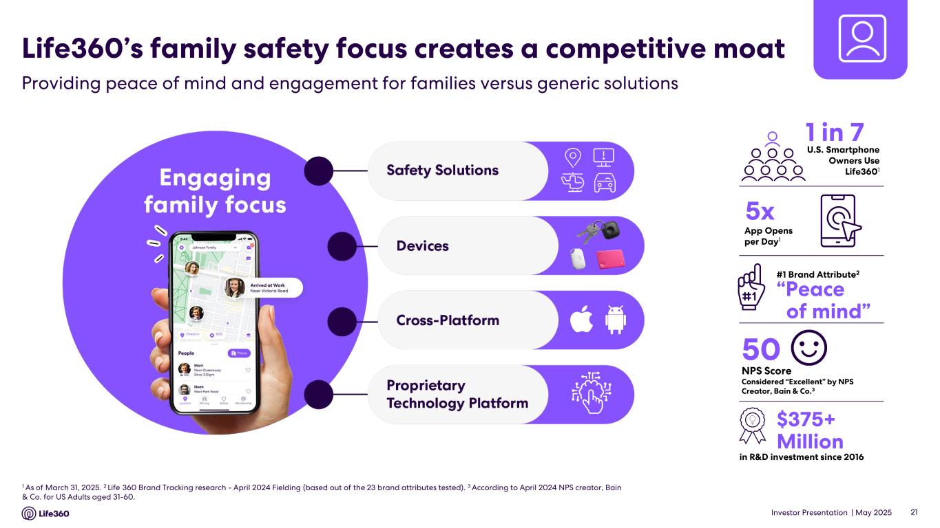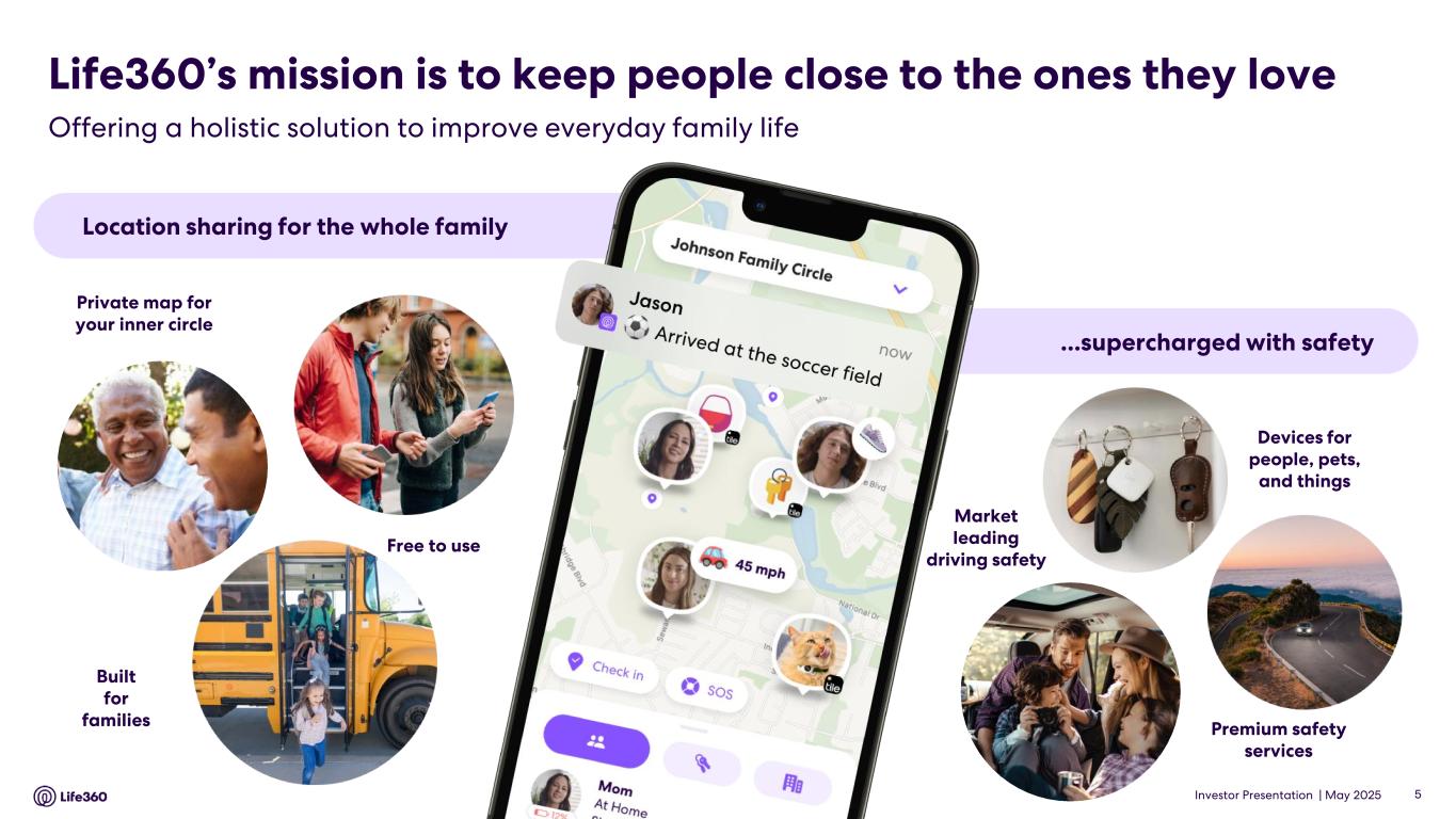 Investor Presentation | May 2025 Offering a holistic solution to improve everyday family life Location sharing for the whole family ...supercharged with safety Private map for your inner circle Free to use Built for families Devices for people, pets, and things Premium safety services Market leading driving safety Life360’s mission is to keep people close to the ones they love 5