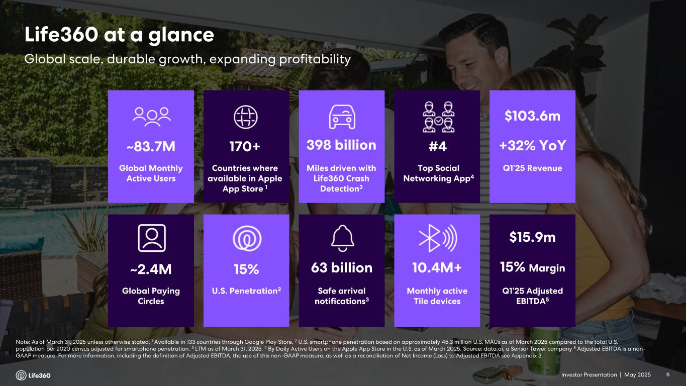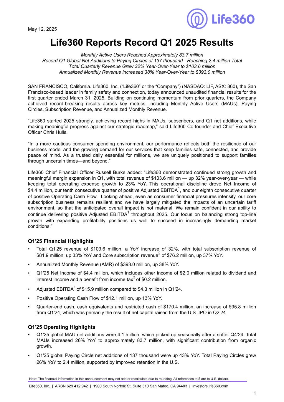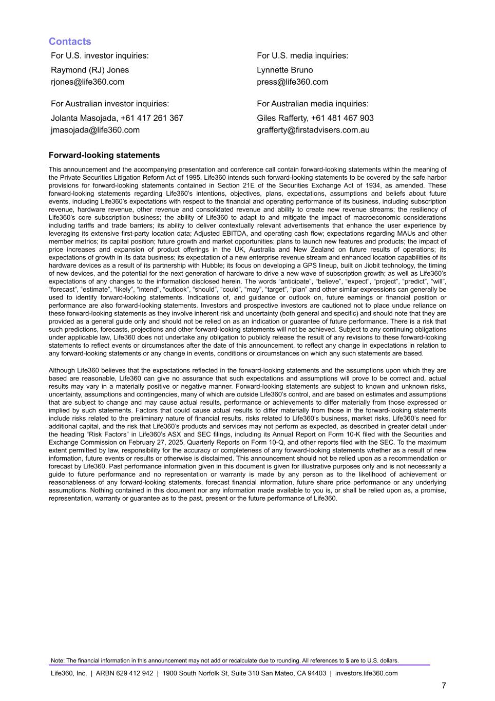 Investor Presentation | May 2025 DISCLAIMER These materials and the accompanying oral presentation have been prepared by Life360, Inc. (ARBN 629 412 942) (“Company”) on a confidential and non-reliance basis, and may not be reproduced in whole or in part, nor may any of its contents be disclosed, to any other person, without the prior written consent of the Company. These materials are for informational purposes only. This presentation contains summary information about the Company and its activities and is current as of the date of this presentation. This presentation does not purport to be all-inclusive or to contain all of the information you may desire. It should be read in conjunction with the Company’s periodic and continuous disclosure announcements filed with the Australian Securities Exchange and the U.S. Securities and Exchange Commission (“SEC”), available at www.asx.com.au and www.sec.gov, respectively. These materials do not constitute an offer, invitation, solicitation or recommendation with respect to the purchase or sale of any security in the Company or interest therein nor does it constitute financial product advice. These materials are not a prospectus, product disclosure statement or other offer document under Australian law or under any other law. These materials have not been filed, registered or approved by regulatory authorities in any jurisdiction. This communication is restricted by law; it is not intended for distribution to, or use by any person in, any jurisdiction where such distribution or use would be contrary to local law or regulation. The information contained in these materials is not intended to be relied upon as advice or a recommendation to investors and is not intended to form the basis of any investment decision in the Company’s securities. The information does not take into account the investment objectives, financial situation, taxation situation or needs of any particular investor. An investor must not act on the basis of any matter contained in these materials but must make its own assessment of the Company and conduct its own investigations and analysis. Investors should assess their own individual financial circumstances and consider talking to a financial adviser, professional adviser or consultant before making any investment decision. By reading these materials you agree to be bound by the limitations set out in these materials. No representation or warranty, express or implied, is made as to the accuracy, reliability, completeness or fairness of the information, opinions, forecasts, reports, estimates and conclusions contained in these materials. The Company does not undertake any obligation to provide any additional information nor update or revise the information in these materials nor correct any inaccuracies or omissions. To the maximum extent permitted by law, none of the Company and its related bodies corporate, or their respective directors, employees or agents, nor any other person accepts any responsibility nor any liability for loss arising from the use of or reliance on information contained in these materials or otherwise arising in connection with it, nor in relation to any other written or oral information or opinions provided now or in the future to the recipient or its advisers and representatives, including without limitation any liability from fault of negligence. Past performance is not indicative of future performance and no guarantee of future returns is implied or given. Nothing contained in these materials nor any information made available to you is, or shall be relied upon as, a promise, representation, warranty or guarantee as to the past, present or the future performance of the Company. Certain statements in these materials constitute forward-looking statements within the meaning of the Private Securities Litigation Reform Act of 1995 (“PLSRA”), Section 27A of the Securities Act of 1933, as amended, and Section 21E of the Securities Exchange Act of 1934, as amended (the “Exchange Act”). Statements that are not historical in nature, including the words “anticipate”, “expect”, “suggests”, “plan”, “believe”, “intend”, “estimates”, “targets”, “projects”, “should”, “could”, “would”, “may”, “will”, “forecast,” “opportunity,” “goal,” “vision,” “outlook” and other similar expressions are intended to identify forward-looking statements. These forward- looking statements include, but are not limited to, statements regarding: the Company’s growth strategy and business plan and the Company’s ability to effectively manage its growth and meet future capital requirements; the Company’s expectations regarding future financial performance, including its expectations regarding its revenue, revenue growth, adjusted EBITDA, and operating cash flow, and the Company’s ability to achieve or maintain future profitability; the Company’s ability to further penetrate its existing member base, maintain and expand its member base and increase monetization of its member base; the Company’s ability to expand internationally and the significance of its global opportunity; the Company’s ability to anticipate market needs or develop new products and services or enhance existing products and services to meet those needs; and the Company’s ability to increase sales of its products and services. Such forward-looking statements are prediction, projections and other statements about future events that are based on current expectations and assumptions and, as a result, involve known and unknown risks, uncertainties, assumptions and other important factors, many of which are beyond the control of the Company and which may cause actual results, performance or achievements to differ materially from those expressed or implied by such statements. Forward-looking statements are provided as a general guide only, and should not be relied on as an i