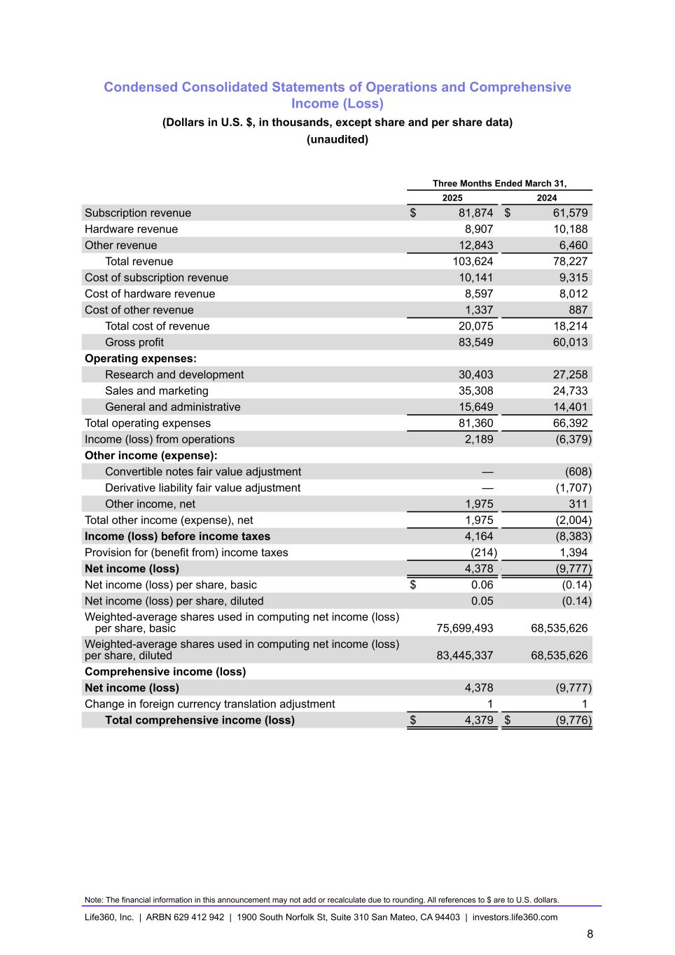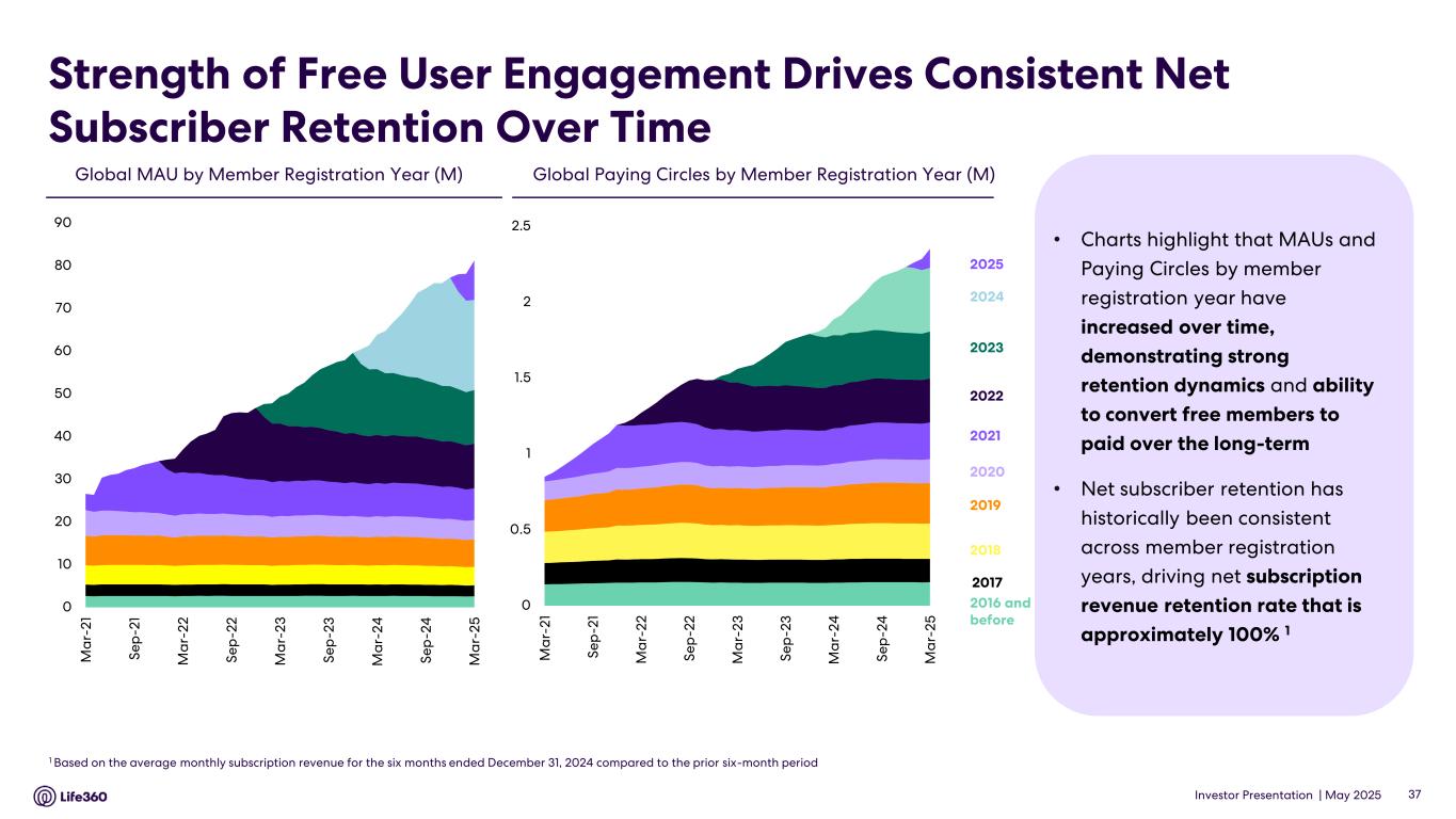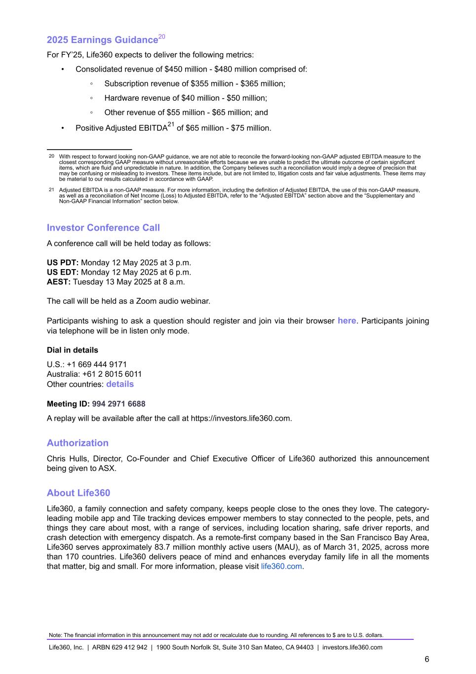 Investor Presentation | May 2025 DISCLAIMER These materials and the accompanying oral presentation have been prepared by Life360, Inc. (ARBN 629 412 942) (“Company”) on a confidential and non-reliance basis, and may not be reproduced in whole or in part, nor may any of its contents be disclosed, to any other person, without the prior written consent of the Company. These materials are for informational purposes only. This presentation contains summary information about the Company and its activities and is current as of the date of this presentation. This presentation does not purport to be all-inclusive or to contain all of the information you may desire. It should be read in conjunction with the Company’s periodic and continuous disclosure announcements filed with the Australian Securities Exchange and the U.S. Securities and Exchange Commission (“SEC”), available at www.asx.com.au and www.sec.gov, respectively. These materials do not constitute an offer, invitation, solicitation or recommendation with respect to the purchase or sale of any security in the Company or interest therein nor does it constitute financial product advice. These materials are not a prospectus, product disclosure statement or other offer document under Australian law or under any other law. These materials have not been filed, registered or approved by regulatory authorities in any jurisdiction. This communication is restricted by law; it is not intended for distribution to, or use by any person in, any jurisdiction where such distribution or use would be contrary to local law or regulation. The information contained in these materials is not intended to be relied upon as advice or a recommendation to investors and is not intended to form the basis of any investment decision in the Company’s securities. The information does not take into account the investment objectives, financial situation, taxation situation or needs of any particular investor. An investor must not act on the basis of any matter contained in these materials but must make its own assessment of the Company and conduct its own investigations and analysis. Investors should assess their own individual financial circumstances and consider talking to a financial adviser, professional adviser or consultant before making any investment decision. By reading these materials you agree to be bound by the limitations set out in these materials. No representation or warranty, express or implied, is made as to the accuracy, reliability, completeness or fairness of the information, opinions, forecasts, reports, estimates and conclusions contained in these materials. The Company does not undertake any obligation to provide any additional information nor update or revise the information in these materials nor correct any inaccuracies or omissions. To the maximum extent permitted by law, none of the Company and its related bodies corporate, or their respective directors, employees or agents, nor any other person accepts any responsibility nor any liability for loss arising from the use of or reliance on information contained in these materials or otherwise arising in connection with it, nor in relation to any other written or oral information or opinions provided now or in the future to the recipient or its advisers and representatives, including without limitation any liability from fault of negligence. Past performance is not indicative of future performance and no guarantee of future returns is implied or given. Nothing contained in these materials nor any information made available to you is, or shall be relied upon as, a promise, representation, warranty or guarantee as to the past, present or the future performance of the Company. Certain statements in these materials constitute forward-looking statements within the meaning of the Private Securities Litigation Reform Act of 1995 (“PLSRA”), Section 27A of the Securities Act of 1933, as amended, and Section 21E of the Securities Exchange Act of 1934, as amended (the “Exchange Act”). Statements that are not historical in nature, including the words “anticipate”, “expect”, “suggests”, “plan”, “believe”, “intend”, “estimates”, “targets”, “projects”, “should”, “could”, “would”, “may”, “will”, “forecast,” “opportunity,” “goal,” “vision,” “outlook” and other similar expressions are intended to identify forward-looking statements. These forward- looking statements include, but are not limited to, statements regarding: the Company’s growth strategy and business plan and the Company’s ability to effectively manage its growth and meet future capital requirements; the Company’s expectations regarding future financial performance, including its expectations regarding its revenue, revenue growth, adjusted EBITDA, and operating cash flow, and the Company’s ability to achieve or maintain future profitability; the Company’s ability to further penetrate its existing member base, maintain and expand its member base and increase monetization of its member base; the Company’s ability to expand internationally and the significance of its global opportunity; the Company’s ability to anticipate market needs or develop new products and services or enhance existing products and services to meet those needs; and the Company’s ability to increase sales of its products and services. Such forward-looking statements are prediction, projections and other statements about future events that are based on current expectations and assumptions and, as a result, involve known and unknown risks, uncertainties, assumptions and other important factors, many of which are beyond the control of the Company and which may cause actual results, performance or achievements to differ materially from those expressed or implied by such statements. Forward-looking statements are provided as a general guide only, and should not be relied on as an i