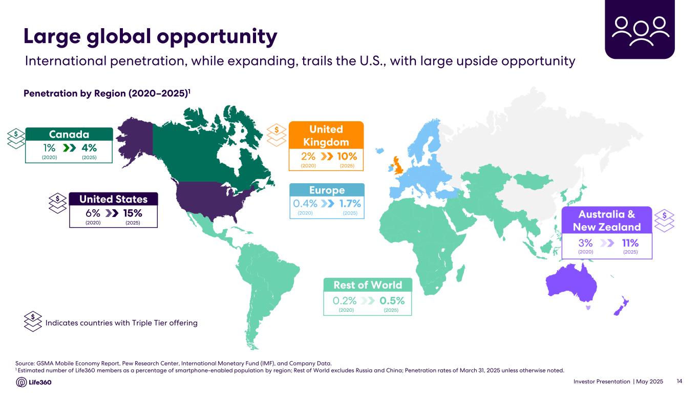 Investor Presentation | May 2025 Source: GSMA Mobile Economy Report, Pew Research Center, International Monetary Fund (IMF), and Company Data. 1 Estimated number of Life360 members as a percentage of smartphone-enabled population by region; Rest of World excludes Russia and China; Penetration rates of March 31, 2025 unless otherwise noted. Rest of World 0.5%0.2% (2020) (2025) Europe 1.7%0.4% (2020) (2025) International penetration, while expanding, trails the U.S., with large upside opportunity Large global opportunity Penetration by Region (2020–2025)1 14 $Australia & New Zealand 11%3% (2020) (2025) $ United Kingdom 10%2% (2020) (2025) $ Indicates countries with Triple Tier offering United States 15%6% (2020) (2025) $ Canada 4%1% (2020) (2025) $