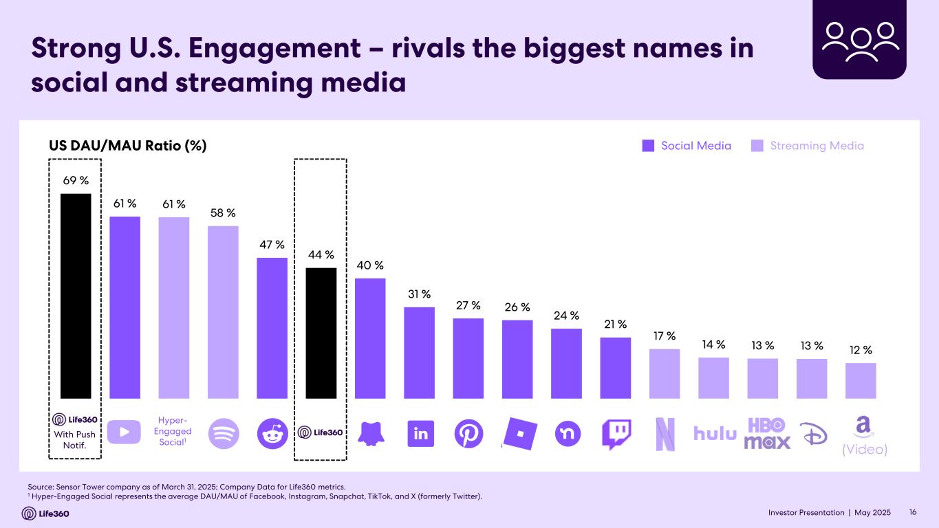 Investor Presentation | May 2025 Source: data.ai, a Sensor Tower company. Note: DAUs (Daily Active Users) defined as devices having 1 or more foreground sessions within an app in a day. 1 Life360 ranked 13th on iOS in the US by DAUs as of March 2025 on iPhone. 2 Life360 ranked 4th in the US in the social networking category on iOS by DAUs as of March 2025 on a unified basis. 15 One of the highest DAUs across all apps in the U.S. US iOS Social Networking App Rankings by DAU 2US iOS App Rankings by DAU 1 #13 #4