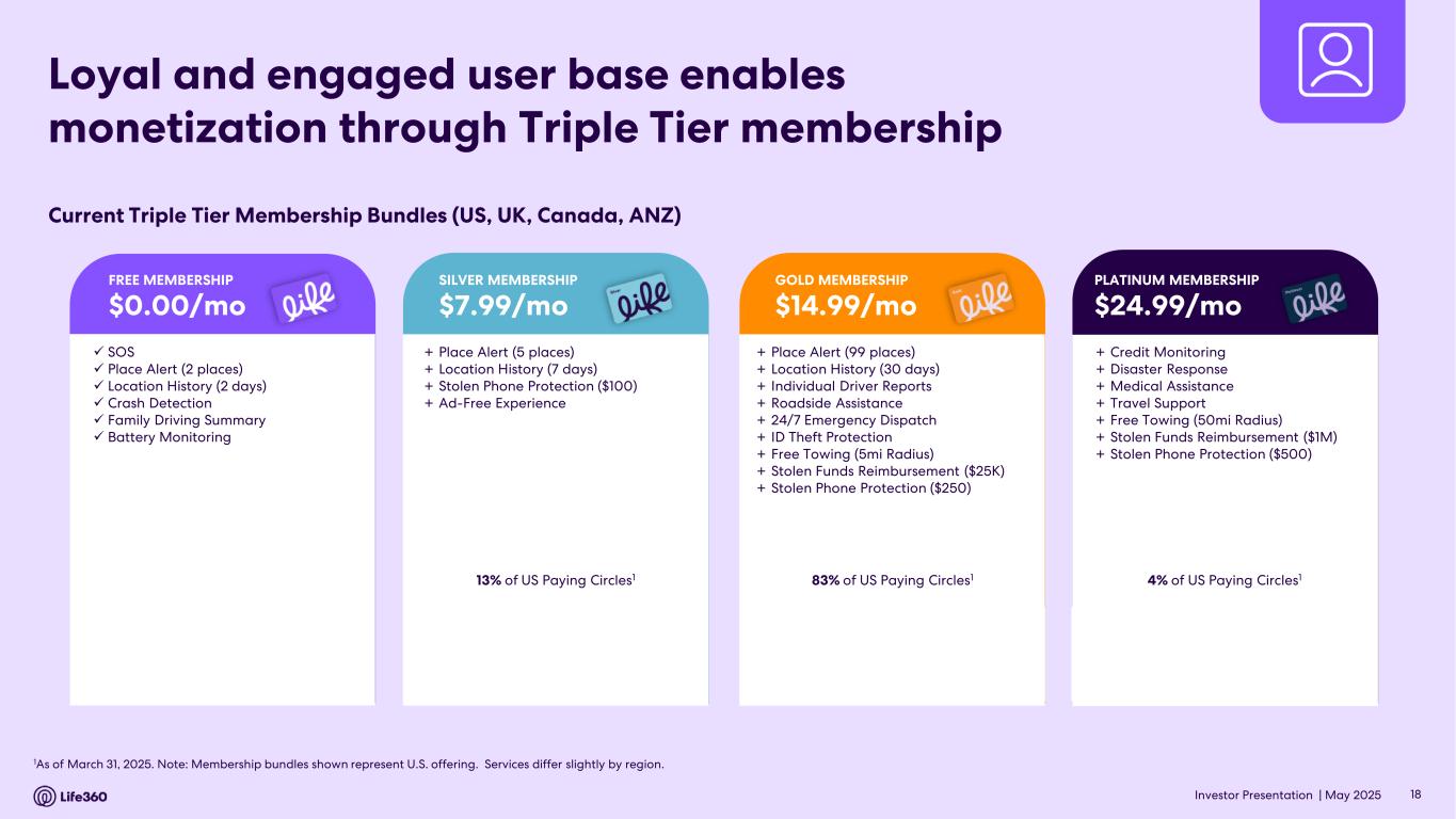Investor Presentation | May 2025 1As of March 31, 2025. Note: Membership bundles shown represent U.S. offering. Services differ slightly by region. Loyal and engaged user base enables monetization through Triple Tier membership Current Triple Tier Membership Bundles (US, UK, Canada, ANZ) + Place Alert (5 places) + Location History (7 days) + Stolen Phone Protection ($100) + Ad-Free Experience 13% of US Paying Circles1 SILVER MEMBERSHIP $7.99/mo + Place Alert (99 places) + Location History (30 days) + Individual Driver Reports + Roadside Assistance + 24/7 Emergency Dispatch + ID Theft Protection + Free Towing (5mi Radius) + Stolen Funds Reimbursement ($25K) + Stolen Phone Protection ($250) 83% of US Paying Circles1 GOLD MEMBERSHIP $14.99/mo + Credit Monitoring + Disaster Response + Medical Assistance + Travel Support + Free Towing (50mi Radius) + Stolen Funds Reimbursement ($1M) + Stolen Phone Protection ($500) 4% of US Paying Circles1 PLATINUM MEMBERSHIP $24.99/mo ✓ SOS ✓ Place Alert (2 places) ✓ Location History (2 days) ✓ Crash Detection ✓ Family Driving Summary ✓ Battery Monitoring FREE MEMBERSHIP $0.00/mo 18