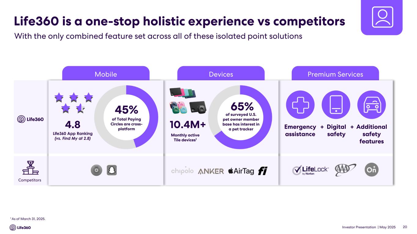 Investor Presentation | May 2025 Premium ServicesDevicesMobile Life360 is a one-stop holistic experience vs competitors With the only combined feature set across all of these isolated point solutions 1 As of March 31, 2025. 10.4M+ 65% of surveyed U.S. pet owner member base has interest in a pet tracker Monthly active Tile devices1 Emergency assistance Digital safety Additional safety features + +4.8 Life360 App Ranking (vs. Find My at 2.8) Competitors 20 45% of Total Paying Circles are cross- platform