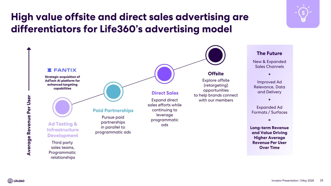 Investor Presentation | May 2025 High value offsite and direct sales advertising are differentiators for Life360’s advertising model 23 The Future New & Expanded Sales Channels + Improved Ad Relevance, Data and Delivery + Expanded Ad Formats / Surfaces = Long-term Revenue and Value Driving Higher Average Revenue Per User Over Time Third party sales teams, Programmatic relationships Ad Testing & Infrastructure Development Paid Partnerships Pursue paid partnerships in parallel to programmatic ads Direct Sales Expand direct sales efforts while continuing to leverage programmatic ads Offsite Explore offsite (retargeting) opportunities to help brands connect with our members A v e ra g e R e v e n u e P e r U se r Strategic acquisition of AdTech AI platform for enhanced targeting capabilities