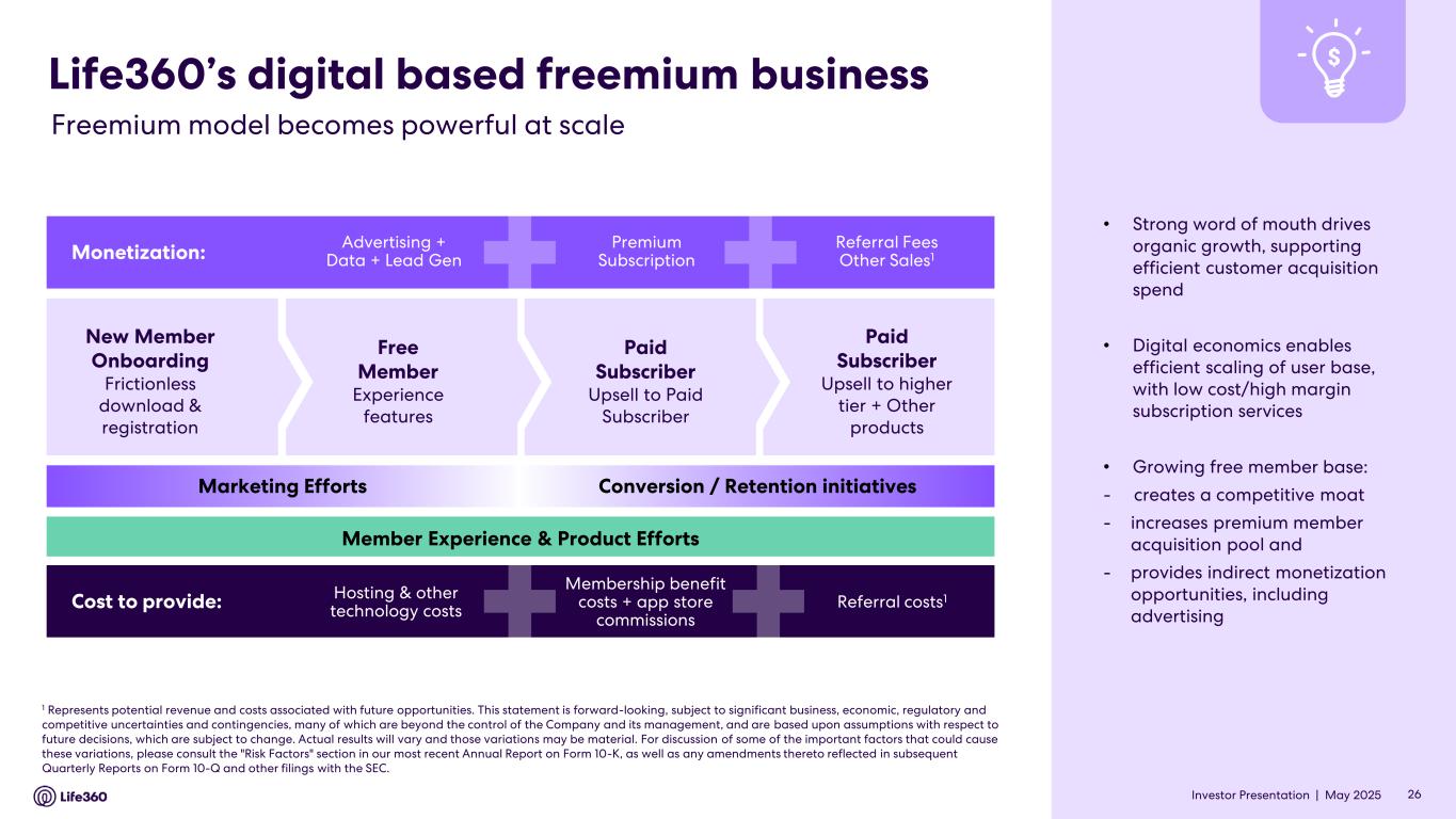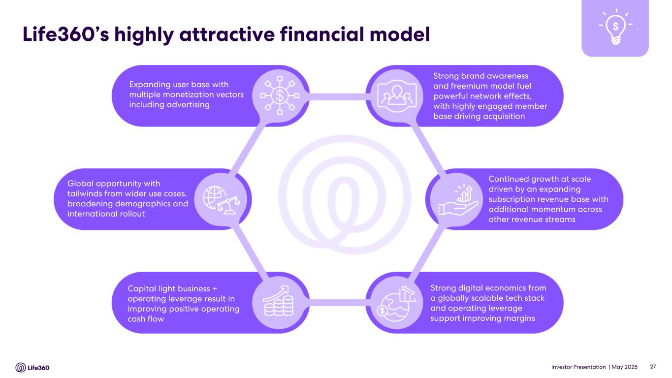 Investor Presentation | May 2025 New Member Onboarding Frictionless download & registration Free Member Experience features Paid Subscriber Upsell to Paid Subscriber Paid Subscriber Upsell to higher tier + Other products Life360’s digital based freemium business Monetization: Advertising + Data + Lead Gen Premium Subscription Referral Fees Other Sales1 Cost to provide: Hosting & other technology costs Membership benefit costs + app store commissions Referral costs1 Marketing Efforts Conversion / Retention initiatives Member Experience & Product Efforts 1 Represents potential revenue and costs associated with future opportunities. This statement is forward-looking, subject to significant business, economic, regulatory and competitive uncertainties and contingencies, many of which are beyond the control of the Company and its management, and are based upon assumptions with respect to future decisions, which are subject to change. Actual results will vary and those variations may be material. For discussion of some of the important factors that could cause these variations, please consult the "Risk Factors" section in our most recent Annual Report on Form 10-K, as well as any amendments thereto reflected in subsequent Quarterly Reports on Form 10-Q and other filings with the SEC. 26 Freemium model becomes powerful at scale • Strong word of mouth drives organic growth, supporting efficient customer acquisition spend • Digital economics enables efficient scaling of user base, with low cost/high margin subscription services • Growing free member base: - creates a competitive moat - increases premium member acquisition pool and - provides indirect monetization opportunities, including advertising Investor Presentation |