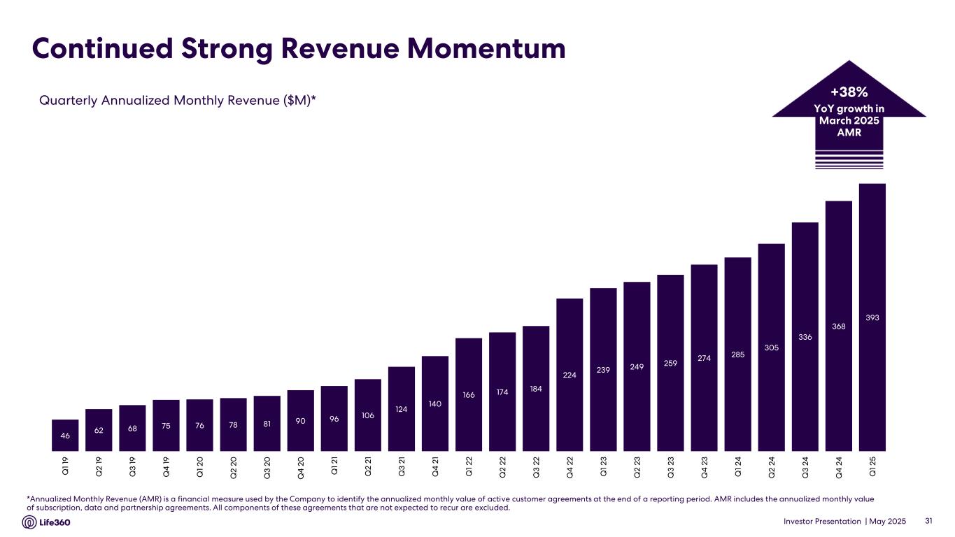 Investor Presentation | May 2025 • Continued strong subscription revenue momentum, up 33% including hardware subscriptions, and 37% for Life360 subscriptions • Hardware revenue decrease of 13%, primarily driven by a reduction in bundled offerings and an increase in discounts • Other revenue increase of 99% due to increases in data and partnership revenue, which includes advertising revenue • Annualized Monthly Revenue up 38% to $393.0 million • Operating expenses increased 23%, demonstrating strong operating leverage given the revenue uplift of 32% • Adjusted EBITDA expansion driven by strong subscription revenue growth and increased operating leverage $M Q1’25 Q1’24 $ Change % ch YoY Revenue Subscription 81.9 61.6 20.3 33 % Hardware 8.9 10.2 (1.3) (13)% Other 12.8 6.5 6.4 99 % Total revenue 103.6 78.2 25.4 32 % Annualized Monthly Revenue (AMR)1 393.0 284.7 108.3 38 % Operating expenses 81.4 66.4 15.0 23 % Net Income (Loss) 4.4 (9.8) 14.2 Adjusted EBITDA (Non-GAAP) 2 15.9 4.3 11.7 272 % Cash and cash equivalents3 170.4 74.6 95.8 128 % Operating cash flow 12.1 10.7 1.4 13 % Note: Numbers may not add or recalculate due to rounding. 1AMR includes the annualized monthly value of subscription, data and partnership agreements. All components of these agreements that are not expected to recur are excluded. 2 Adjusted EBITDA is a non-GAAP measure. For more information, including the definition of Adjusted EBITDA, the use of this non-GAAP measure, as well as a reconciliation of Net Income (Loss) to Adjusted EBITDA see Appendix 3. 3 Cash and cash equivalents includes Restricted Cash. Q1’25 Results Summary CommentaryDelivering on growth 30Investor Presentation |