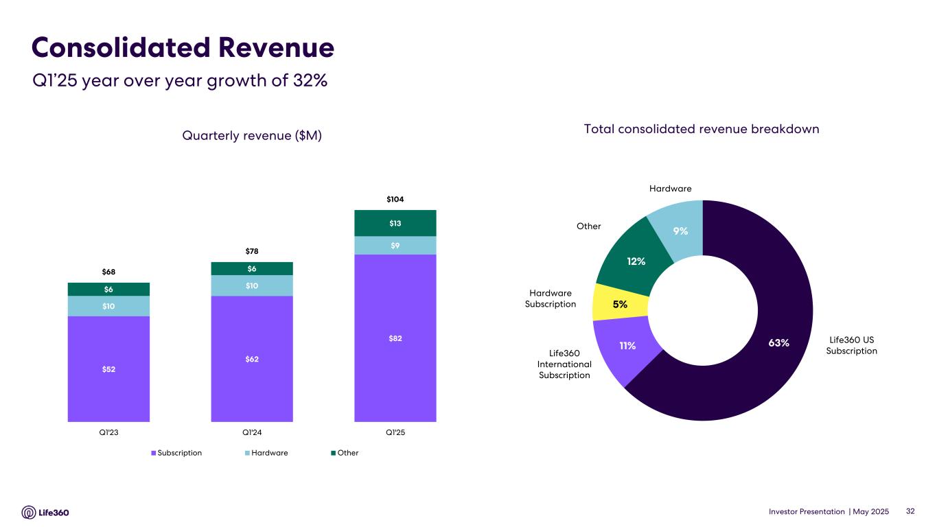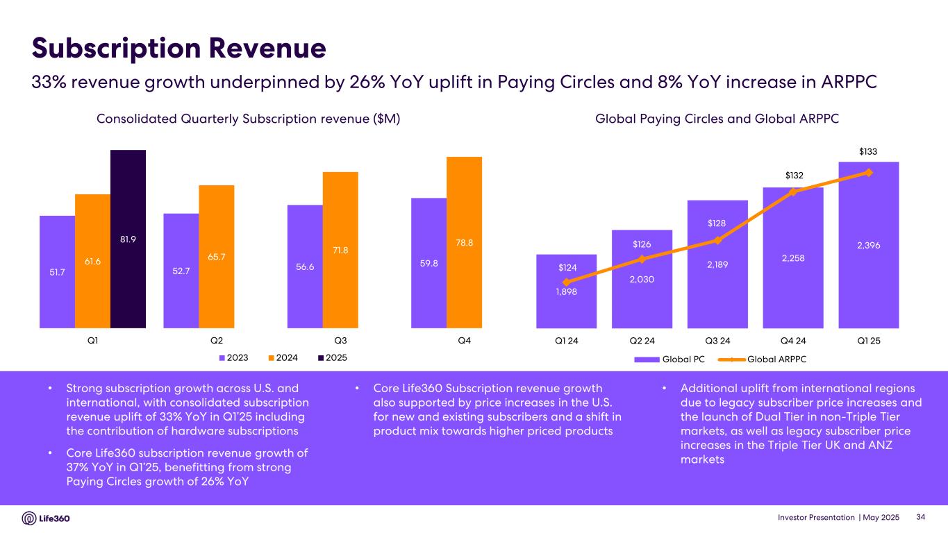 Investor Presentation | May 2025 Consolidated Revenue 32 Quarterly revenue ($M) Total consolidated revenue breakdown Hardware Life360 US SubscriptionLife360 International Subscription Hardware Subscription Other Q1’25 year over year growth of 32% $52 $62 $82 $10 $10 $9 $6 $6 $13 $68 $78 $104 Q1'23 Q1'24 Q1'25 Subscription Hardware Other 63%11% 5% 12% 9% *Includes non-recurring adjustment of approximately $0.9 million in relation to deferral of subscription revenue