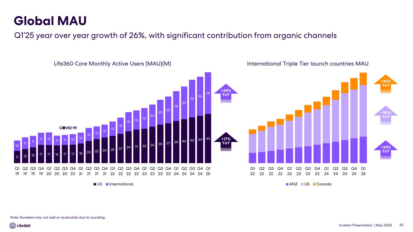 Investor Presentation | May 2025 Life360 Core Monthly Active Users (MAU)(M) Note: Numbers may not add or recalculate due to rounding. Global MAU Q1’25 year over year growth of 26%, with significant contribution from organic channels International Triple Tier launch countries MAU +35% YoY +45% YoY +33% YoY +39% YoY +17% YoY Q1 22 Q2 22 Q3 22 Q4 22 Q1 23 Q2 23 Q3 23 Q4 23 Q1 24 Q2 24 Q3 24 Q4 24 Q1 25 ANZ UK Canada 11 13 15 17 17 16 17 17 18 20 22 24 25 27 29 31 32 34 35 37 39 40 42 44 45 10 11 11 11 12 9 9 10 10 12 12 12 13 15 18 18 19 20 23 25 28 30 35 36 38 Q1 19 Q2 19 Q3 19 Q4 19 Q1 20 Q2 20 Q3 20 Q4 20 Q1 21 Q2 21 Q3 21 Q4 21 Q1 22 Q2 22 Q3 22 Q4 22 Q1 23 Q2 23 Q3 23 Q4 23 Q1 24 Q2 24 Q3 24 Q4 24 Q1 25 US International 33