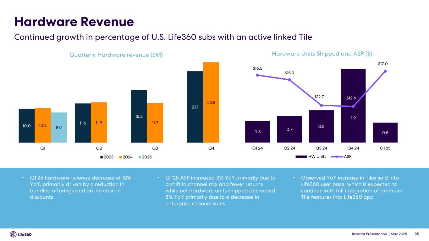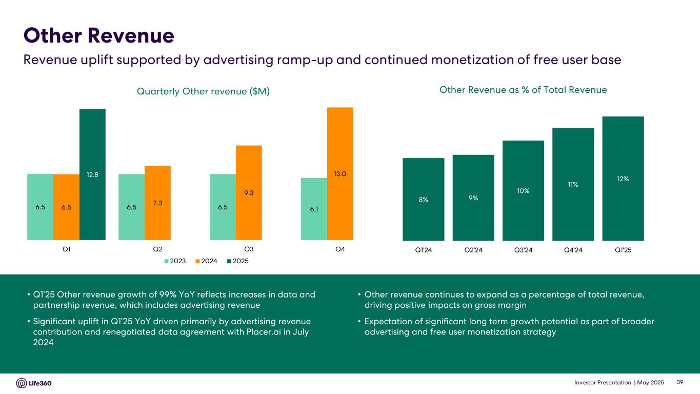 Investor Presentation | May 2025 Hardware Revenue Quarterly Hardware revenue ($M) 38 • Q1’25 hardware revenue decrease of 13% YoY, primarily driven by a reduction in bundled offerings and an increase in discounts • Q1’25 ASP increased 3% YoY primarily due to a shift in channel mix and fewer returns while net hardware units shipped decreased 8% YoY primarily due to a decrease in enterprise channel sales • Observed YoY increase in Tiles sold into Life360 user base, which is expected to continue with full integration of premium Tile features into Life360 app Hardware Units Shipped and ASP ($) 10.0 11.6 15.5 21.1 10.2 11.9 11.7 23.8 8.9 Q1 Q2 Q3 Q4 2023 2024 2025 Continued growth in percentage of U.S. Life360 subs with an active linked Tile 0.5 0.7 0.8 1.9 0.5 $16.5 $15.9 $12.7 $12.6 $17.0 8.00 9.00 10.00 11.00 12.00 13.00 14.00 15.00 16.00 17.00 18.00 0.00 0.20 0.40 0.60 0.80 1.00 1.20 1.40 1.60 1.80 2.00 Q1 24 Q2 24 Q3 24 Q4 24 Q1 25 HW Units ASP