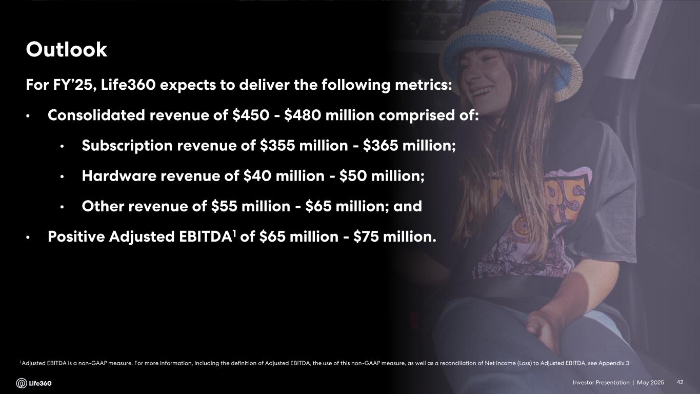Investor Presentation | May 2025 1 Adjusted EBITDA is a non-GAAP measure. For more information, including the definition of Adjusted EBITDA, the use of this non-GAAP measure, as well as a reconciliation of Net Income (Loss) to Adjusted EBITDA, see Appendix 3 Outlook 42 For FY’25, Life360 expects to deliver the following metrics: • Consolidated revenue of $450 - $480 million comprised of: • Subscription revenue of $355 million - $365 million; • Hardware revenue of $40 million - $50 million; • Other revenue of $55 million - $65 million; and • Positive Adjusted EBITDA1 of $65 million - $75 million. Investor Presentation |