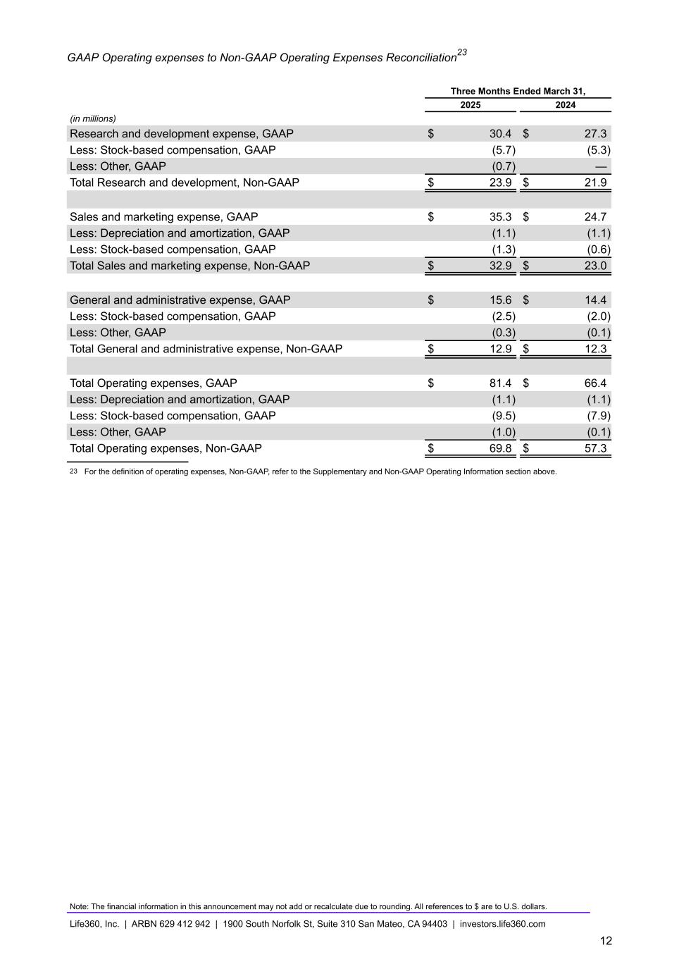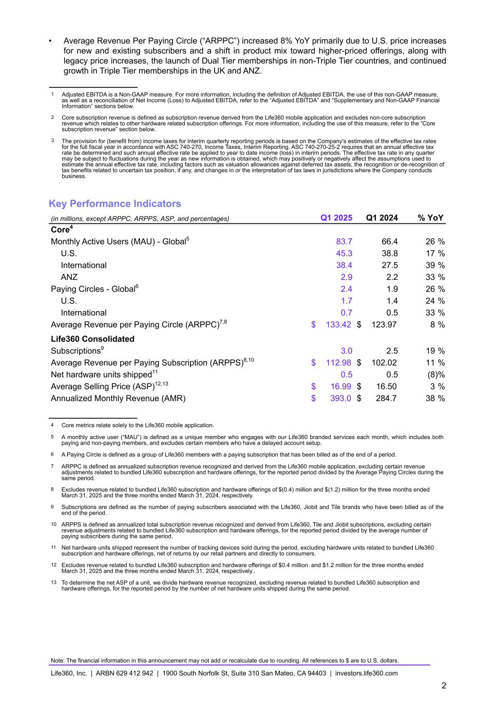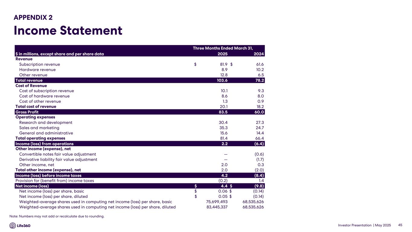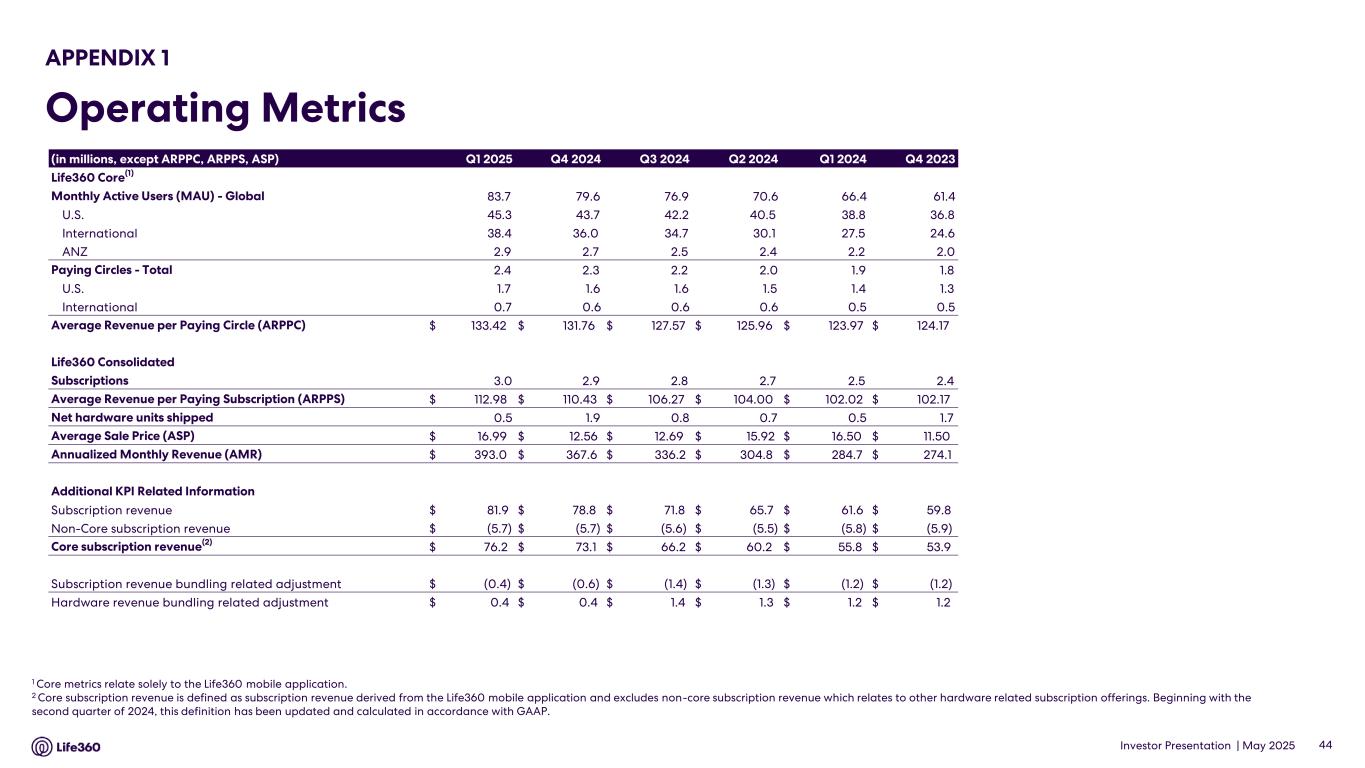 Investor Presentation | May 2025 APPENDIX 1 Operating Metrics 1 Core metrics relate solely to the Life360 mobile application. 2 Core subscription revenue is defined as subscription revenue derived from the Life360 mobile application and excludes non-core subscription revenue which relates to other hardware related subscription offerings. Beginning with the second quarter of 2024, this definition has been updated and calculated in accordance with GAAP. 44 (in millions, except ARPPC, ARPPS, ASP) Q1 2025 Q4 2024 Q3 2024 Q2 2024 Q1 2024 Q4 2023 Life360 Core(1) Monthly Active Users (MAU) - Global 83.7 79.6 76.9 70.6 66.4 61.4 U.S. 45.3 43.7 42.2 40.5 38.8 36.8 International 38.4 36.0 34.7 30.1 27.5 24.6 ANZ 2.9 2.7 2.5 2.4 2.2 2.0 Paying Circles - Total 2.4 2.3 2.2 2.0 1.9 1.8 U.S. 1.7 1.6 1.6 1.5 1.4 1.3 International 0.7 0.6 0.6 0.6 0.5 0.5 Average Revenue per Paying Circle (ARPPC) $ 133.42 $ 131.76 $ 127.57 $ 125.96 $ 123.97 $ 124.17 Life360 Consolidated Subscriptions 3.0 2.9 2.8 2.7 2.5 2.4 Average Revenue per Paying Subscription (ARPPS) $ 112.98 $ 110.43 $ 106.27 $ 104.00 $ 102.02 $ 102.17 Net hardware units shipped 0.5 1.9 0.8 0.7 0.5 1.7 Average Sale Price (ASP) $ 16.99 $ 12.56 $ 12.69 $ 15.92 $ 16.50 $ 11.50 Annualized Monthly Revenue (AMR) $ 393.0 $ 367.6 $ 336.2 $ 304.8 $ 284.7 $ 274.1 Additional KPI Related Information Subscription revenue $ 81.9 $ 78.8 $ 71.8 $ 65.7 $ 61.6 $ 59.8 Non-Core subscription revenue $ (5.7) $ (5.7) $ (5.6) $ (5.5) $ (5.8) $ (5.9) Core subscription revenue(2) $ 76.2 $ 73.1 $ 66.2 $ 60.2 $ 55.8 $ 53.9 Subscription revenue bundling related adjustment $ (0.4) $ (0.6) $ (1.4) $ (1.3) $ (1.2) $ (1.2) Hardware revenue bundling related adjustment $ 0.4 $ 0.4 $ 1.4 $ 1.3 $ 1.2 $ 1.2