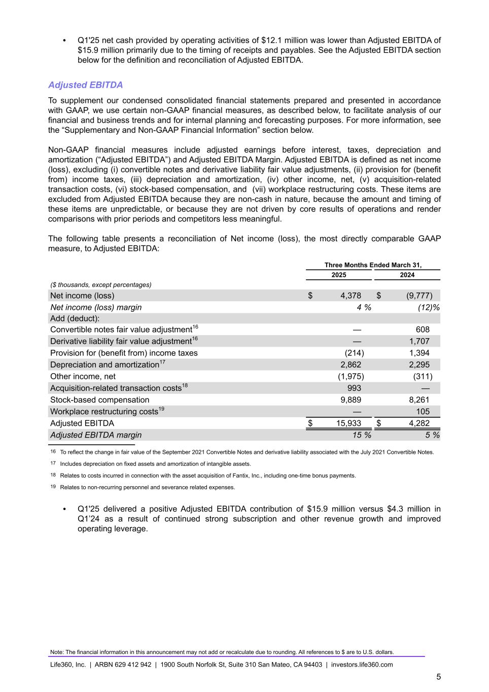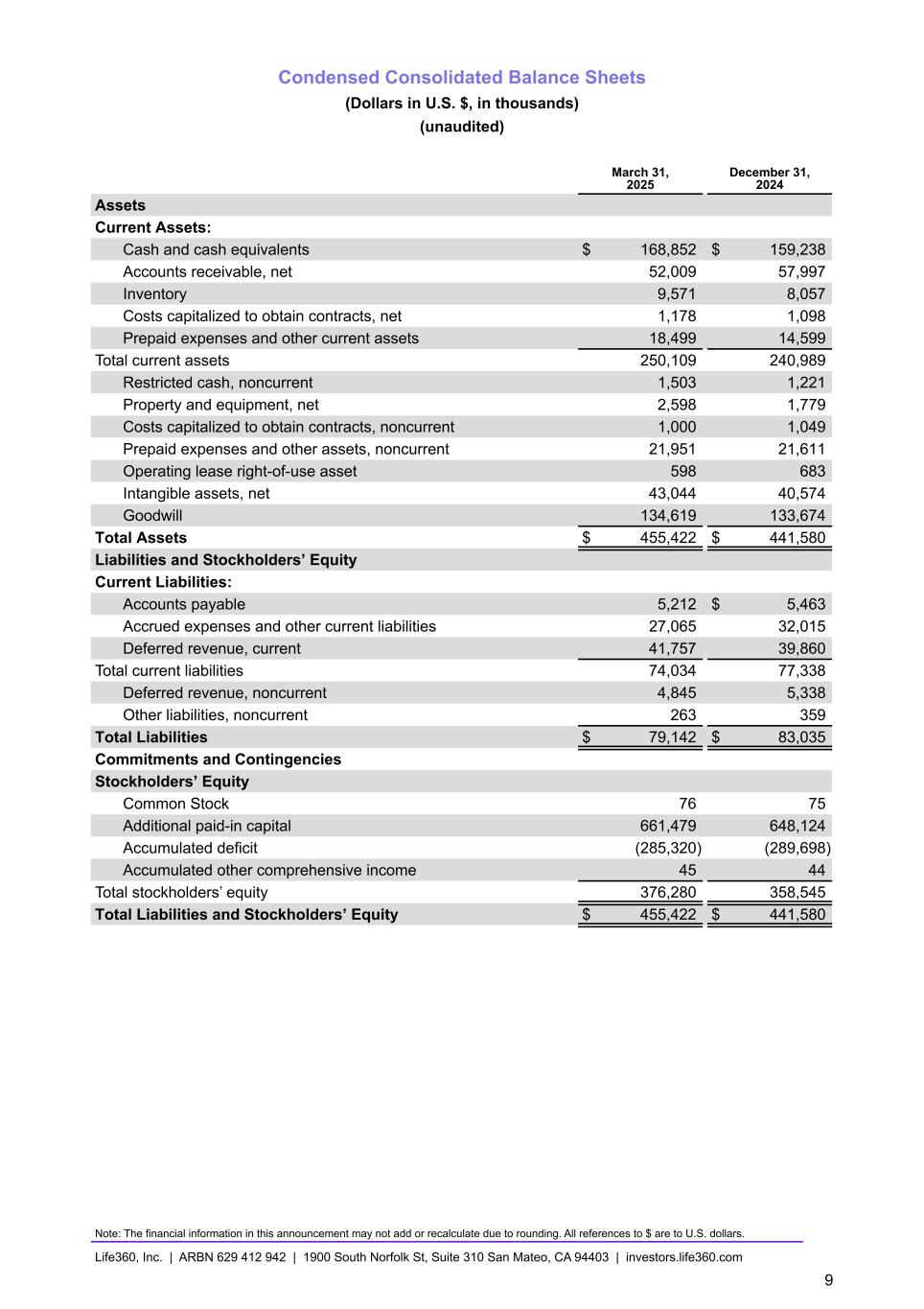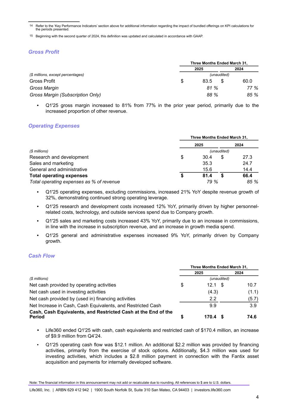 Investor Presentation | May 2025 APPENDIX 1 Operating Metrics 1 Core metrics relate solely to the Life360 mobile application. 2 Core subscription revenue is defined as subscription revenue derived from the Life360 mobile application and excludes non-core subscription revenue which relates to other hardware related subscription offerings. Beginning with the second quarter of 2024, this definition has been updated and calculated in accordance with GAAP. 44 (in millions, except ARPPC, ARPPS, ASP) Q1 2025 Q4 2024 Q3 2024 Q2 2024 Q1 2024 Q4 2023 Life360 Core(1) Monthly Active Users (MAU) - Global 83.7 79.6 76.9 70.6 66.4 61.4 U.S. 45.3 43.7 42.2 40.5 38.8 36.8 International 38.4 36.0 34.7 30.1 27.5 24.6 ANZ 2.9 2.7 2.5 2.4 2.2 2.0 Paying Circles - Total 2.4 2.3 2.2 2.0 1.9 1.8 U.S. 1.7 1.6 1.6 1.5 1.4 1.3 International 0.7 0.6 0.6 0.6 0.5 0.5 Average Revenue per Paying Circle (ARPPC) $ 133.42 $ 131.76 $ 127.57 $ 125.96 $ 123.97 $ 124.17 Life360 Consolidated Subscriptions 3.0 2.9 2.8 2.7 2.5 2.4 Average Revenue per Paying Subscription (ARPPS) $ 112.98 $ 110.43 $ 106.27 $ 104.00 $ 102.02 $ 102.17 Net hardware units shipped 0.5 1.9 0.8 0.7 0.5 1.7 Average Sale Price (ASP) $ 16.99 $ 12.56 $ 12.69 $ 15.92 $ 16.50 $ 11.50 Annualized Monthly Revenue (AMR) $ 393.0 $ 367.6 $ 336.2 $ 304.8 $ 284.7 $ 274.1 Additional KPI Related Information Subscription revenue $ 81.9 $ 78.8 $ 71.8 $ 65.7 $ 61.6 $ 59.8 Non-Core subscription revenue $ (5.7) $ (5.7) $ (5.6) $ (5.5) $ (5.8) $ (5.9) Core subscription revenue(2) $ 76.2 $ 73.1 $ 66.2 $ 60.2 $ 55.8 $ 53.9 Subscription revenue bundling related adjustment $ (0.4) $ (0.6) $ (1.4) $ (1.3) $ (1.2) $ (1.2) Hardware revenue bundling related adjustment $ 0.4 $ 0.4 $ 1.4 $ 1.3 $ 1.2 $ 1.2