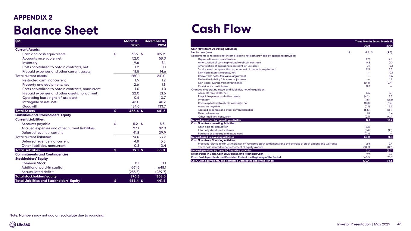 Investor Presentation | May 2025 APPENDIX 2 Income Statement 45 Note: Numbers may not add or recalculate due to rounding. Three Months Ended March 31, Three Months Ended March 31, $ in millions, except share and per share data 2025 2024 Revenue Subscription revenue $ 81.9 $ 61.6 Hardware revenue 8.9 10.2 Other revenue 12.8 6.5 Total revenue 103.6 78.2 Cost of Revenue Cost of subscription revenue 10.1 9.3 Cost of hardware revenue 8.6 8.0 Cost of other revenue 1.3 0.9 Total cost of revenue 20.1 18.2 Gross Profit 83.5 60.0 Operating expenses Research and development 30.4 27.3 Sales and marketing 35.3 24.7 General and administrative 15.6 14.4 Total operating expenses 81.4 66.4 Income (loss) from operations 2.2 (6.4) Other income (expense), net Convertible notes fair value adjustment — (0.6) Derivative liability fair value adjustment — (1.7) Other income, net 2.0 0.3 Total other income (expense), net 2.0 (2.0) Income (loss) before income taxes 4.2 (8.4) Provision for (benefit from) income taxes (0.2) 1.4 Net income (loss) $ 4.4 $ (9.8) Net income (loss) per share, basic $ 0.06 $ (0.14) Net income (loss) per share, diluted $ 0.05 $ (0.14) Weighted-average shares used in computing net income (loss) per share, basic 75,699,493 68,535,626 Weighted-average shares used in computing net income (loss) per share, diluted 83,445,337 68,535,626
