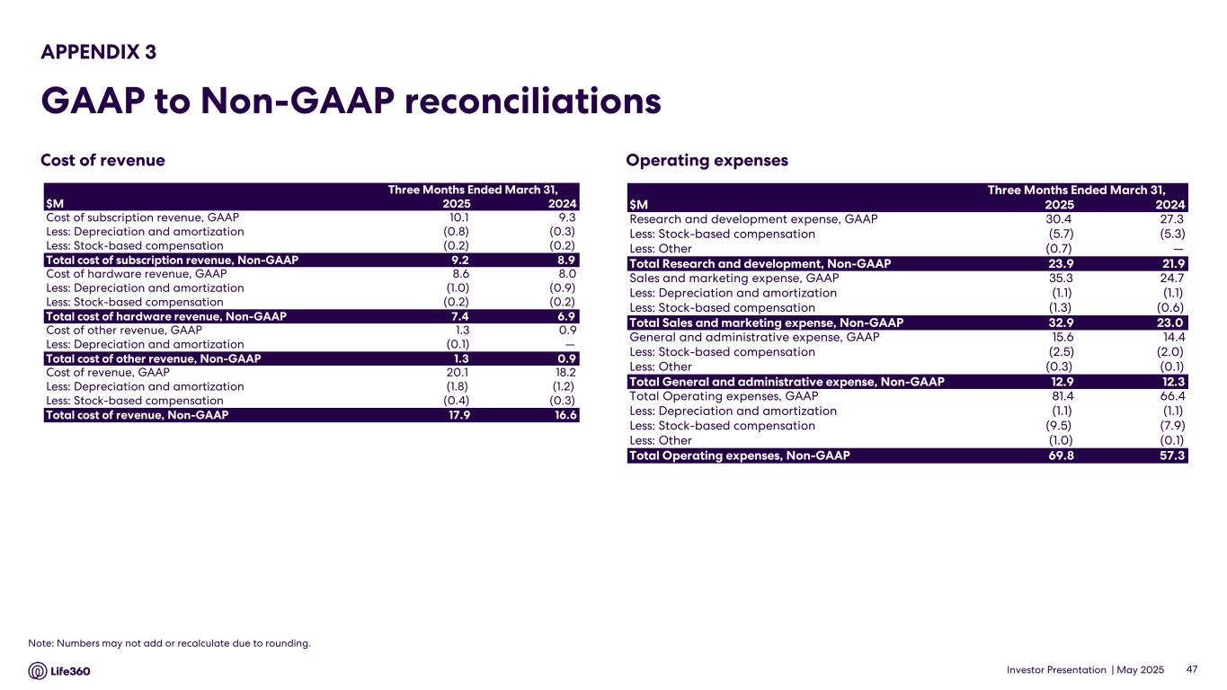 Investor Presentation | May 2025 Operating expenses APPENDIX 3 GAAP to Non-GAAP reconciliations 47 Note: Numbers may not add or recalculate due to rounding. Cost of revenue Three Months Ended March 31, Three Months Ended March 31, $M 2025 2024 Cost of subscription revenue, GAAP 10.1 9.3 Less: Depreciation and amortization (0.8) (0.3) Less: Stock-based compensation (0.2) (0.2) Total cost of subscription revenue, Non-GAAP 9.2 8.9 Cost of hardware revenue, GAAP 8.6 8.0 Less: Depreciation and amortization (1.0) (0.9) Less: Stock-based compensation (0.2) (0.2) Total cost of hardware revenue, Non-GAAP 7.4 6.9 Cost of other revenue, GAAP 1.3 0.9 Less: Depreciation and amortization (0.1) — Total cost of other revenue, Non-GAAP 1.3 0.9 Cost of revenue, GAAP 20.1 18.2 Less: Depreciation and amortization (1.8) (1.2) Less: Stock-based compensation (0.4) (0.3) Total cost of revenue, Non-GAAP 17.9 16.6 Three Months Ended March 31, Three Months Ended March 31, $M 2025 2024 Research and development expense, GAAP 30.4 27.3 Less: Stock-based compensation (5.7) (5.3) Less: Other (0.7) — Total Research and development, Non-GAAP 23.9 21.9 Sales and marketing expense, GAAP 35.3 24.7 Less: Depreciation and amortization (1.1) (1.1) Less: Stock-based compensation (1.3) (0.6) Total Sales and marketing expense, Non-GAAP 32.9 23.0 General and administrative expense, GAAP 15.6 14.4 Less: Stock-based compensation (2.5) (2.0) Less: Other (0.3) (0.1) Total General and administrative expense, Non-GAAP 12.9 12.3 Total Operating expenses, GAAP 81.4 66.4 Less: Depreciation and amortization (1.1) (1.1) Less: Stock-based compensation (9.5) (7.9) Less: Other (1.0) (0.1) Total Operating expenses, Non-GAAP 69.8 57.3