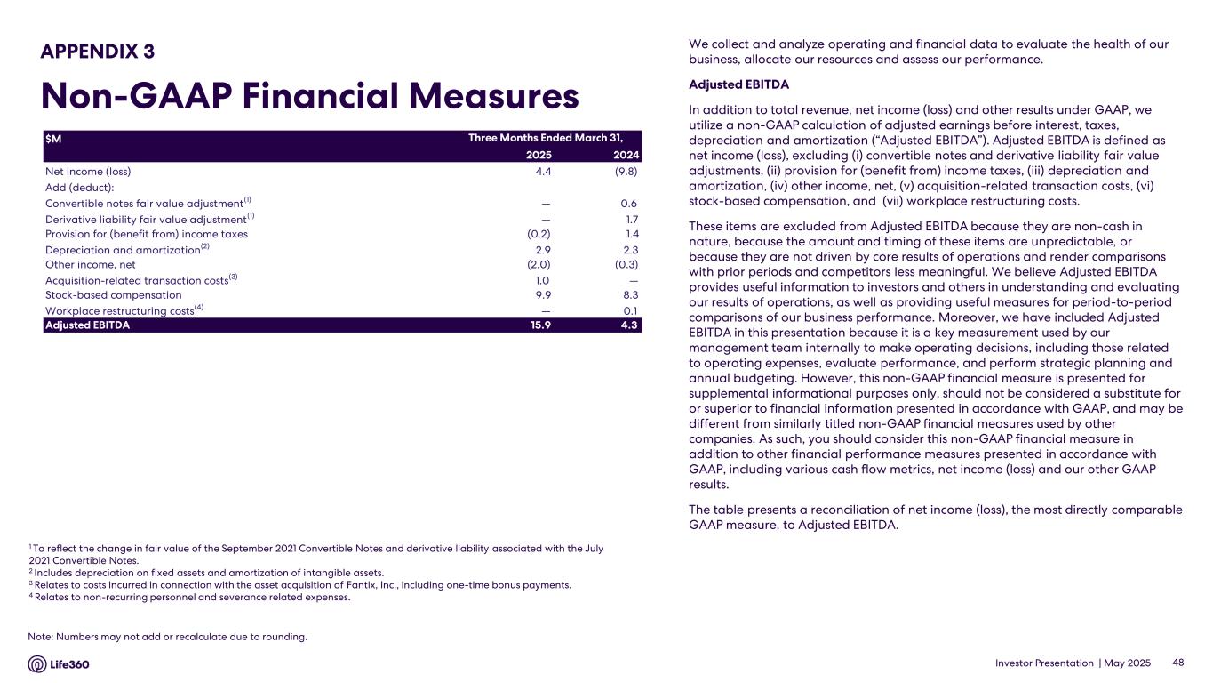 Investor Presentation | May 2025 We collect and analyze operating and financial data to evaluate the health of our business, allocate our resources and assess our performance. Adjusted EBITDA In addition to total revenue, net income (loss) and other results under GAAP, we utilize a non-GAAP calculation of adjusted earnings before interest, taxes, depreciation and amortization (“Adjusted EBITDA”). Adjusted EBITDA is defined as net income (loss), excluding (i) convertible notes and derivative liability fair value adjustments, (ii) provision for (benefit from) income taxes, (iii) depreciation and amortization, (iv) other income, net, (v) acquisition-related transaction costs, (vi) stock-based compensation, and (vii) workplace restructuring costs. These items are excluded from Adjusted EBITDA because they are non-cash in nature, because the amount and timing of these items are unpredictable, or because they are not driven by core results of operations and render comparisons with prior periods and competitors less meaningful. We believe Adjusted EBITDA provides useful information to investors and others in understanding and evaluating our results of operations, as well as providing useful measures for period-to-period comparisons of our business performance. Moreover, we have included Adjusted EBITDA in this presentation because it is a key measurement used by our management team internally to make operating decisions, including those related to operating expenses, evaluate performance, and perform strategic planning and annual budgeting. However, this non-GAAP financial measure is presented for supplemental informational purposes only, should not be considered a substitute for or superior to financial information presented in accordance with GAAP, and may be different from similarly titled non-GAAP financial measures used by other companies. As such, you should consider this non-GAAP financial measure in addition to other financial performance measures presented in accordance with GAAP, including various cash flow metrics, net income (loss) and our other GAAP results. The table presents a reconciliation of net income (loss), the most directly comparable GAAP measure, to Adjusted EBITDA. 1 To reflect the change in fair value of the September 2021 Convertible Notes and derivative liability associated with the July 2021 Convertible Notes. 2 Includes depreciation on fixed assets and amortization of intangible assets. 3 Relates to costs incurred in connection with the asset acquisition of Fantix, Inc., including one-time bonus payments. 4 Relates to non-recurring personnel and severance related expenses. 48 APPENDIX 3 Non-GAAP Financial Measures Note: Numbers may not add or recalculate due to rounding. $M 2025 2024 Net income (loss) 4.4 (9.8) Add (deduct): Convertible notes fair value adjustment(1) — 0.6 Derivative liability fair value adjustment(1) — 1.7 Provision for (benefit from) income taxes (0.2) 1.4 Depreciation and amortization(2) 2.9 2.3 Other income, net (2.0) (0.3) Acquisition-related transaction costs(3) 1.0 — Stock-based compensation 9.9 8.3 Workplace restructuring costs(4) — 0.1 Adjusted EBITDA 15.9 4.3 Three Months Ended March 31,