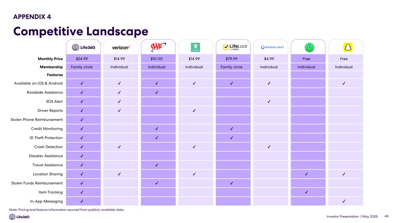 Investor Presentation | May 2025 49 Monthly Price $24.99 $14.99 $10.00 $14.99 $79.99 $4.99 Free Free Membership Family circle Individual Individual Individual Family circle Individual Individual Individual Features Available on iOS & Android Roadside Assistance SOS Alert Driver Reports Stolen Phone Reimbursement Credit Monitoring ID Theft Protection Crash Detection Disaster Assistance Travel Assistance Location Sharing Stolen Funds Reimbursement Item Tracking In-App Messaging Note: Pricing and feature information sourced from publicly available data. APPENDIX 4 Competitive Landscape