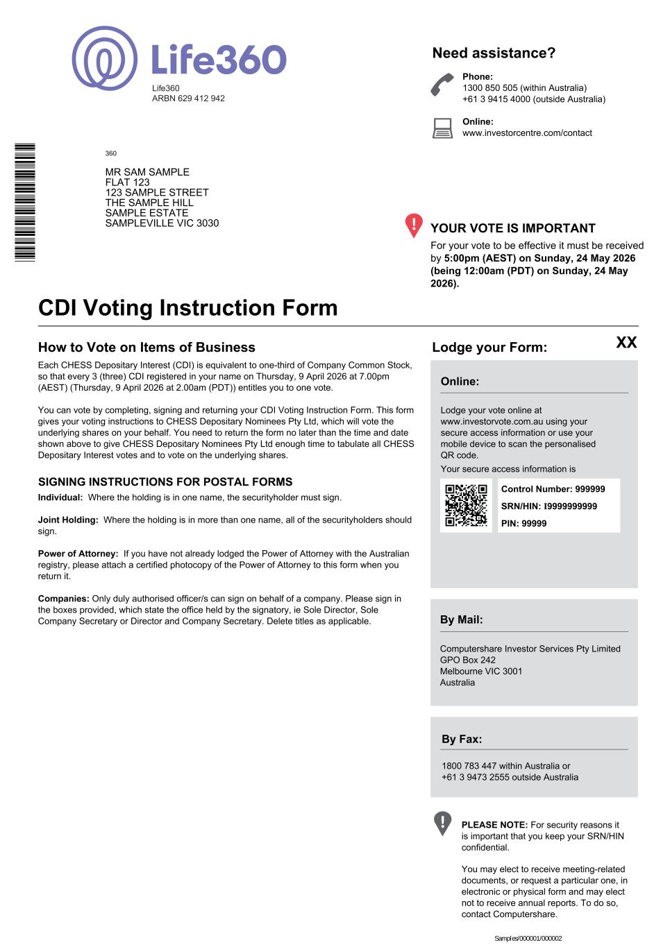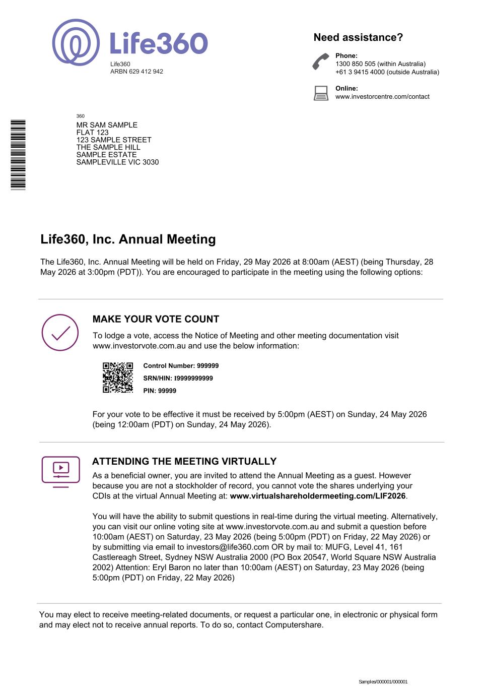 SRN/HIN: I9999999999 Phone: 1300 850 505 (within Australia) +61 3 9415 4000 (outside Australia) Online: www.investorcentre.com/contact Need assistance? Life360 ARBN 629 412 942 Life360, Inc. Annual Meeting Control Number: 999999 PIN: 99999 The Life360, Inc. Annual Meeting will be held on Friday, 29 May 2026 at 8:00am (AEST) (being Thursday, 28 May 2026 at 3:00pm (PDT)). You are encouraged to participate in the meeting using the following options: To lodge a vote, access the Notice of Meeting and other meeting documentation visit www.investorvote.com.au and use the below information: MAKE YOUR VOTE COUNT For your vote to be effective it must be received by 5:00pm (AEST) on Sunday, 24 May 2026 (being 12:00am (PDT) on Sunday, 24 May 2026). ATTENDING THE MEETING VIRTUALLY As a beneficial owner, you are invited to attend the Annual Meeting as a guest. However because you are not a stockholder of record, you cannot vote the shares underlying your CDIs at the virtual Annual Meeting at: www.virtualshareholdermeeting.com/LIF2026. You will have the ability to submit questions in real-time during the virtual meeting. Alternatively, you can visit our online voting site at www.investorvote.com.au and submit a question before 10:00am (AEST) on Saturday, 23 May 2026 (being 5:00pm (PDT) on Friday, 22 May 2026) or by submitting via email to investors@life360.com OR by mail to: MUFG, Level 41, 161 Castlereagh Street, Sydney NSW Australia 2000 (PO Box 20547, World Square NSW Australia 2002) Attention: Eryl Baron no later than 10:00am (AEST) on Saturday, 23 May 2026 (being 5:00pm (PDT) on Friday, 22 May 2026) You may elect to receive meeting-related documents, or request a particular one, in electronic or physical form and may elect not to receive annual reports. To do so, contact Computershare. 360 MR SAM SAMPLE FLAT 123 123 SAMPLE STREET THE SAMPLE HILL SAMPLE ESTATE SAMPLEVILLE VIC 3030 Samples/000001/000001 * L 0 0 0 0 0 1 *