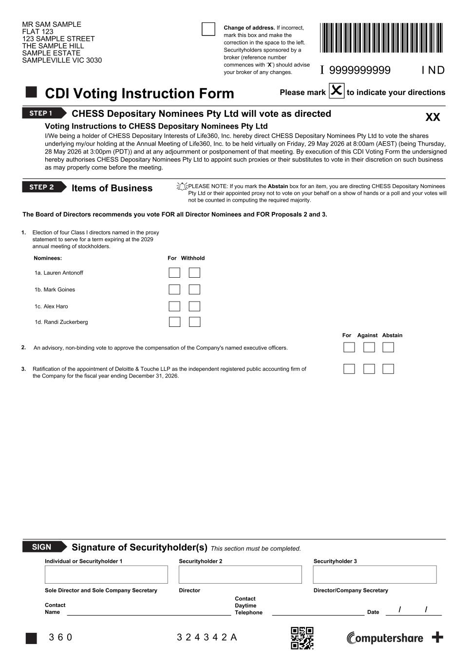 SRN/HIN: I9999999999 360 MR SAM SAMPLE FLAT 123 123 SAMPLE STREET THE SAMPLE HILL SAMPLE ESTATE SAMPLEVILLE VIC 3030 Life360 ARBN 629 412 942 Each CHESS Depositary Interest (CDI) is equivalent to one-third of Company Common Stock, so that every 3 (three) CDI registered in your name on Thursday, 9 April 2026 at 7.00pm (AEST) (Thursday, 9 April 2026 at 2.00am (PDT)) entitles you to one vote. You can vote by completing, signing and returning your CDI Voting Instruction Form. This form gives your voting instructions to CHESS Depositary Nominees Pty Ltd, which will vote the underlying shares on your behalf. You need to return the form no later than the time and date shown above to give CHESS Depositary Nominees Pty Ltd enough time to tabulate all CHESS Depositary Interest votes and to vote on the underlying shares. For your vote to be effective it must be received by 5:00pm (AEST) on Sunday, 24 May 2026 (being 12:00am (PDT) on Sunday, 24 May 2026). YOUR VOTE IS IMPORTANT Phone: 1300 850 505 (within Australia) +61 3 9415 4000 (outside Australia) Online: www.investorcentre.com/contact Need assistance? CDI Voting Instruction Form Lodge your Form: Online: Lodge your vote online at www.investorvote.com.au using your secure access information or use your mobile device to scan the personalised QR code. Your secure access information is By Mail: Computershare Investor Services Pty Limited GPO Box 242 Melbourne VIC 3001 Australia By Fax: 1800 783 447 within Australia or +61 3 9473 2555 outside Australia PLEASE NOTE: For security reasons it is important that you keep your SRN/HIN confidential. How to Vote on Items of Business SIGNING INSTRUCTIONS FOR POSTAL FORMS XX Control Number: 999999 PIN: 99999 Individual: Where the holding is in one name, the securityholder must sign. Joint Holding: Where the holding is in more than one name, all of the securityholders should sign. Power of Attorney: If you have not already lodged the Power of Attorney with the Australian registry, please attach a certified photocopy of the Power of Attorney to this form when you return it. Companies: Only duly authorised officer/s can sign on behalf of a company. Please sign in the boxes provided, which state the office held by the signatory, ie Sole Director, Sole Company Secretary or Director and Company Secretary. Delete titles as applicable. You may elect to receive meeting-related documents, or request a particular one, in electronic or physical form and may elect not to receive annual reports. To do so, contact Computershare. Samples/000001/000002 * I 0 0 0 0 0 1 3 6 *