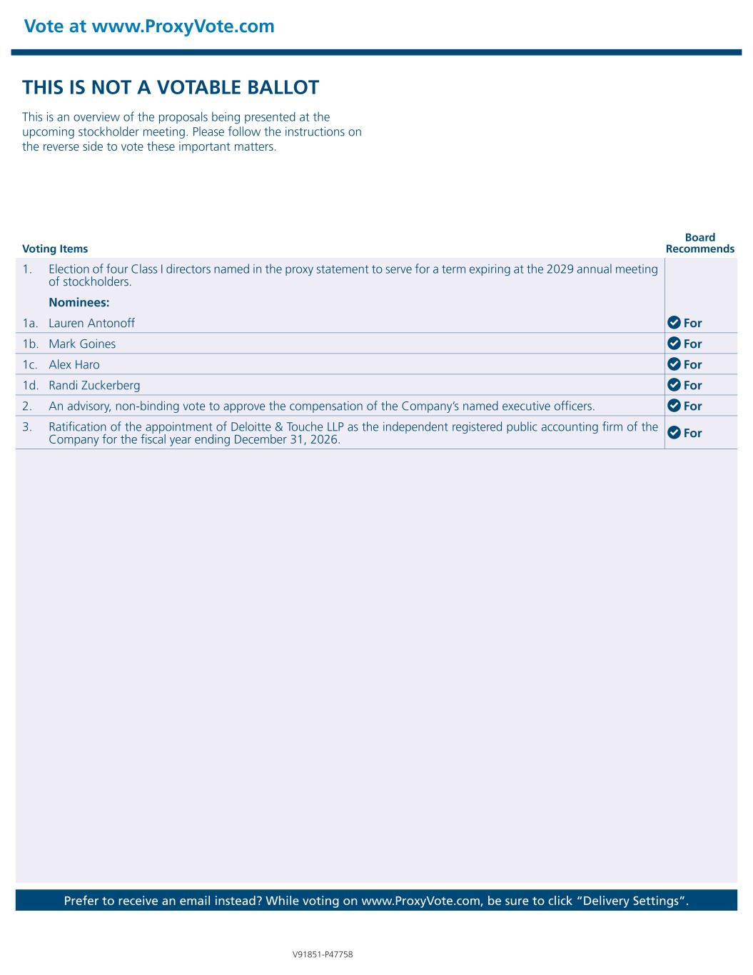 Vote at www.ProxyVote.com Prefer to receive an email instead? While voting on www.ProxyVote.com, be sure to click “Delivery Settings”. Voting Items Board Recommends V91851-P47758 THIS IS NOT A VOTABLE BALLOT This is an overview of the proposals being presented at the upcoming stockholder meeting. Please follow the instructions on the reverse side to vote these important matters. 1. Election of four Class I directors named in the proxy statement to serve for a term expiring at the 2029 annual meeting of stockholders. Nominees: 1a. Lauren Antonoff For 1b. Mark Goines For 1c. Alex Haro For 1d. Randi Zuckerberg For 2. An advisory, non-binding vote to approve the compensation of the Company’s named executive officers. For 3. Ratification of the appointment of Deloitte & Touche LLP as the independent registered public accounting firm of the Company for the fiscal year ending December 31, 2026. For