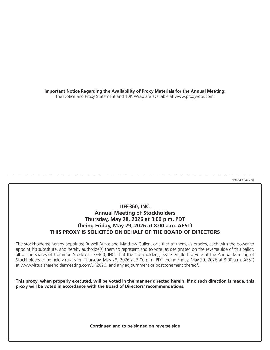 V91849-P47758 Important Notice Regarding the Availability of Proxy Materials for the Annual Meeting: The Notice and Proxy Statement and 10K Wrap are available at www.proxyvote.com. LIFE360, INC. Annual Meeting of Stockholders Thursday, May 28, 2026 at 3:00 p.m. PDT (being Friday, May 29, 2026 at 8:00 a.m. AEST) THIS PROXY IS SOLICITED ON BEHALF OF THE BOARD OF DIRECTORS The stockholder(s) hereby appoint(s) Russell Burke and Matthew Cullen, or either of them, as proxies, each with the power to appoint his substitute, and hereby authorize(s) them to represent and to vote, as designated on the reverse side of this ballot, all of the shares of Common Stock of LIFE360, INC. that the stockholder(s) is/are entitled to vote at the Annual Meeting of Stockholders to be held virtually on Thursday, May 28, 2026 at 3:00 p.m. PDT (being Friday, May 29, 2026 at 8:00 a.m. AEST) at www.virtualshareholdermeeting.com/LIF2026, and any adjournment or postponement thereof. This proxy, when properly executed, will be voted in the manner directed herein. If no such direction is made, this proxy will be voted in accordance with the Board of Directors' recommendations. Continued and to be signed on reverse side